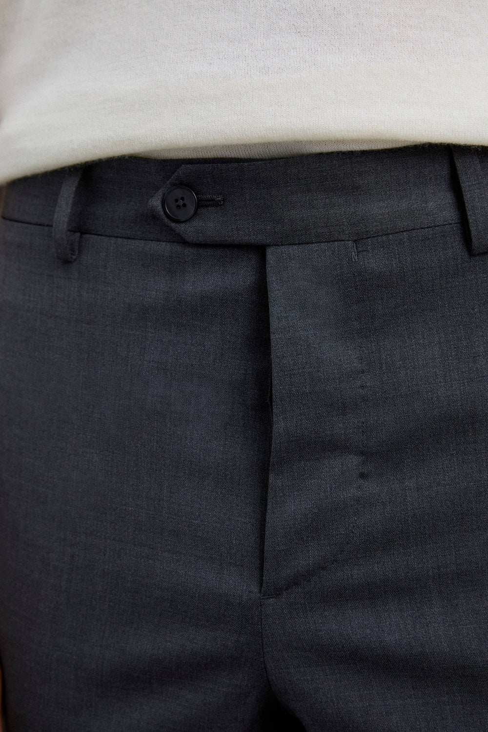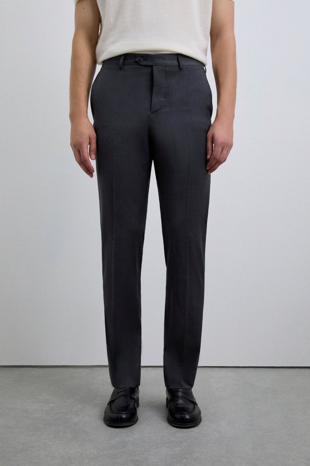 Calças formais com pinças confecionadas numa mistura de lã ligeiramente elástica. Corte regular, com zip oculto e botão na cintura prolongada com presilhas. Bolsos inclinados à frente e atrás de linhas vivas com botão.