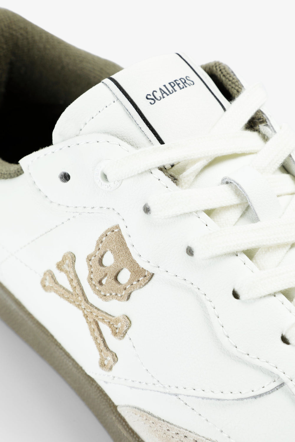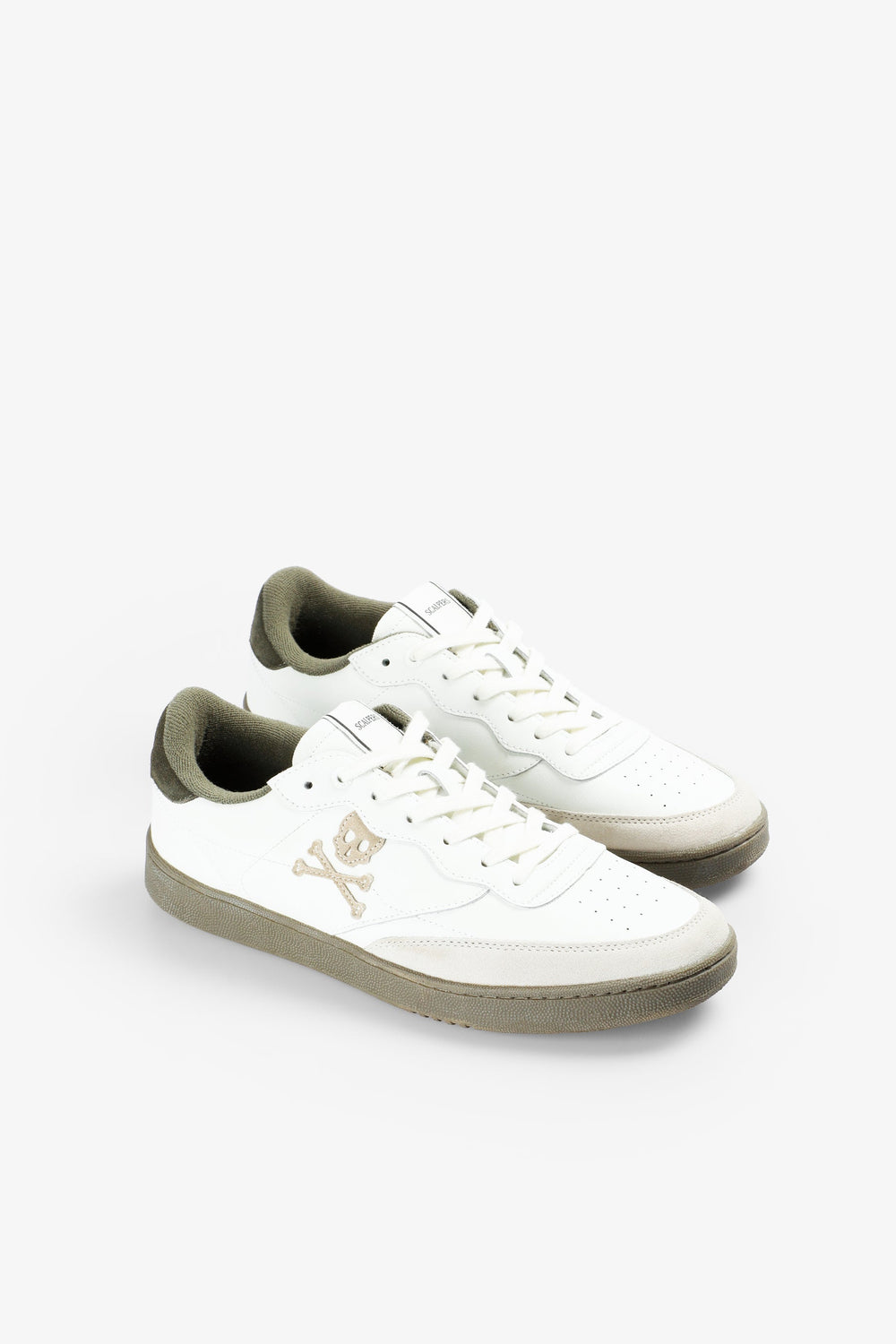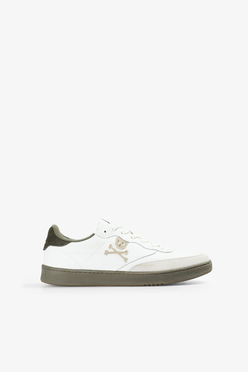 Sapatilhas com skull lateral em contraste confecionadas em pele. Fecho com cordões. Sola de TPR. Pormenor em contraste no calcanhar e pormenor de logótipo no tom. Etiqueta com logótipo na língua.