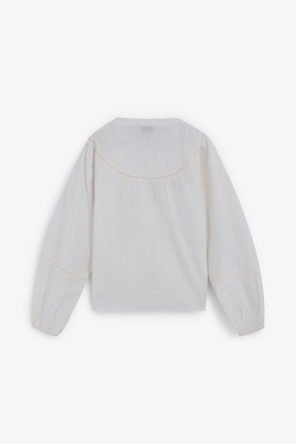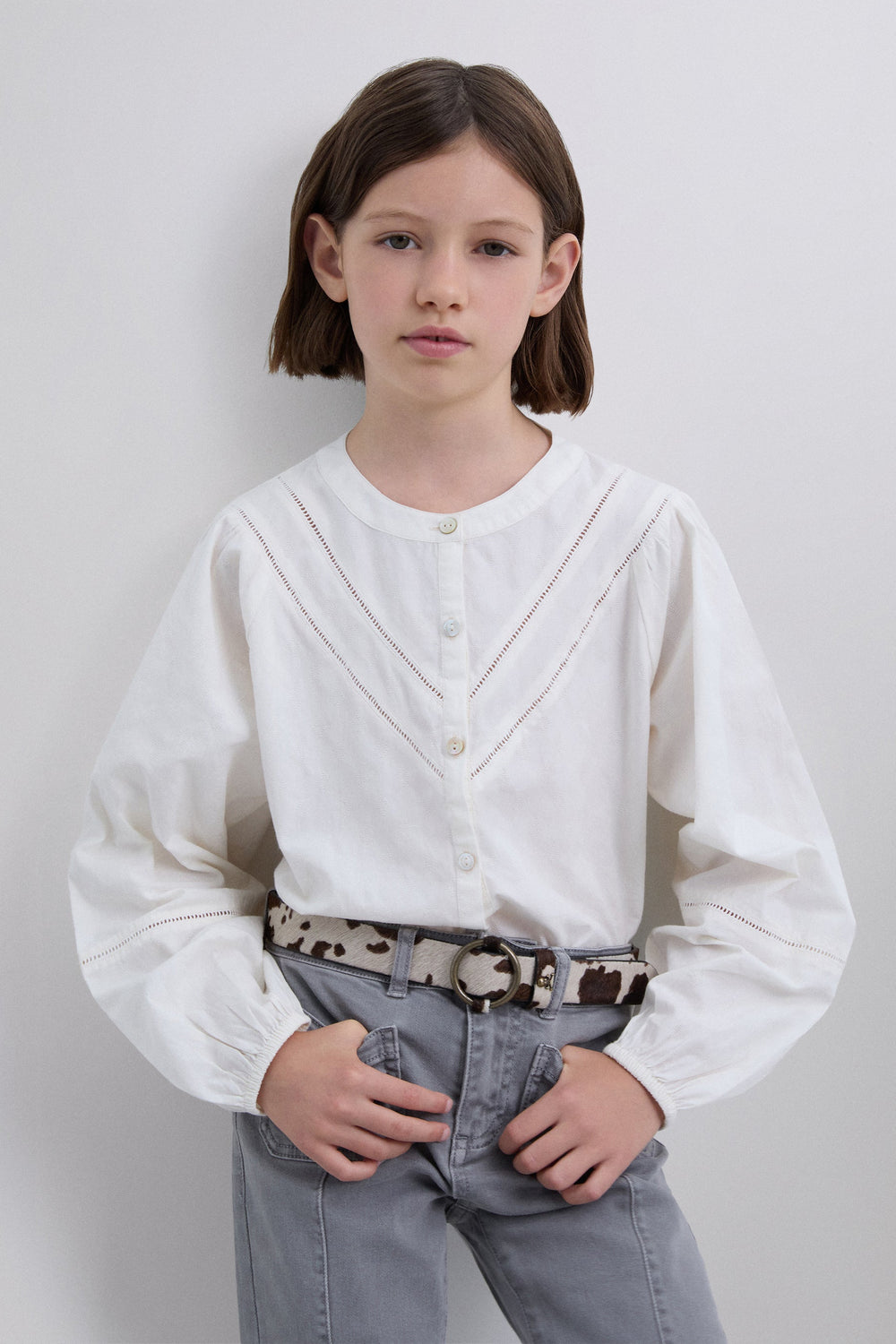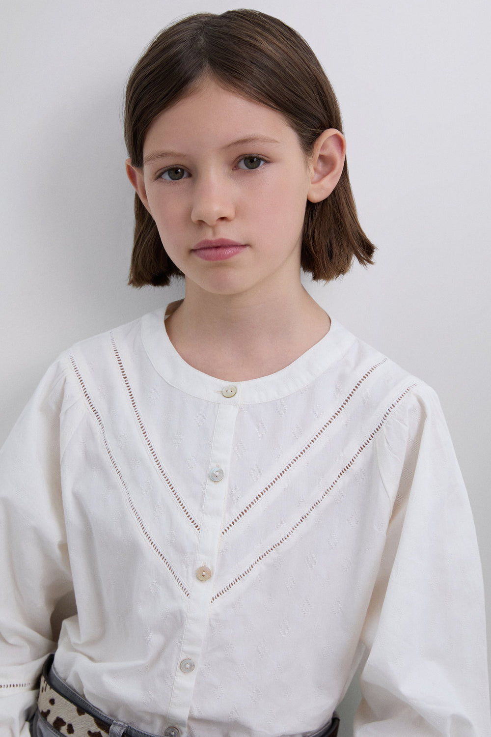 Camisa confecionada em 100% algodão. Camisa com decote redondo e manga comprida acabada em elástico. Fecho de abotoadura à frente. Pormenor do perfurados em bico.