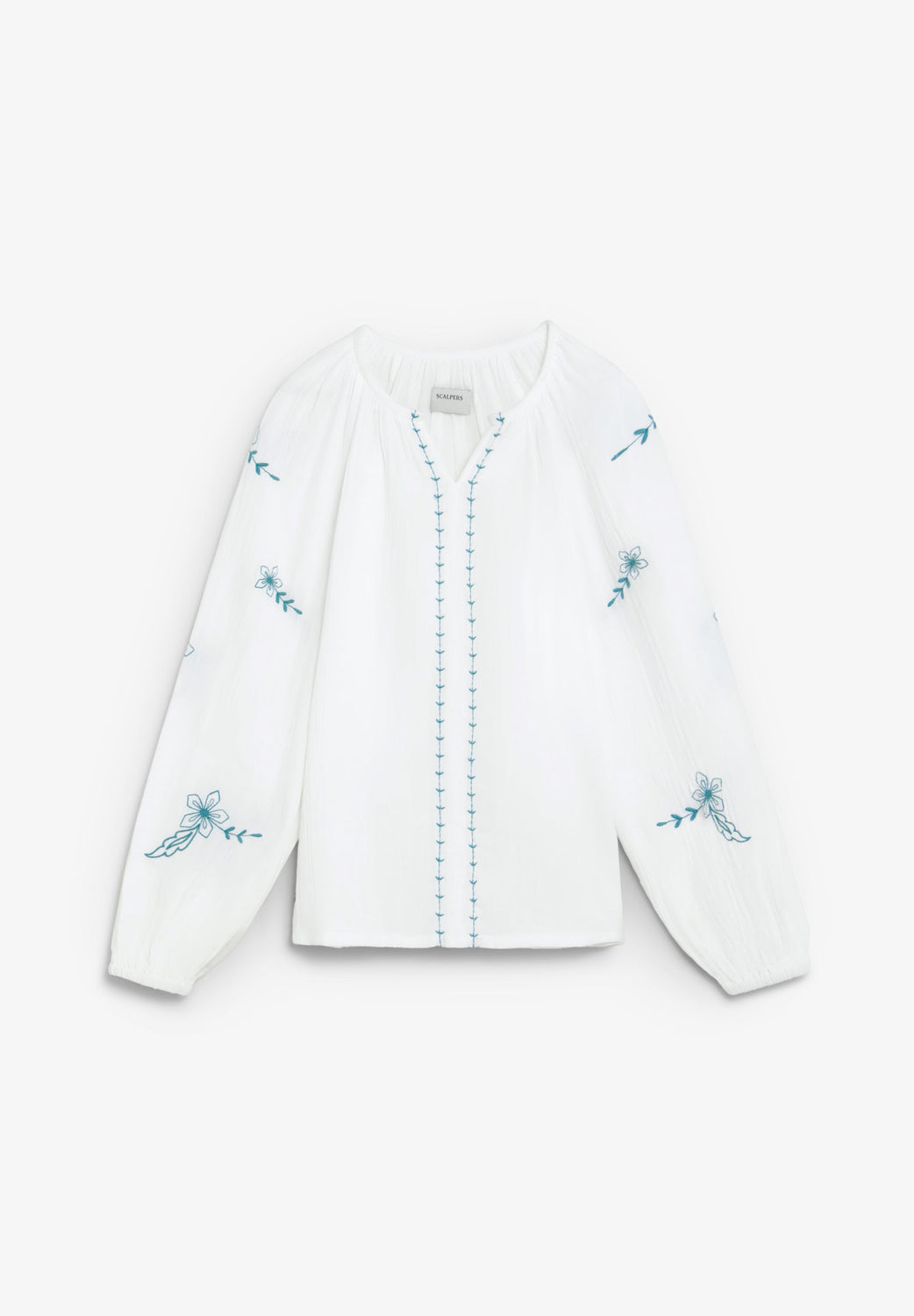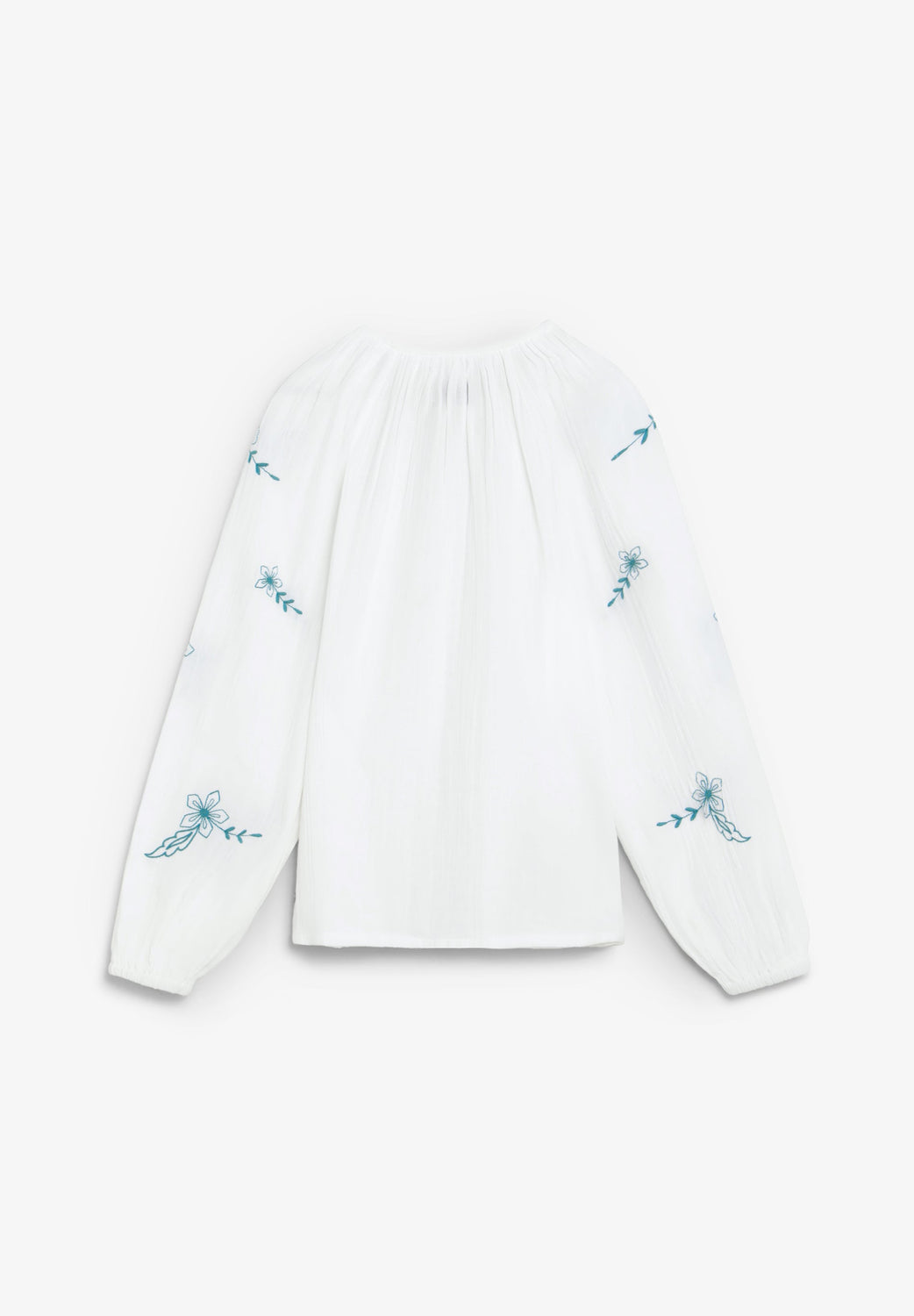 Blusa confecionada em tecido 100% algodão BCI. Decote em V e manga comprida com punho elástico. Pormenores florais bordados nas mangas e à frente.