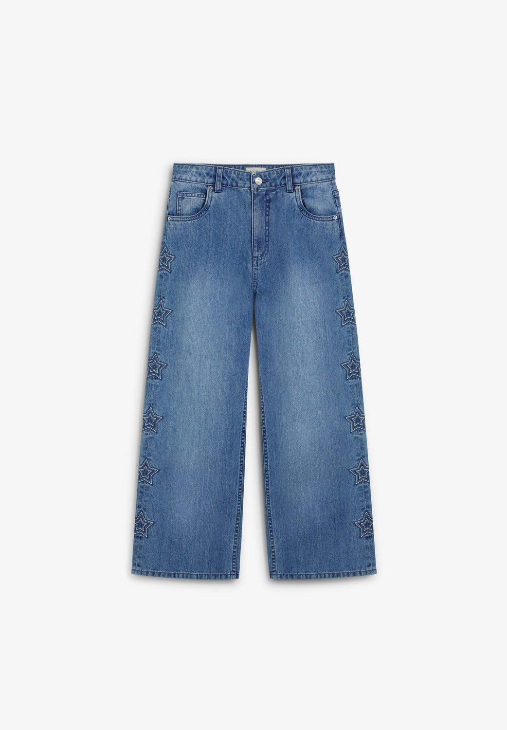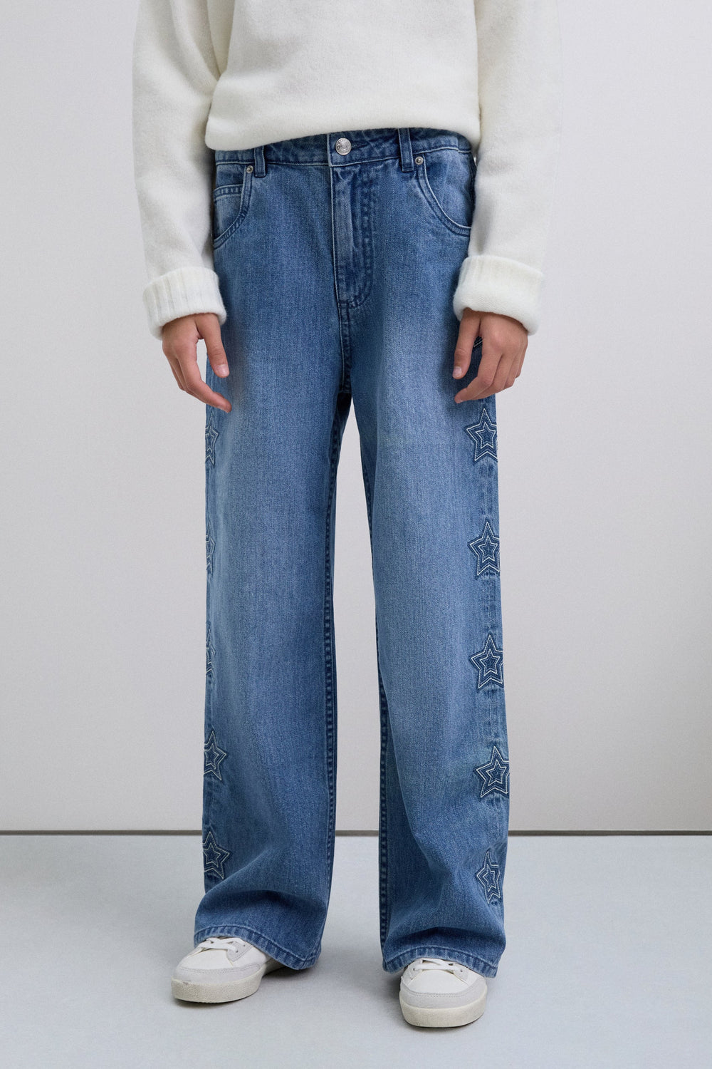 Calças wide leg confecionadas em 100% algodão orgânico. Fecho com botão e zip. Presilhas na cintura. Dois bolsos à frente e atrás. Pormenor de estrelas bordadas nas laterais.