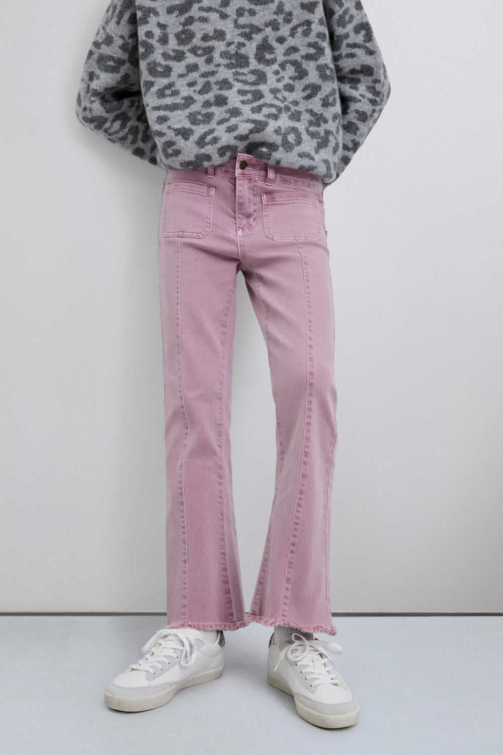 Calças boca de sino confecionadas em algodão BCI. Fecho com botão e zip. Presilhas na cintura. Bolsos à frente e atrás. Pormenor de costura na parte frontal. Abertura lateral e bainhas desfiadas.