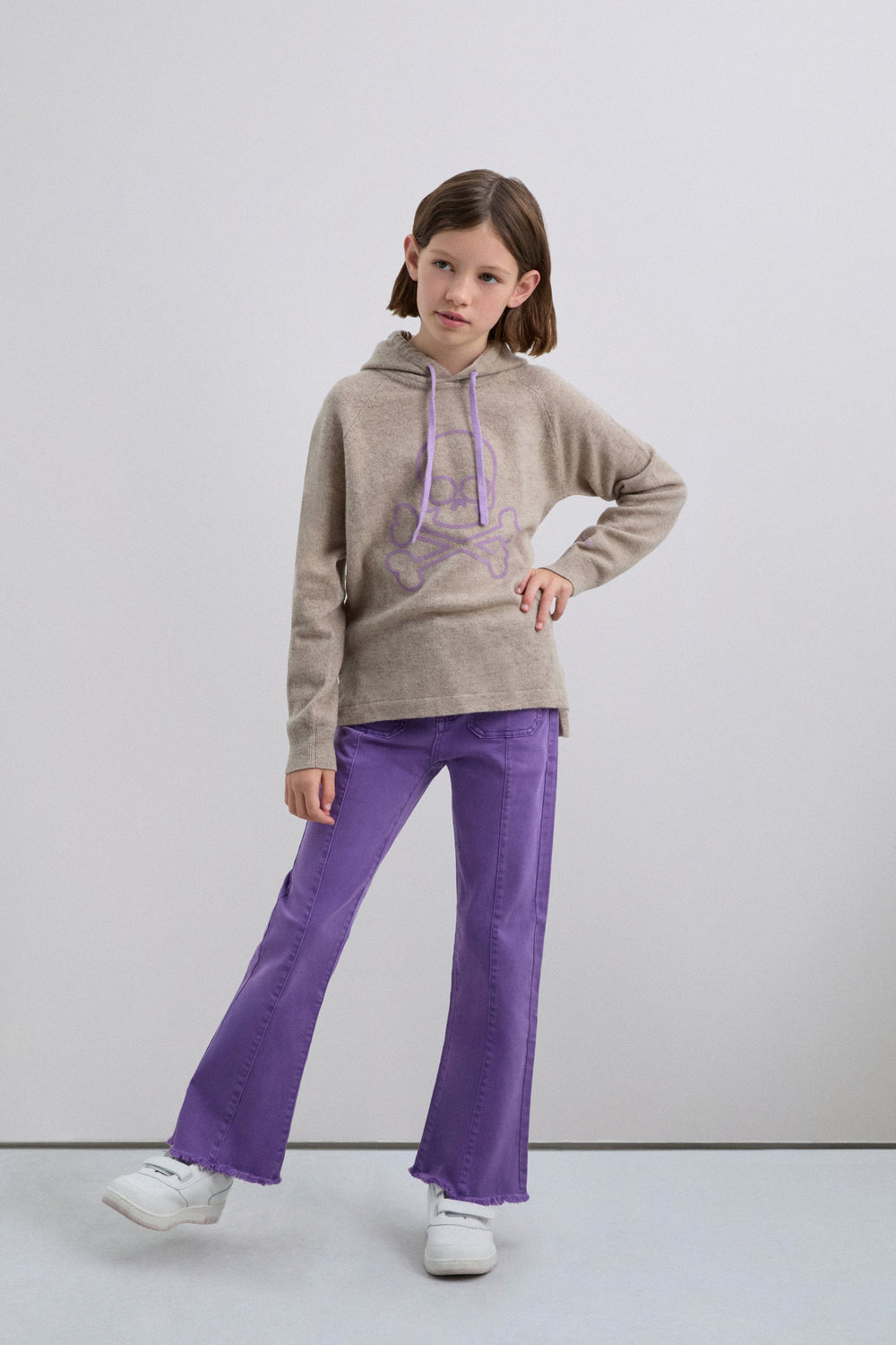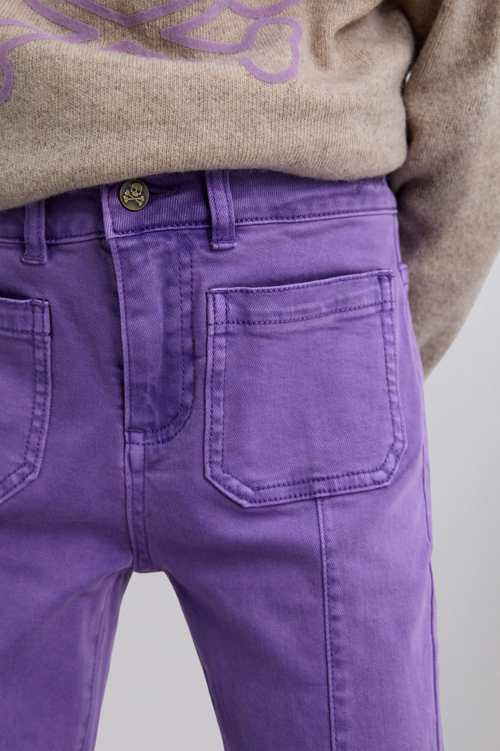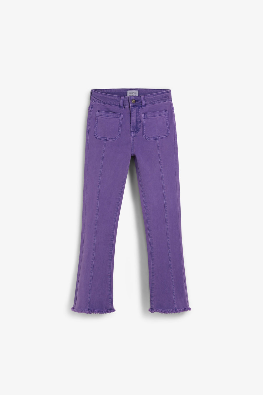 Calças boca de sino confecionadas em algodão BCI. Fecho com botão e zip. Presilhas na cintura. Bolsos à frente e atrás. Pormenor de costura na parte frontal. Abertura lateral e bainhas desfiadas.