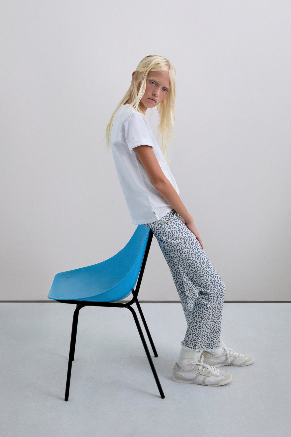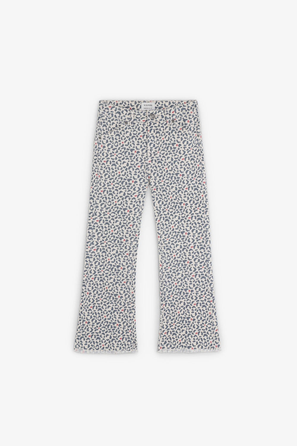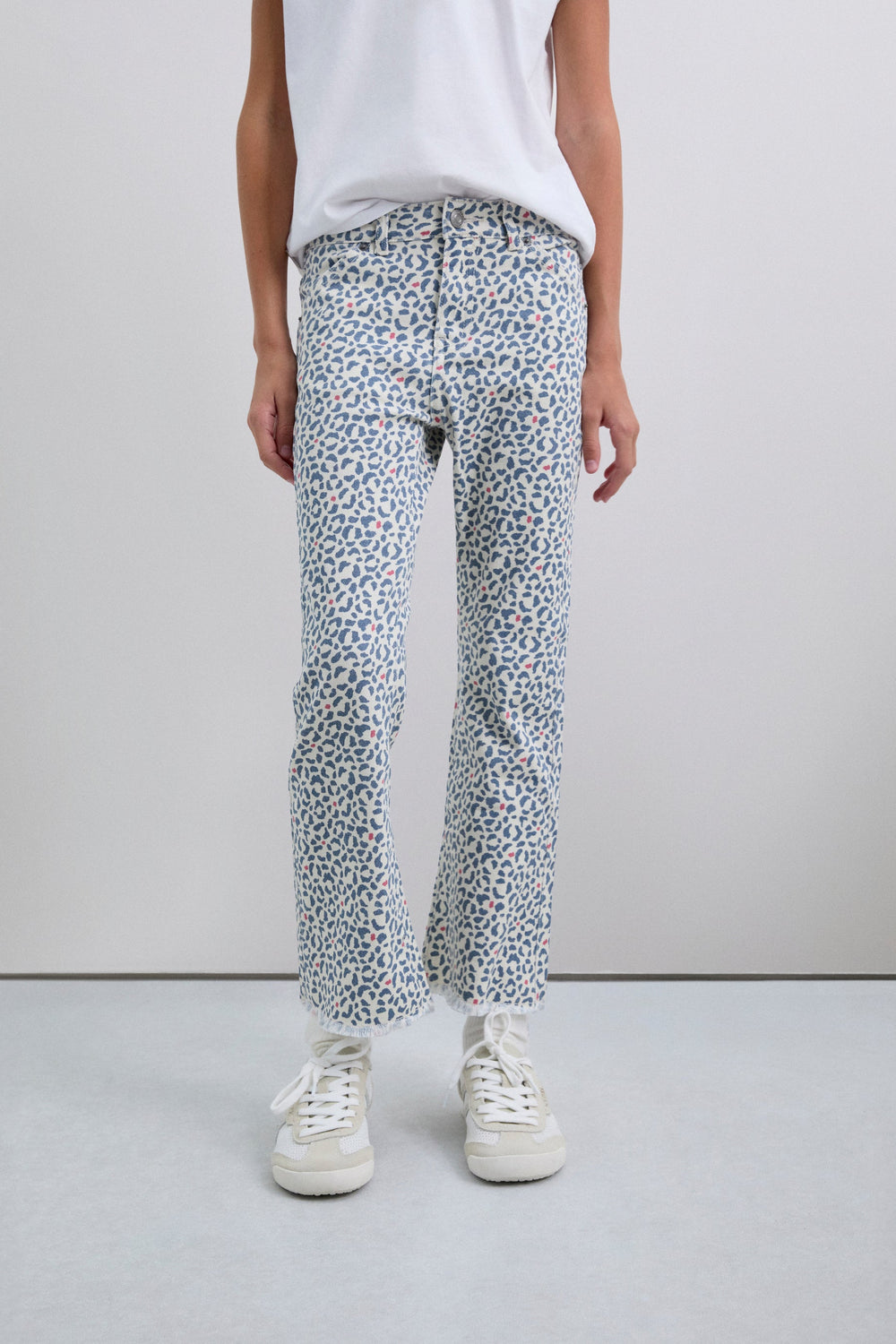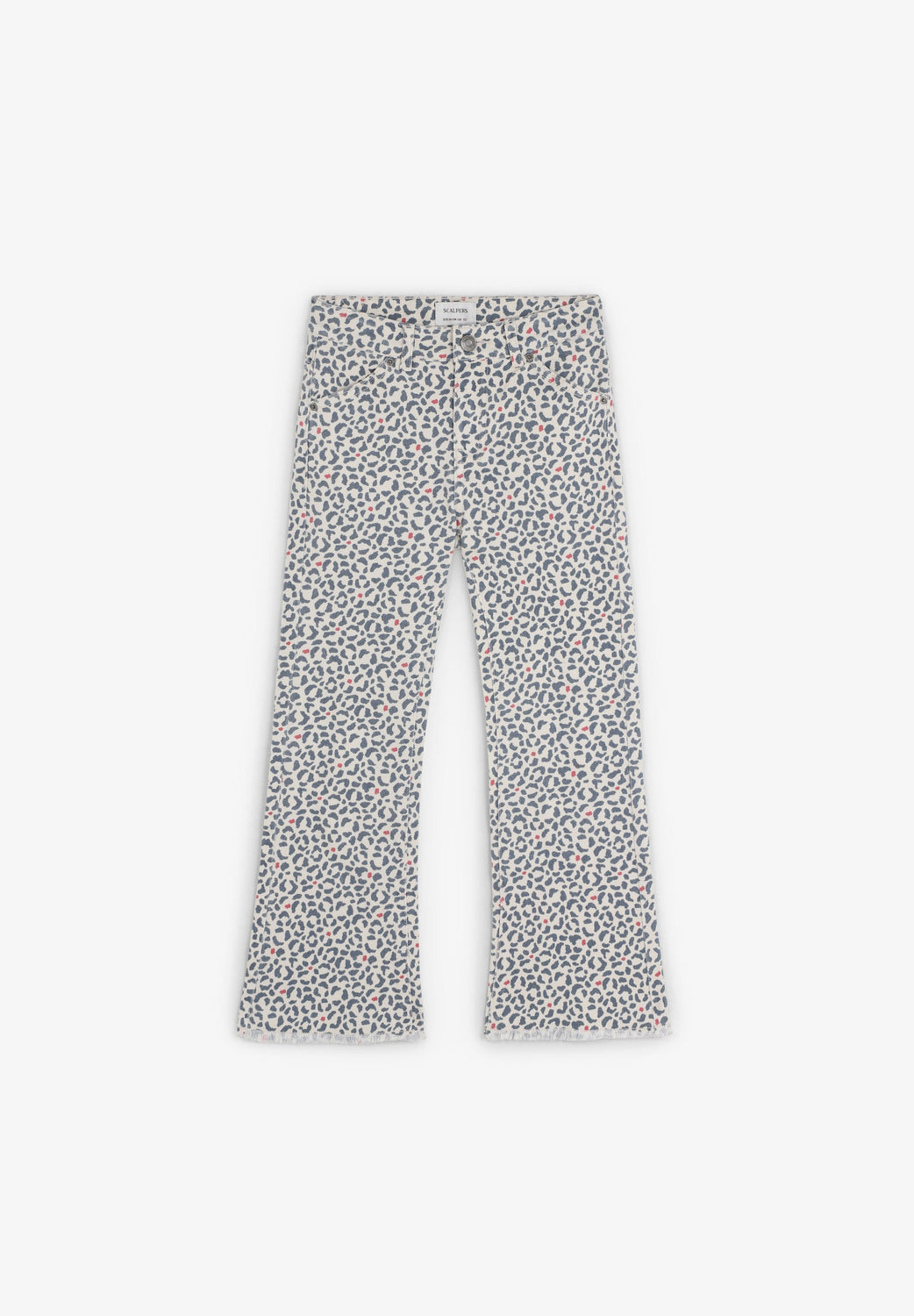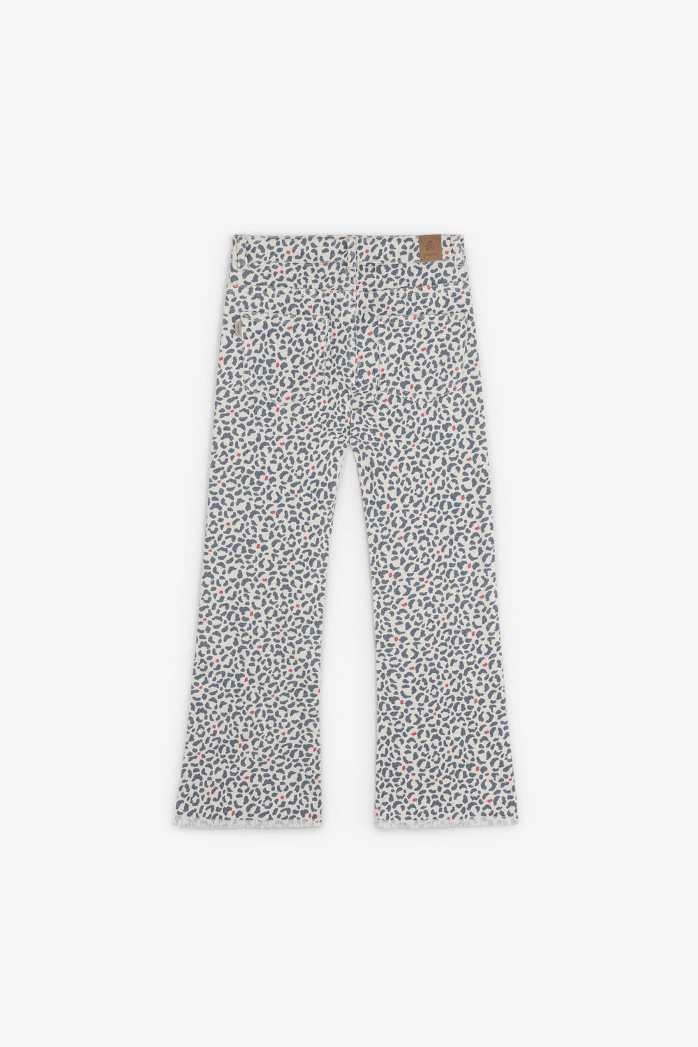 Calças de ganga. Dois bolsos à frente. Dois bolsos traseiros com pormenor de etiqueta com logótipo e skull. Motivo de desfiado nas bainhas. Presilhas na cintura. Fecho com botão e zip. Estampado animal.