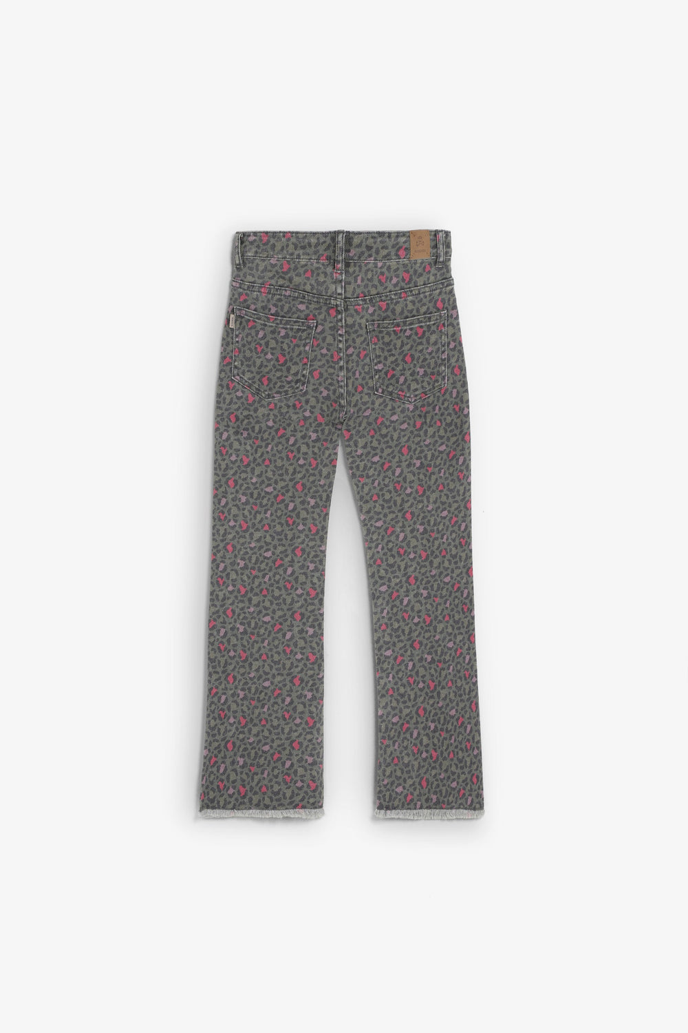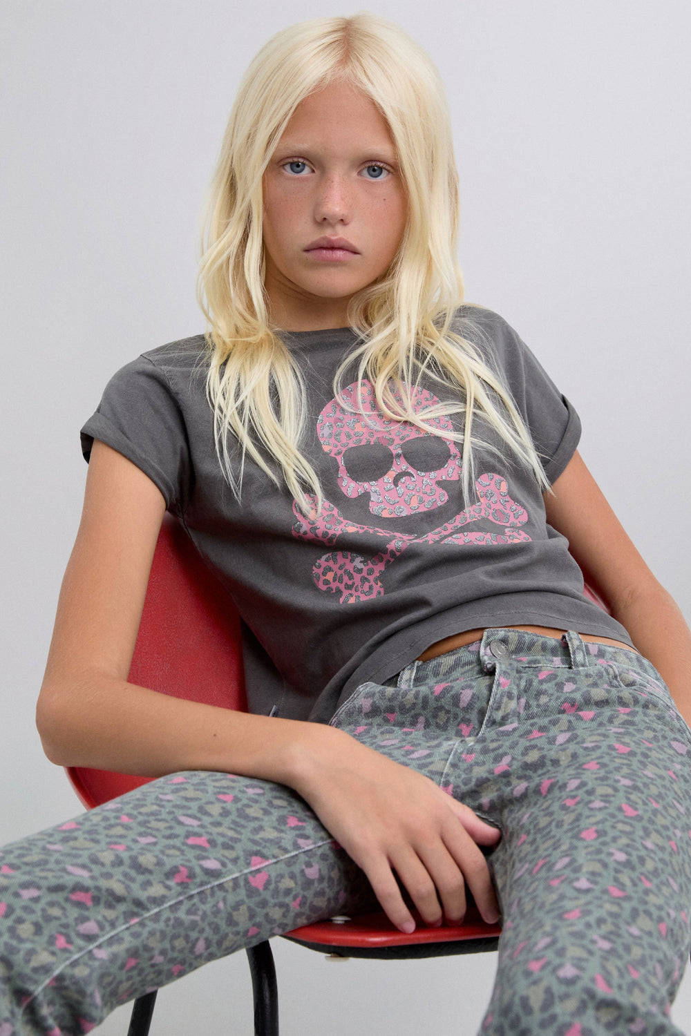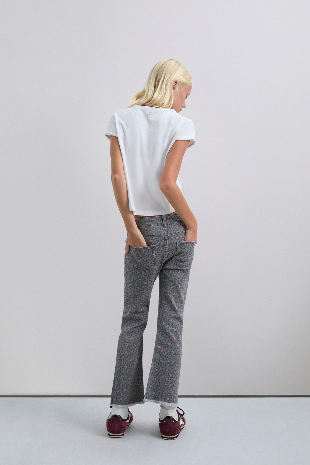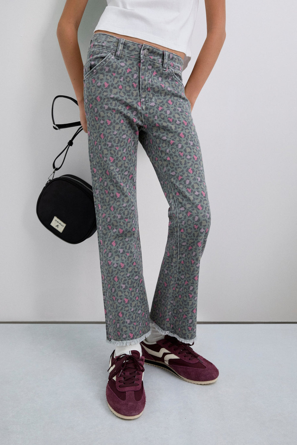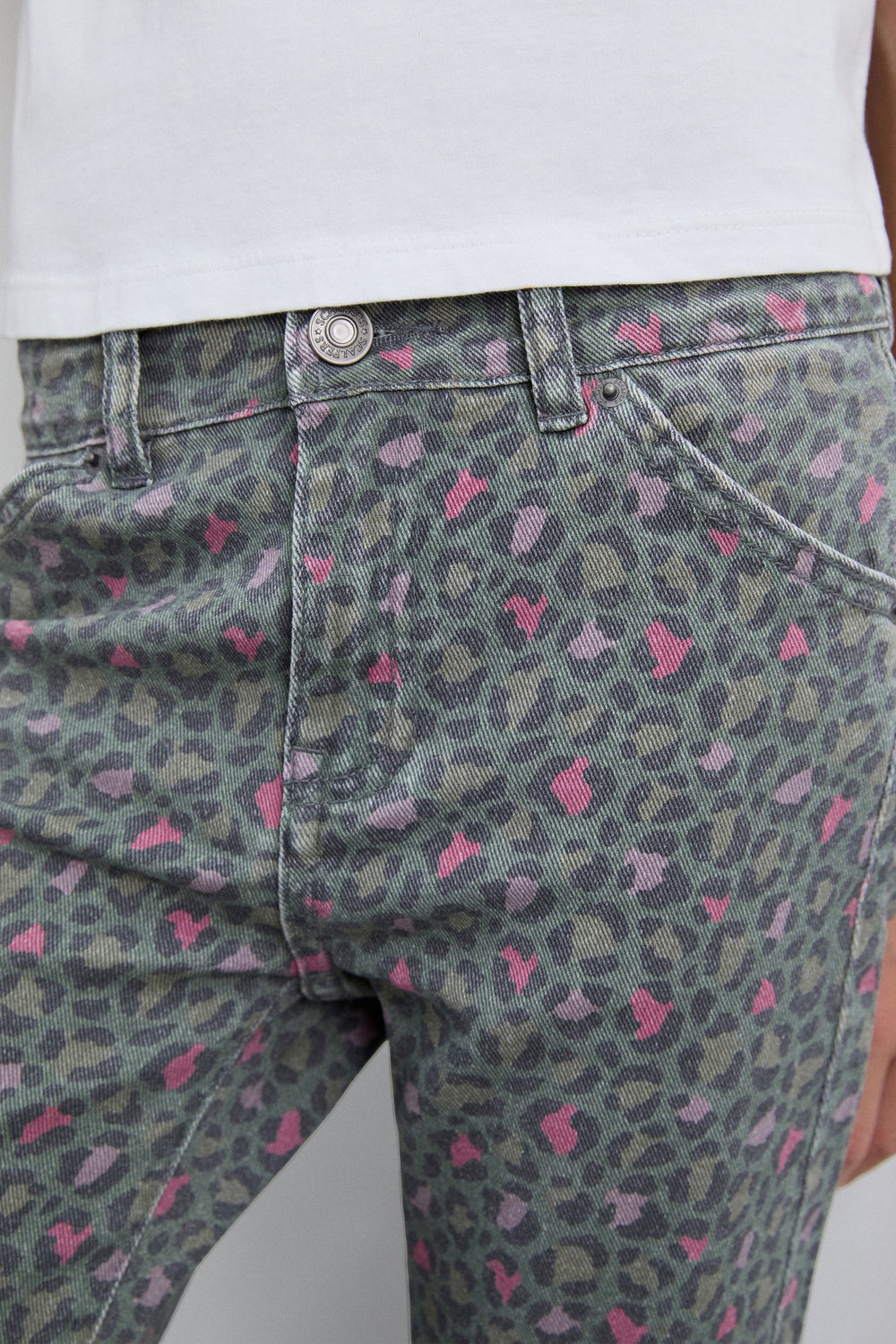 Calças de ganga. Dois bolsos à frente. Dois bolsos traseiros com pormenor de etiqueta com logótipo e skull. Motivo de desfiado nas bainhas. Presilhas na cintura. Fecho com botão e zip. Estampado animal.