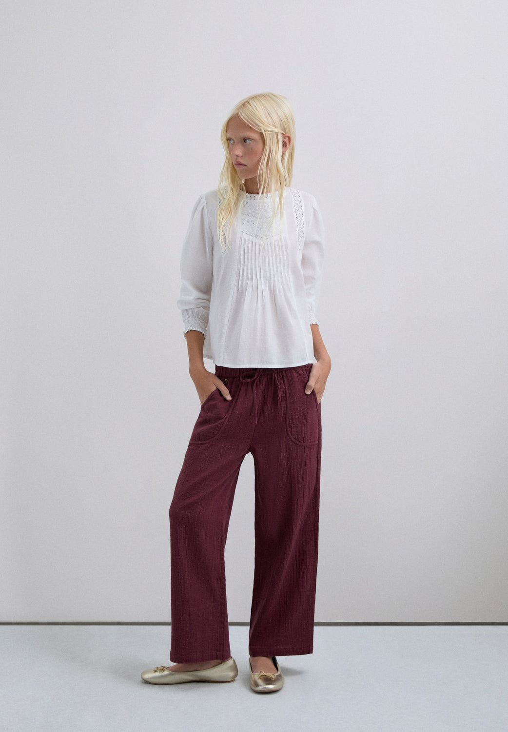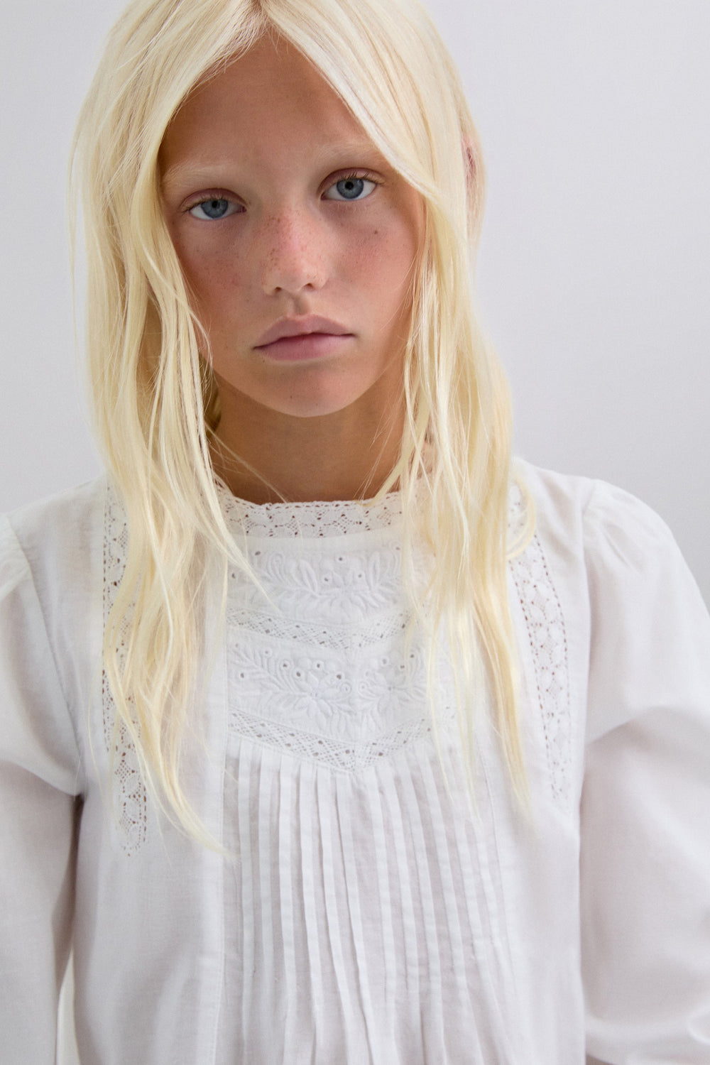 Blusa confecionada em tecido 100% algodão BCI. Regular fit. Decote redondo. Manga comprida abalonada terminada em elástico. Pormenor metálico de skull na cintura. Pormenores de bordados na gola e à frente. Fecho atrás com botão.