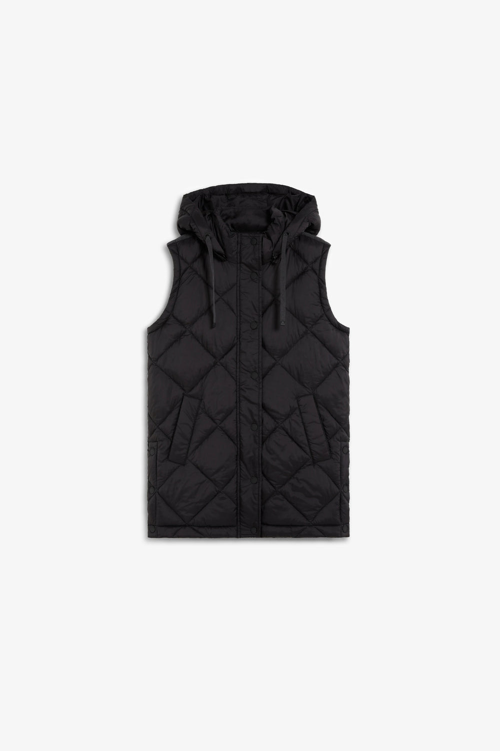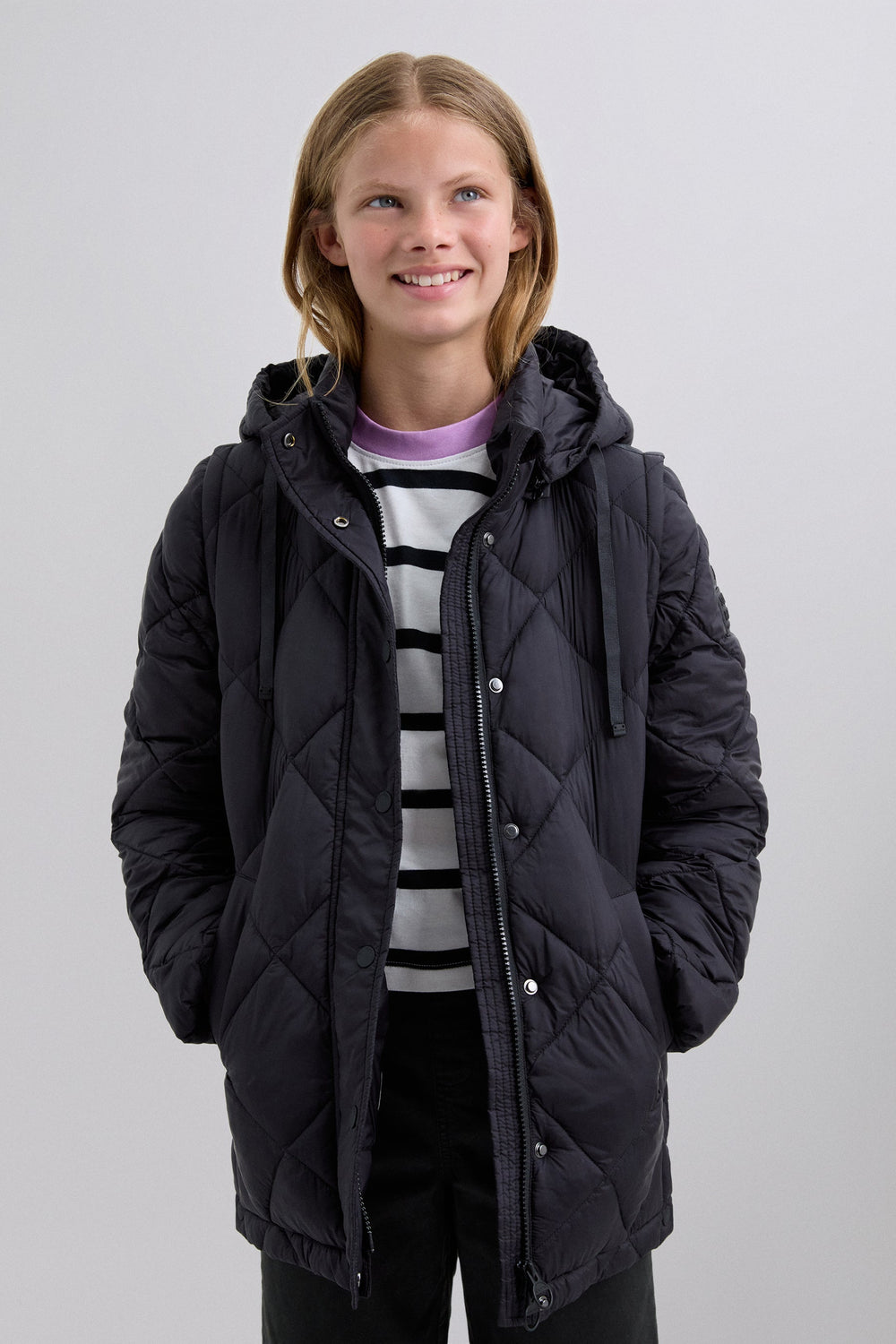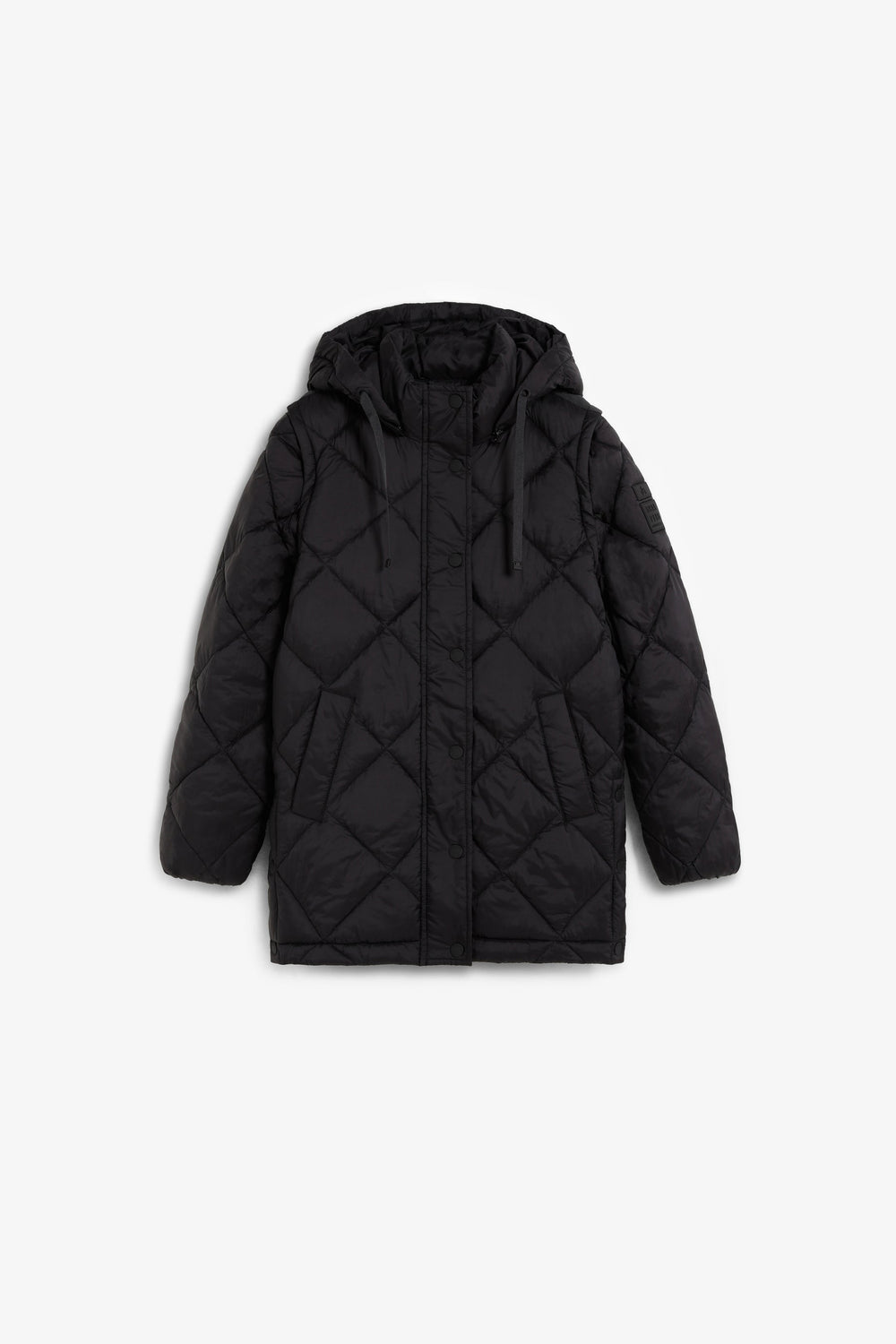 Casaco acolchoado. Capuz e Mangas amovíveis. Fecho de correr à frente oculto por uma aba com fecho de botões de pressão. Bolsos laterais. Forro recycled. Pormenor de logótipo nas costas.