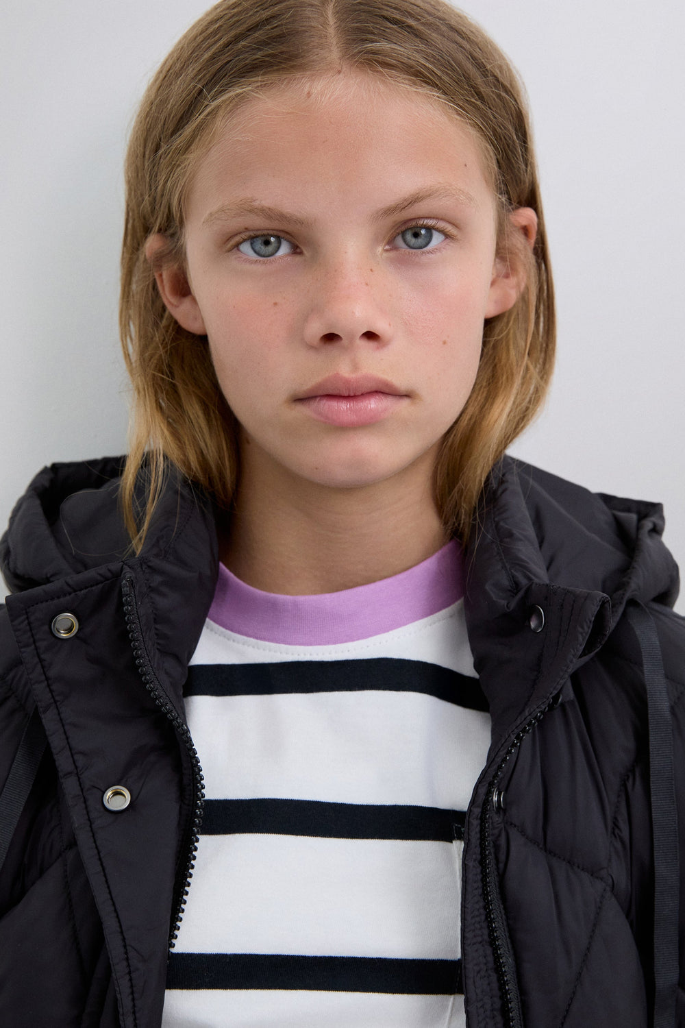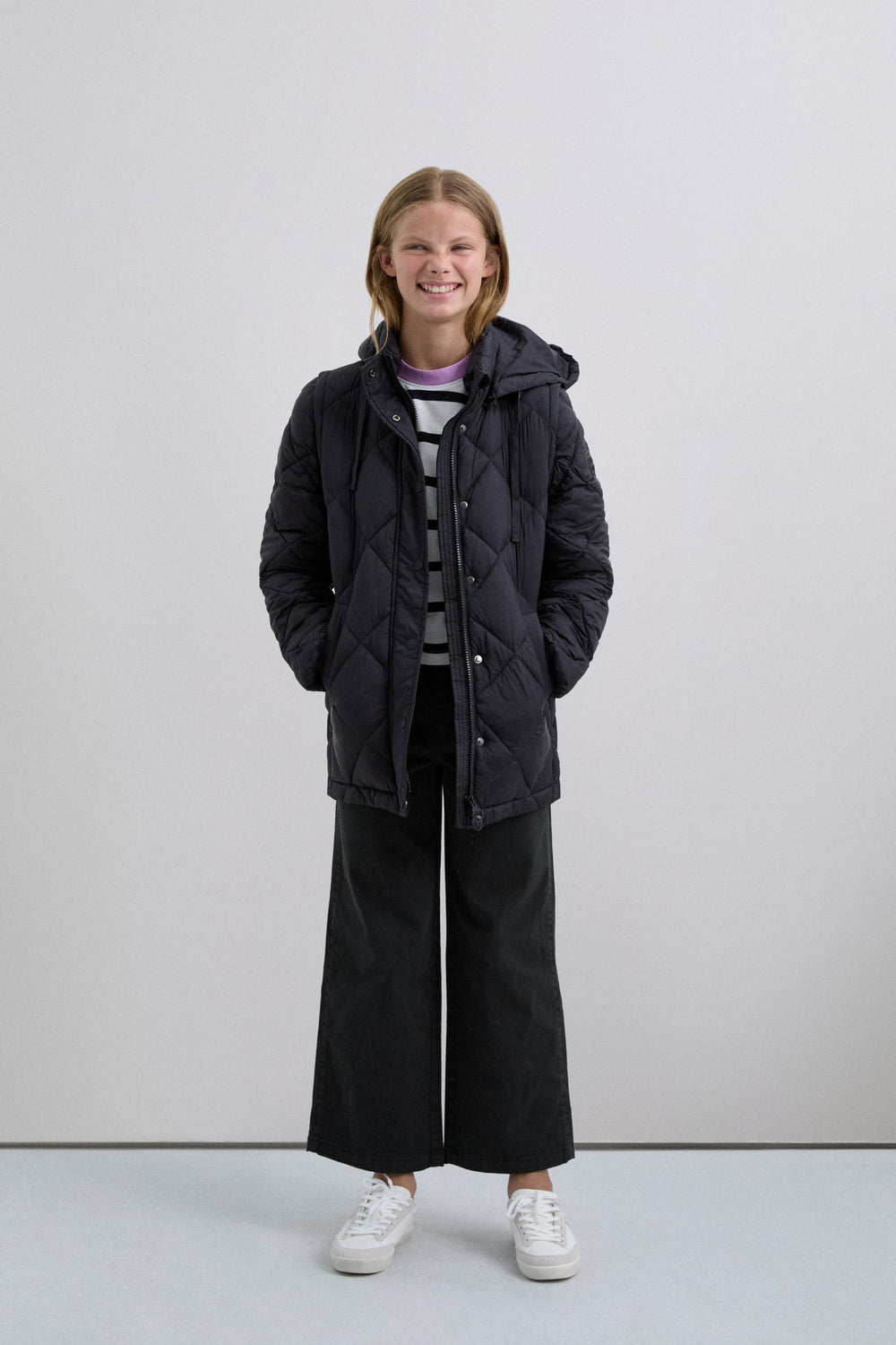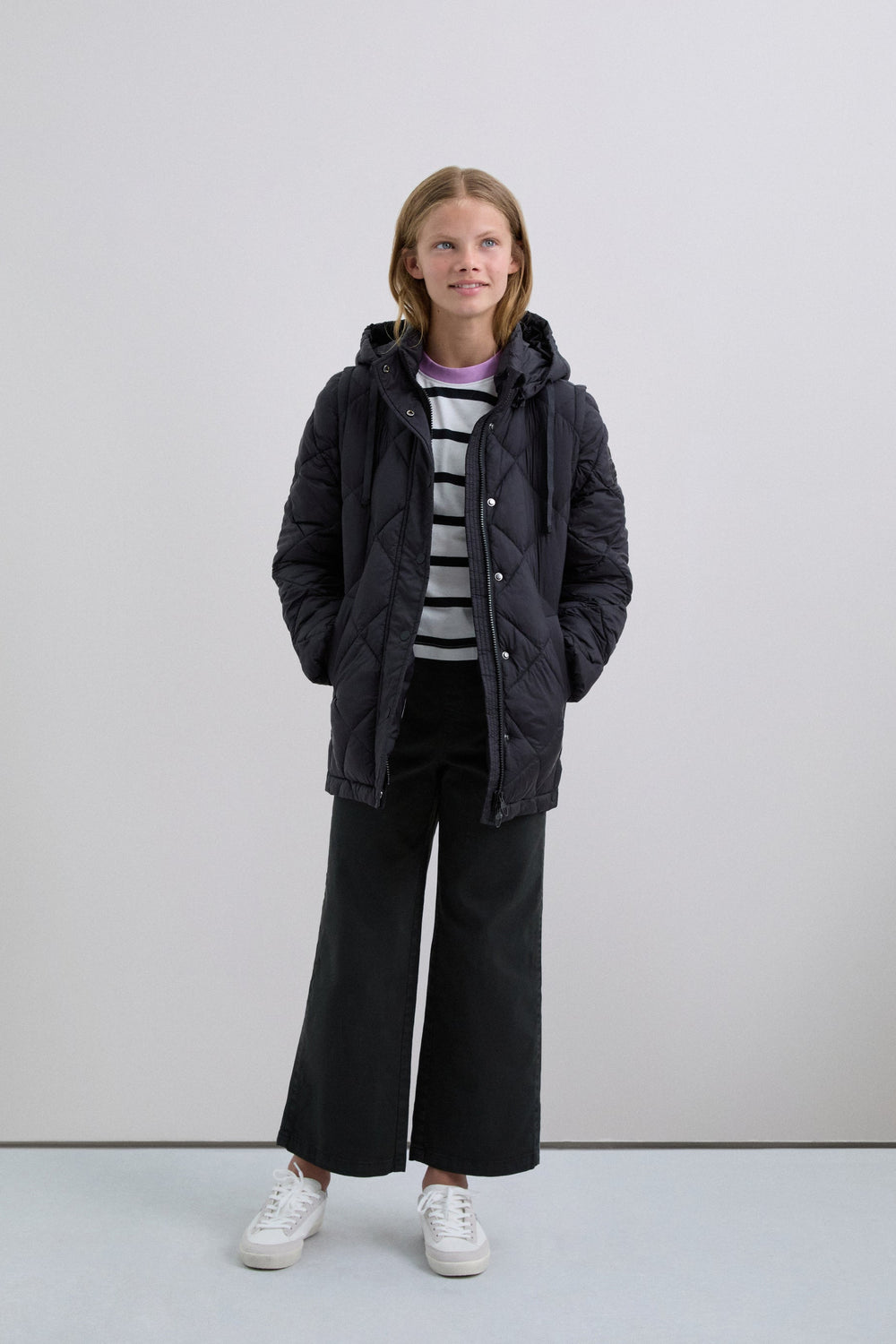Casaco acolchoado. Capuz e Mangas amovíveis. Fecho de correr à frente oculto por uma aba com fecho de botões de pressão. Bolsos laterais. Forro recycled. Pormenor de logótipo nas costas.