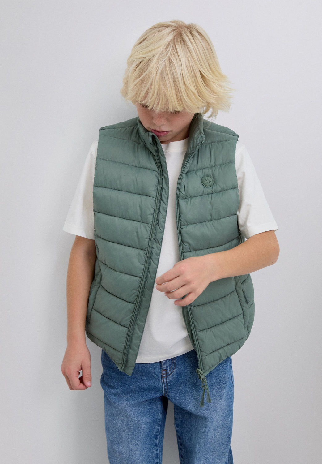 Colete acolchoado confecionado em tecido de poliéster reciclado. Corte Regular Fit. Gola subida. Fecho com zip e bolsos laterais.