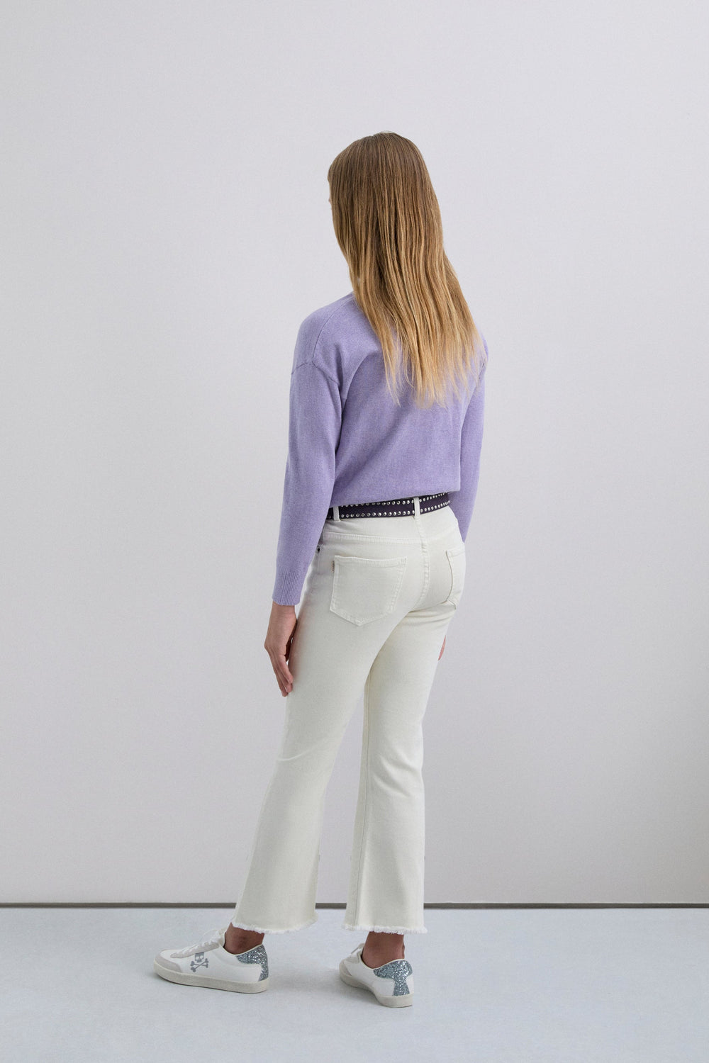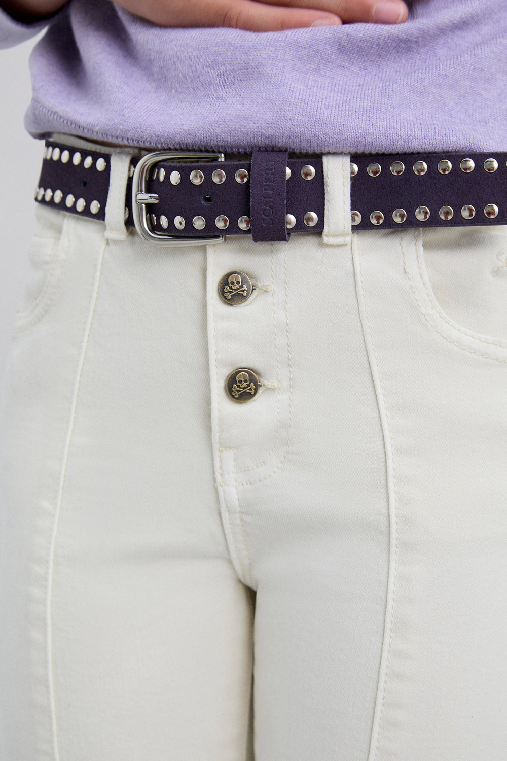 Calças confecionadas com algodão ligeiramente elástico. Corte à boca de sino. Fecho de botões com pormenores do logótipo de skull. Bolsos à frente e de remendos atrás. Acabamento com franjas e costura frontal.
