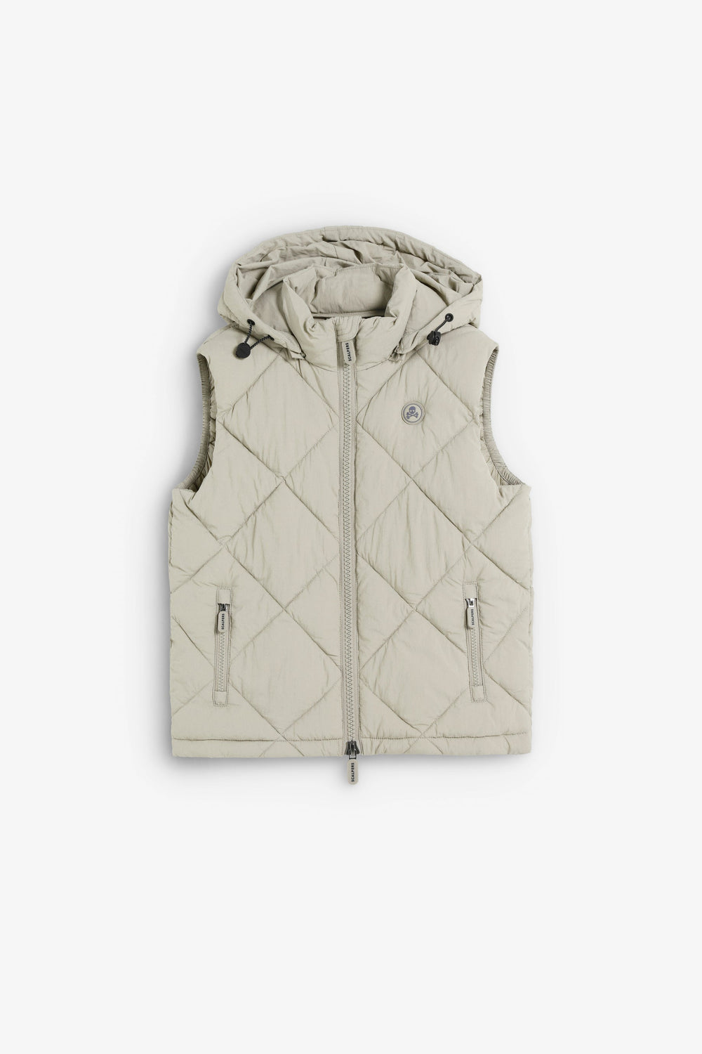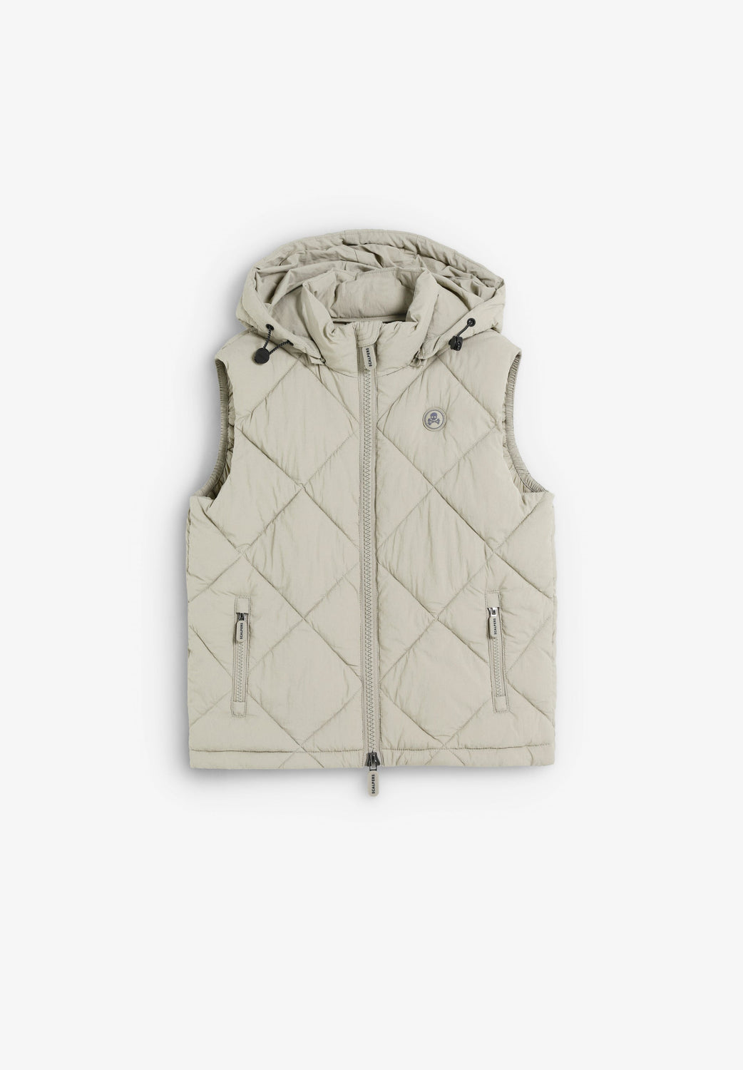 Colete resistente acolchoado com capuz ajustável. Fecho com zip de cursor duplo. Pormenor de skull com efeito de caucho no peito. Bolsos com fecho de correr e bolso interior