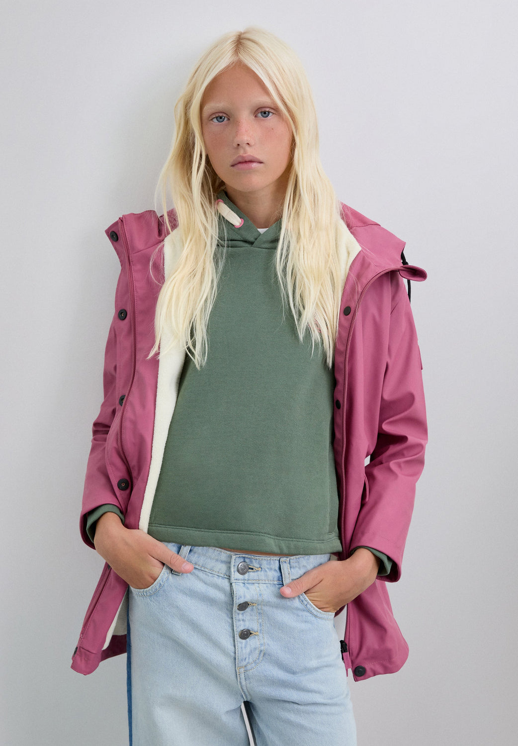 Casaco impermeável. Manga comprida. Capuz ajustável com cordão. Dois bolsos à frente. Pormenor de remendos efeito de caucho com skull e logótipo na manga. Fecho com abotoadura e zip.