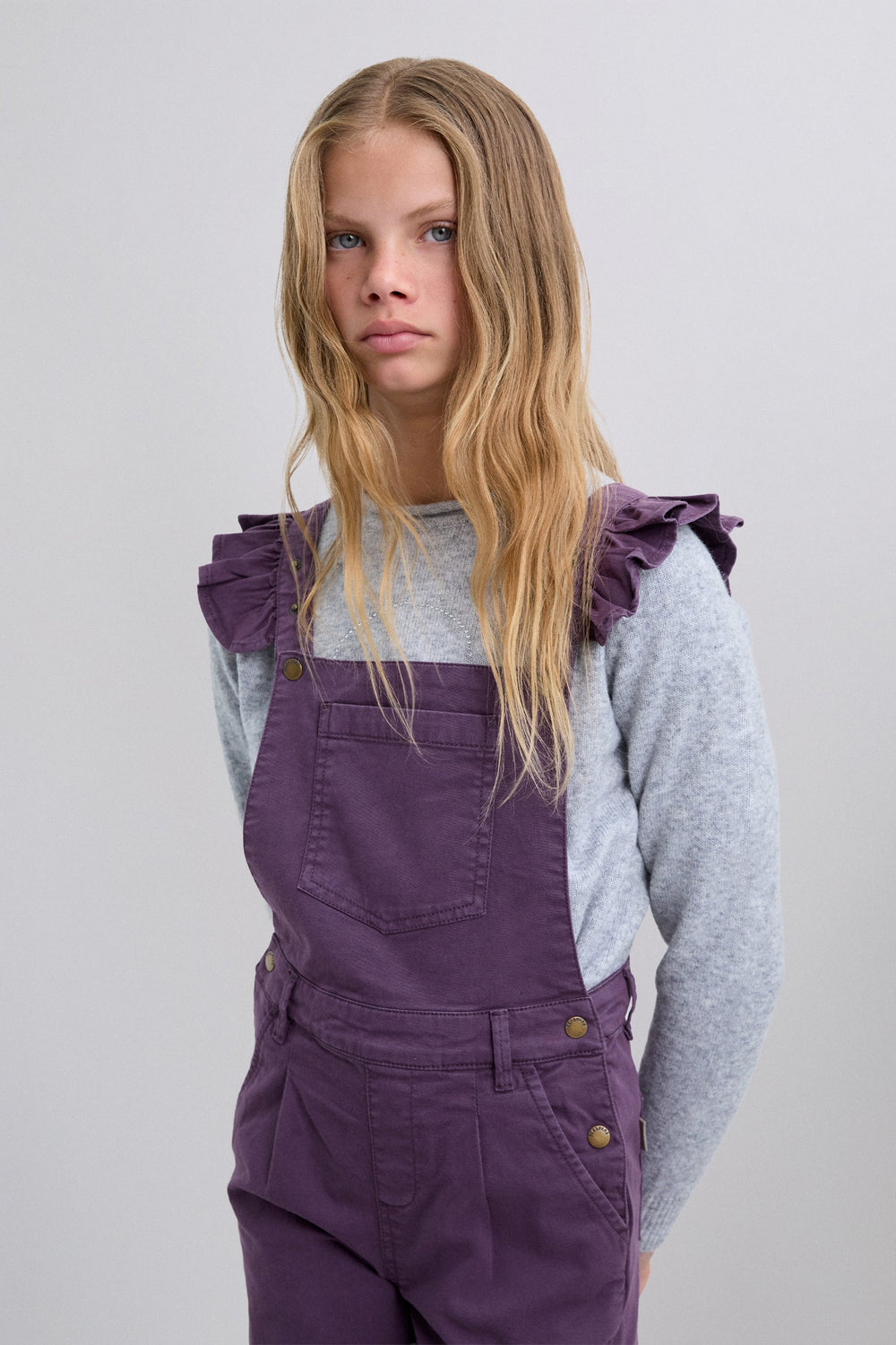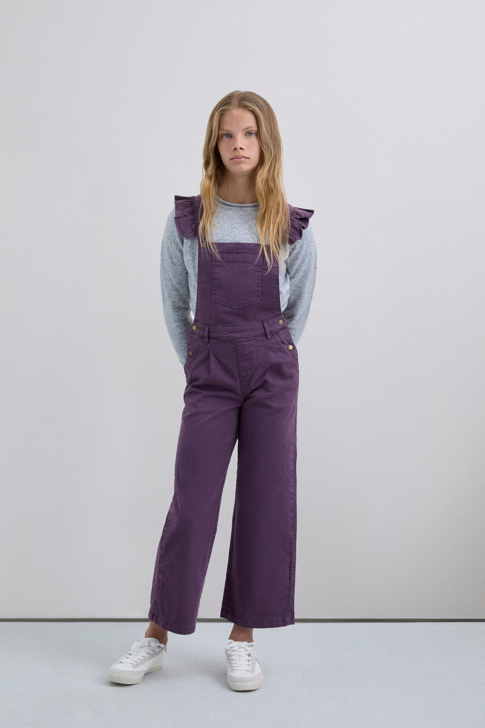 Jardineiras confecionadas em algodão ligeiramente elástico. Regular fit com corte culottes, fecho com botões laterais. Alças com folho cruzadas nas costas e bolso de remendo no peito. Bolsos laterais inclinados e traseiros de remendo.