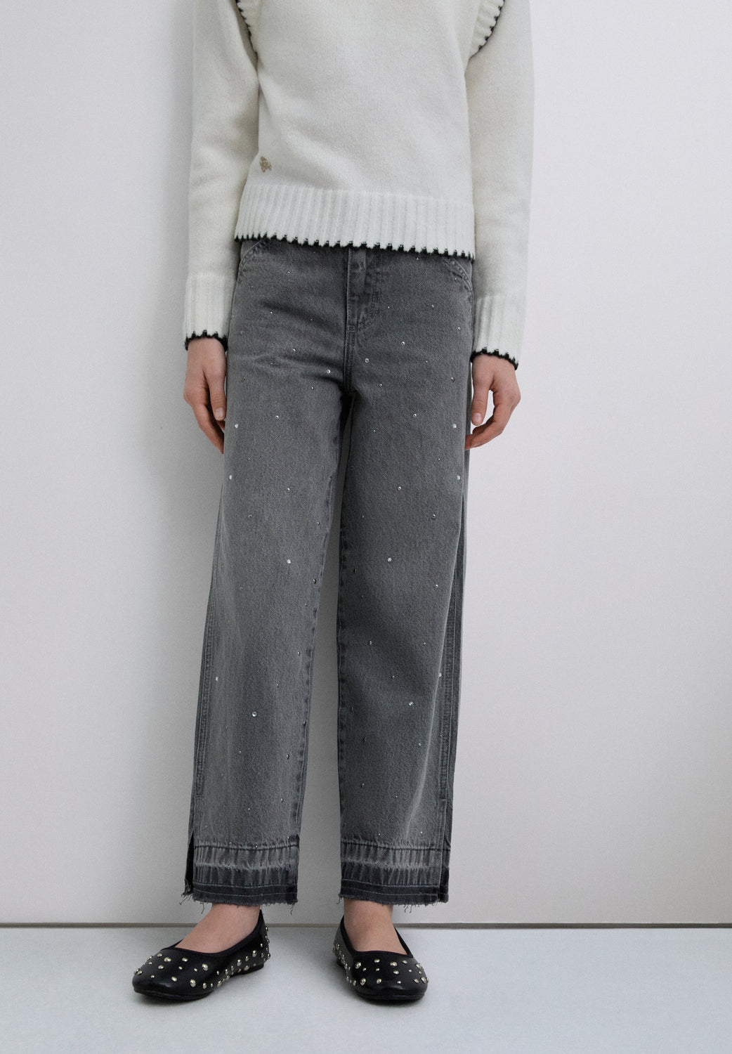 Calças confecionadas em 100% algodão BCI. Padrão com tachas. Dois bolsos à frente e atrás. Costuras na bainha.