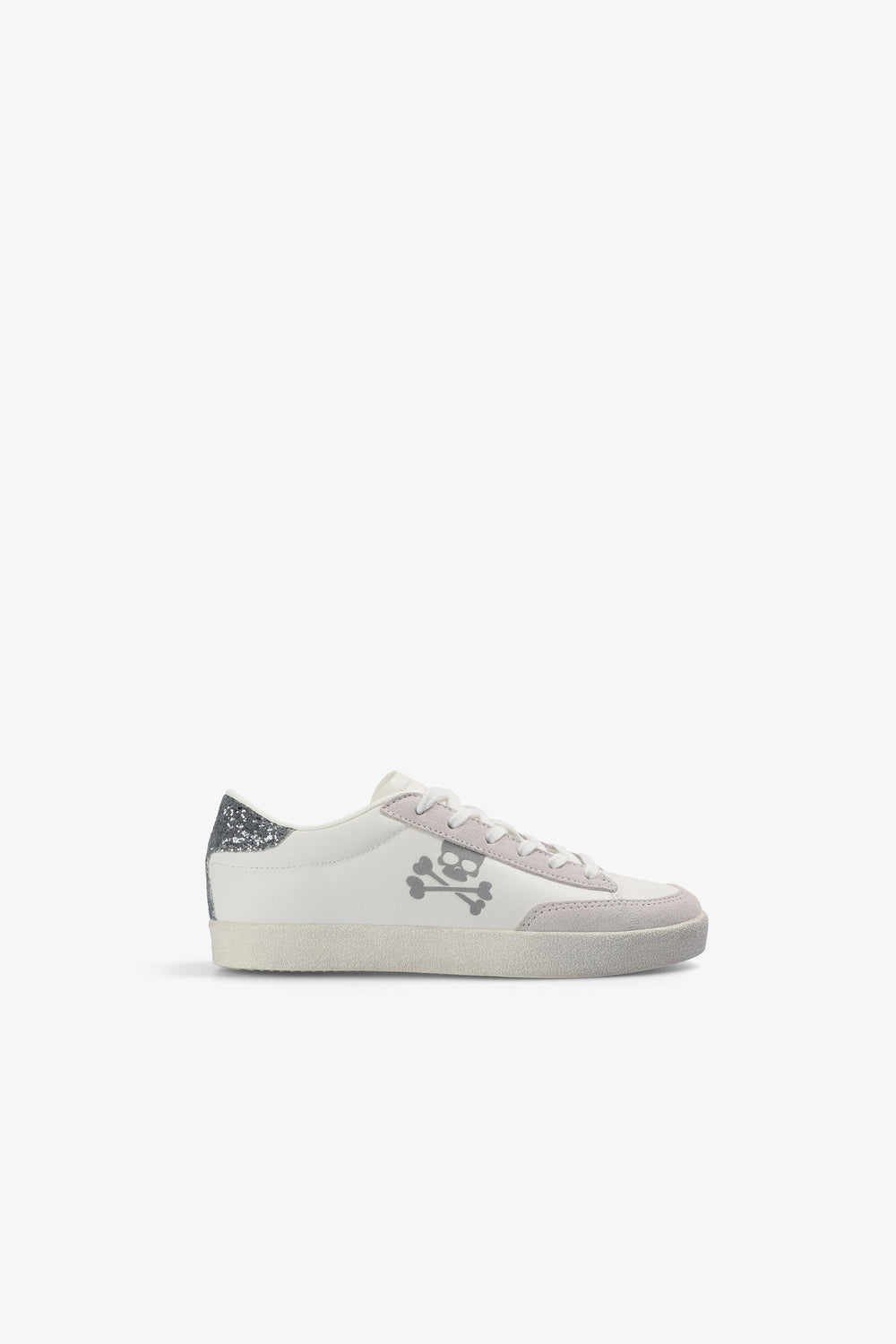 Sapatilhas baixas com skull lateral a contrastar Sola de borracha. Fecho com cordões. Calcanhar com glitter em contraste.