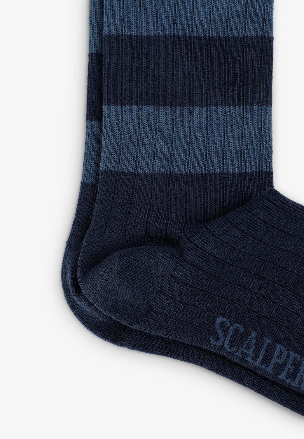 Meias confecionadas em mistura de algodão orgânico. Padrão às riscas. Pormenor de logótipo bordado a contrastar. Pormenor de logótipo em contraste na parte de baixo.