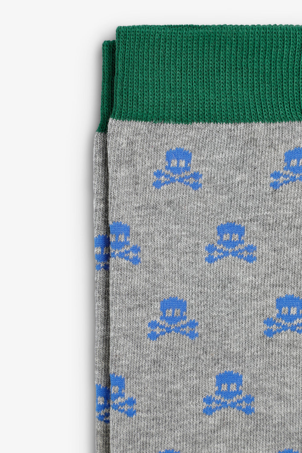 Meias compridas confecionadas em mistura de algodão. Padrão de skulls. Ponta e calcanhar a contrastar. Pormenor de logótipo em contraste.