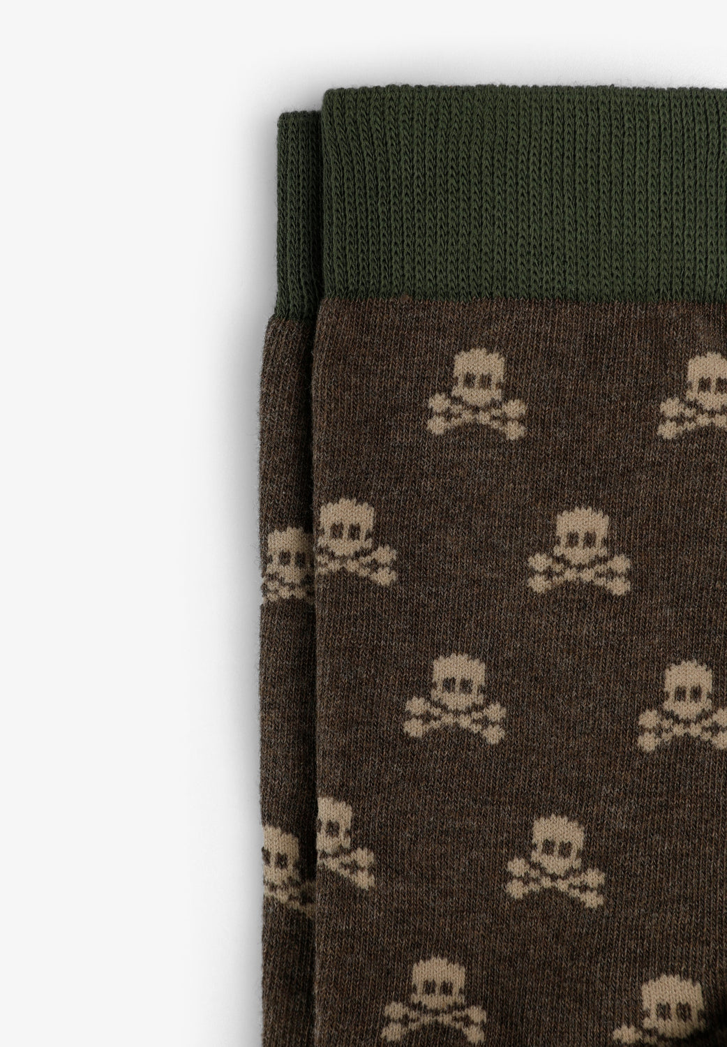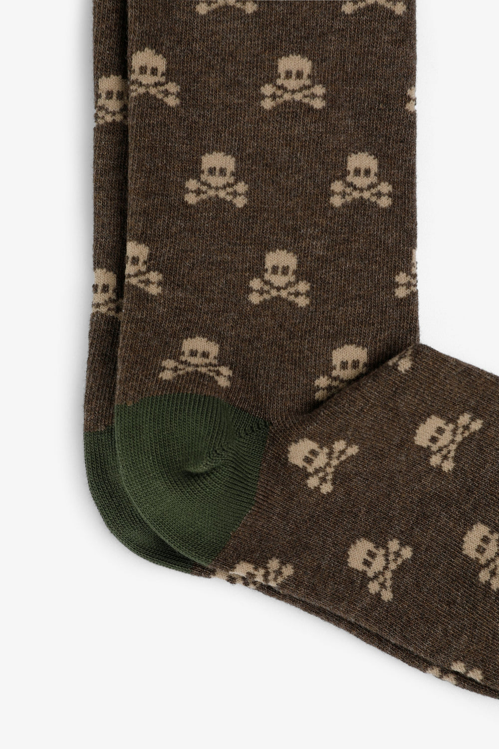 Meias confecionadas em mistura de algodão. Padrão de skulls. Ponta e calcanhar a contrastar. Pormenor de logótipo em contraste.