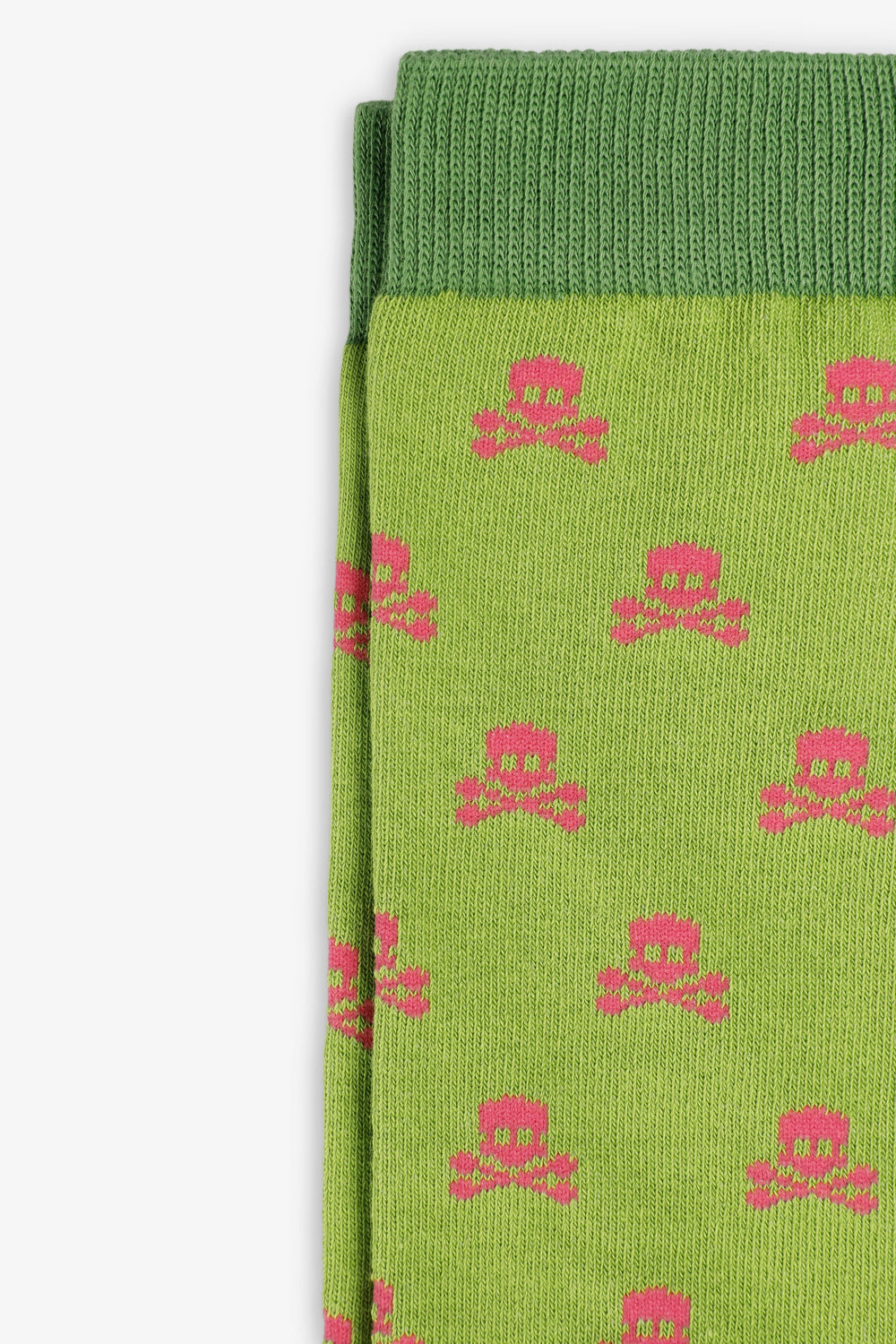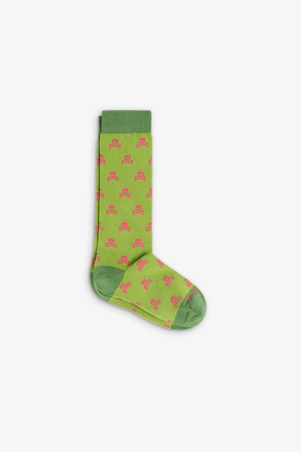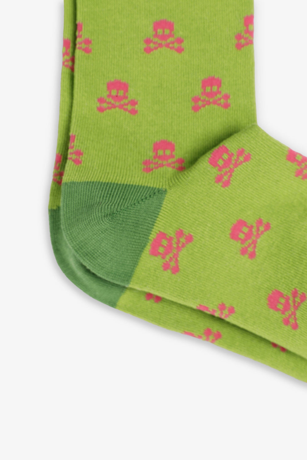 Meias confecionados em algodão BCI. Padrão de skulls em contraste. Logótipo e acabamentos em contraste.