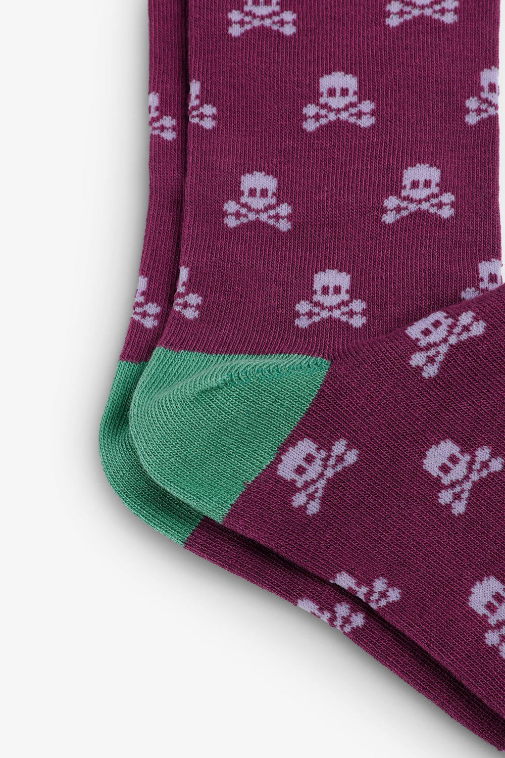 Meias confecionados em algodão BCI. Padrão de skulls em contraste. Logótipo e acabamentos em contraste.