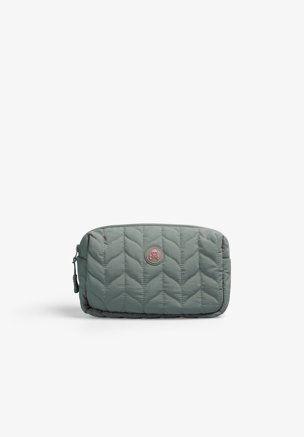 Necessaire material sintético. Pormenor de remendo frontal efeito de caucho com skull. Fecho de correr.
