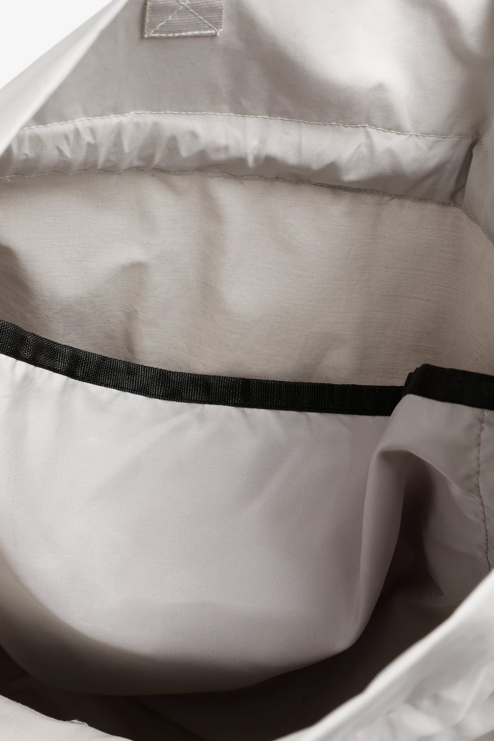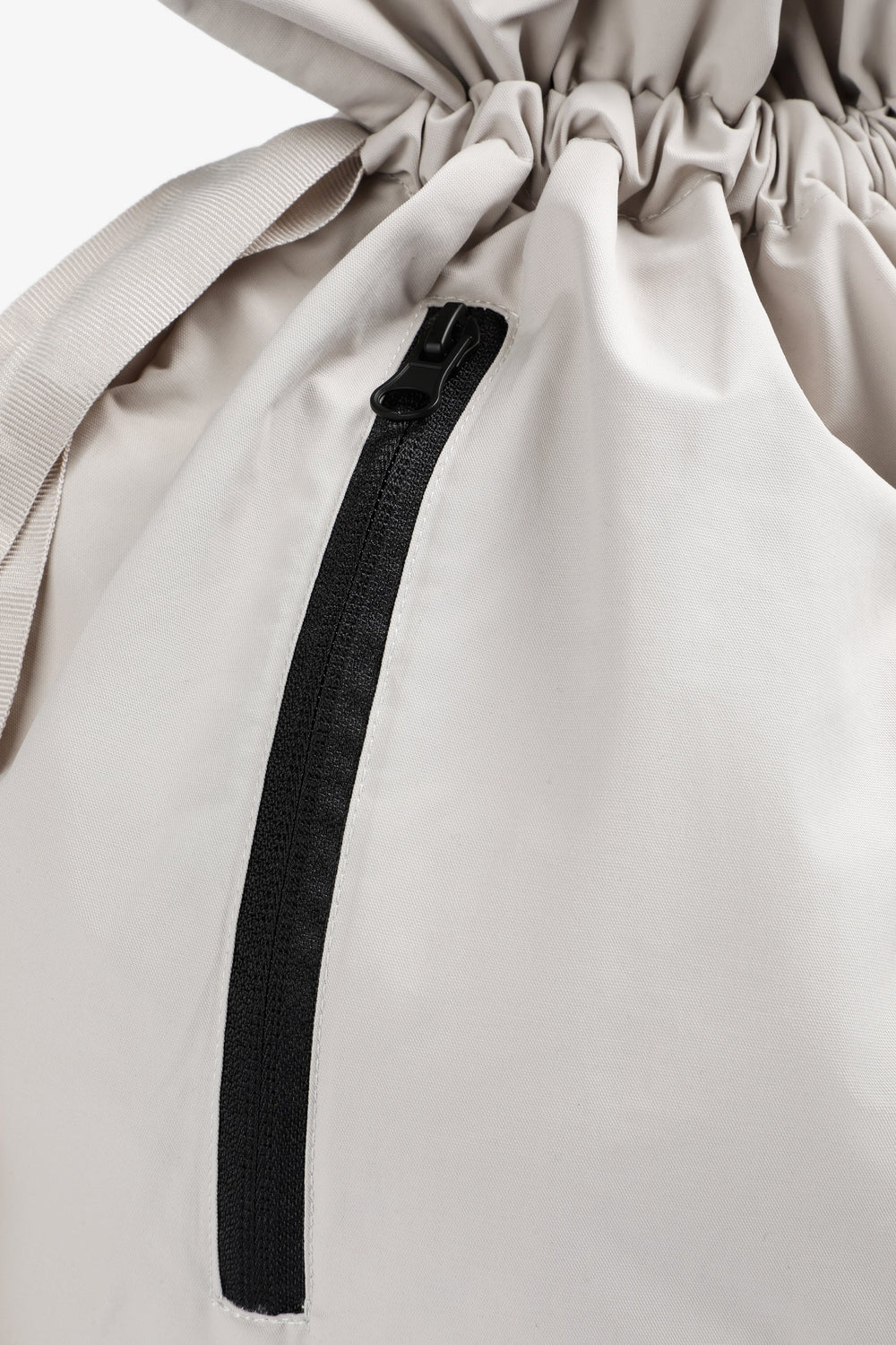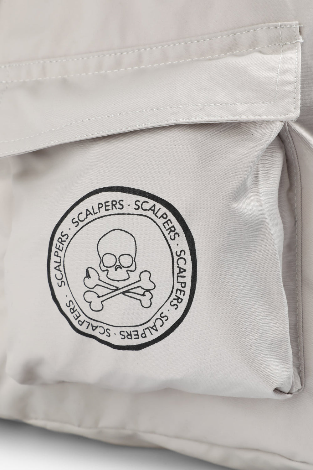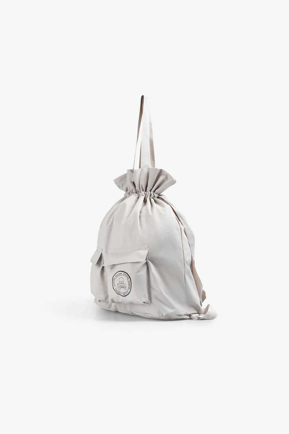Mochila leve com fecho em nó. Dupla alça ajustável. Dois bolsos à frente com aba. Padrão com skull no bolso. Pormenor de skull lateral em contraste.