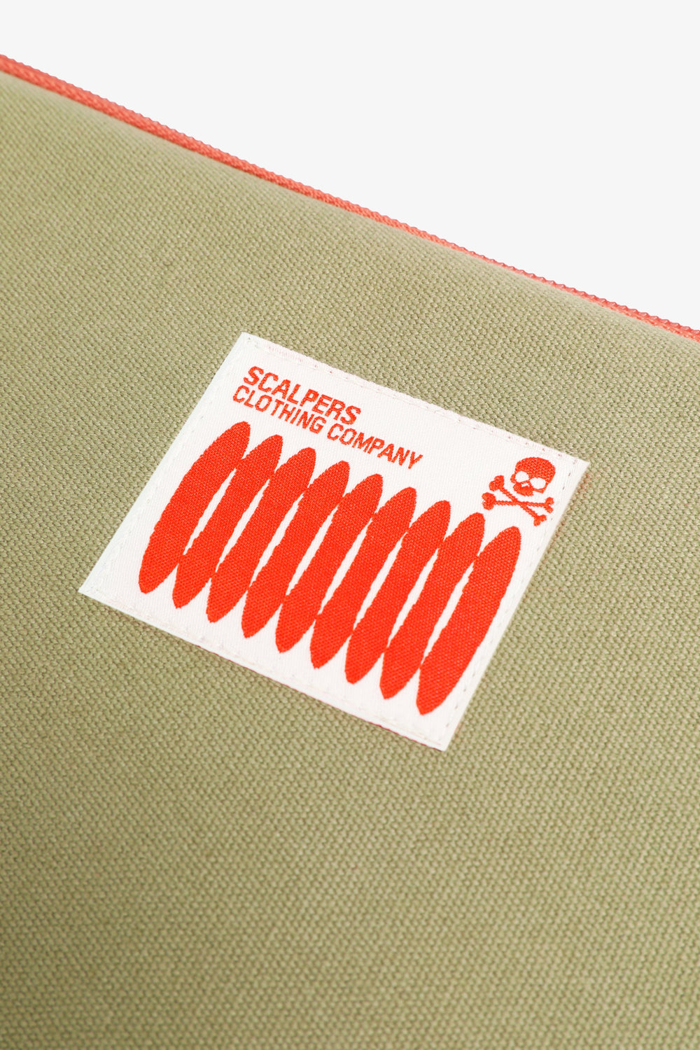 Pasta confecionada em 100% algodão. Remendo de padrão frontal com logótipo. Fecho com zip em contraste.