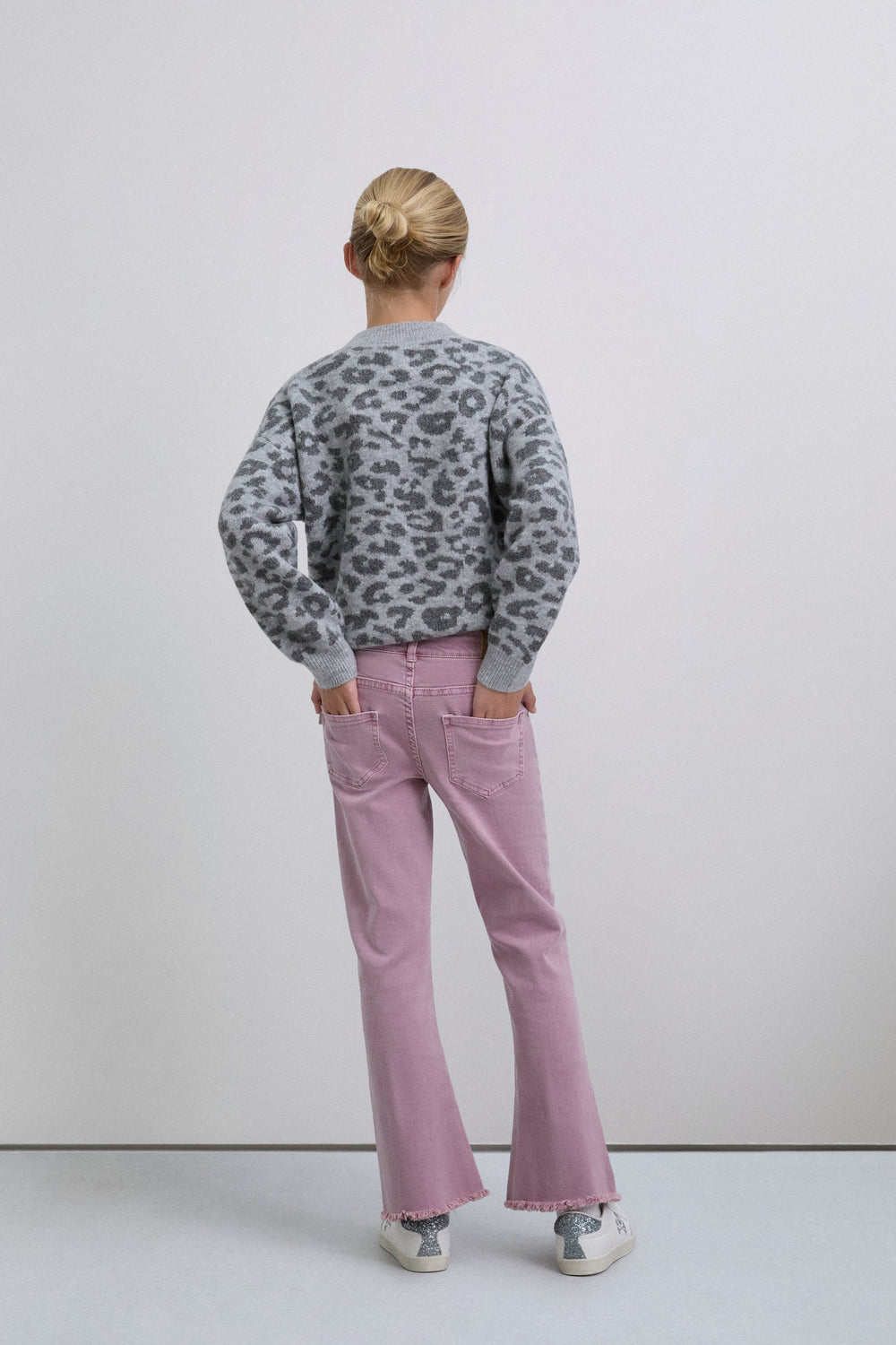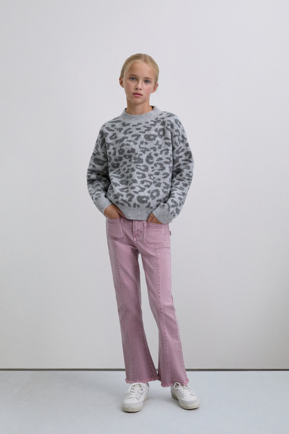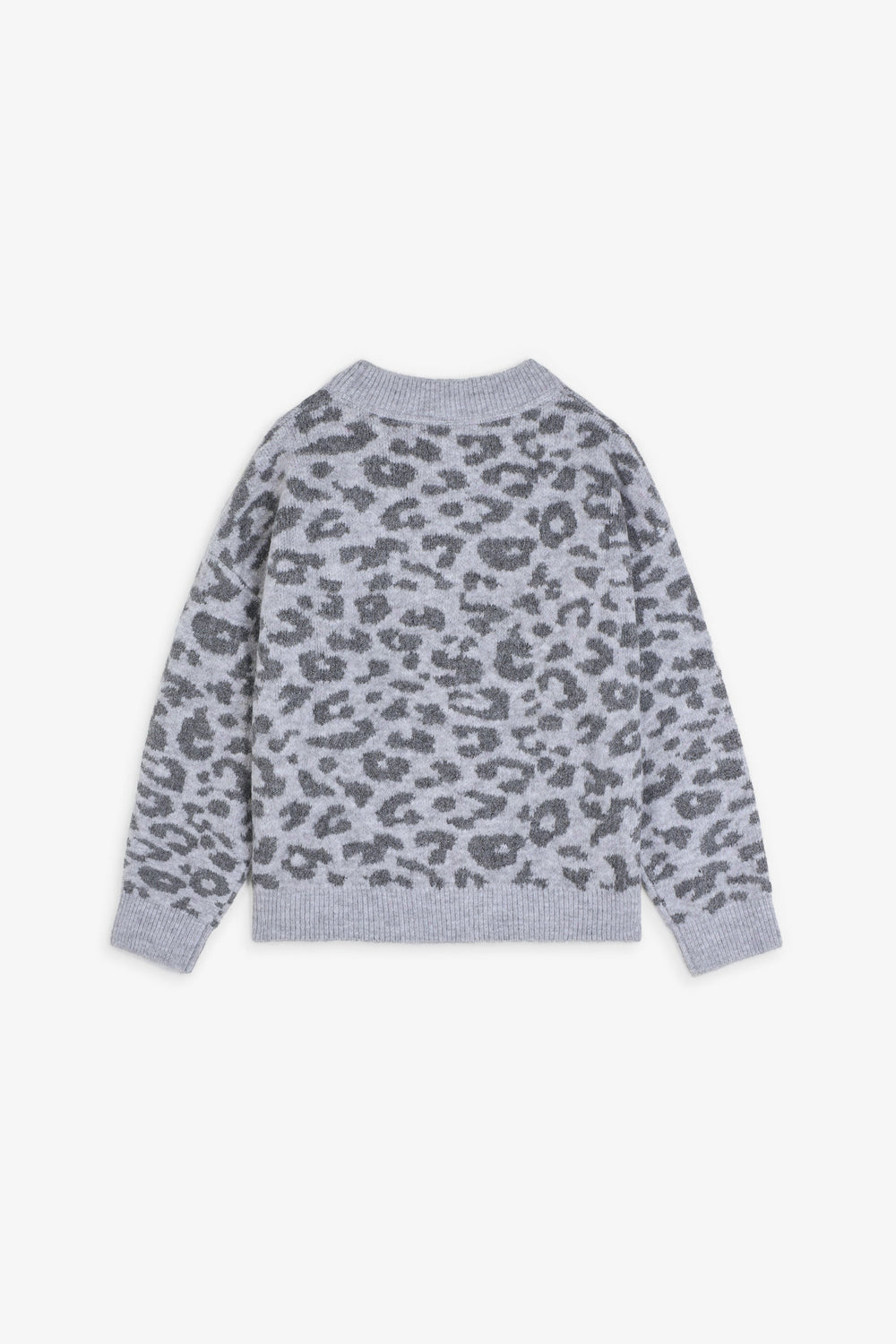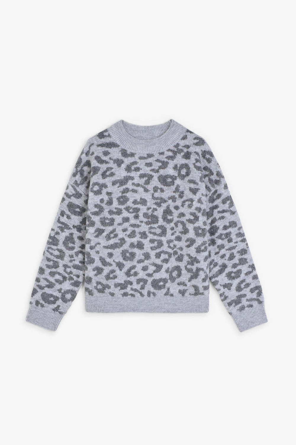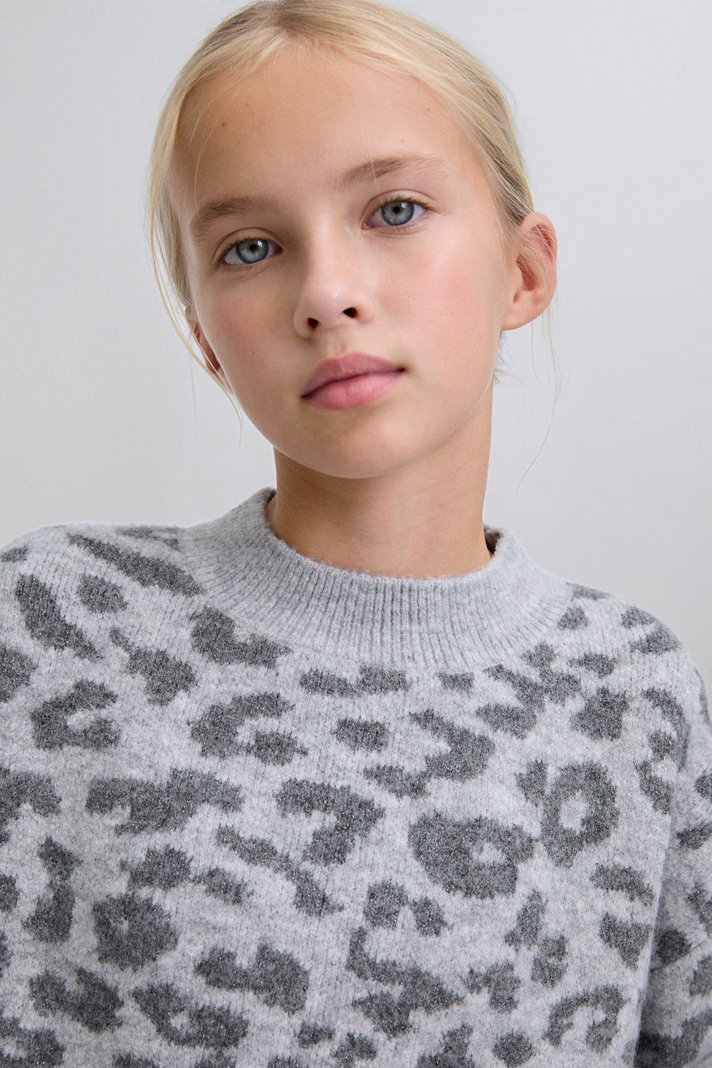 Sweater de malha. Manga comprida. Decote redondo. Padrão de estampado animal. Acabamentos em nervuras em contraste.