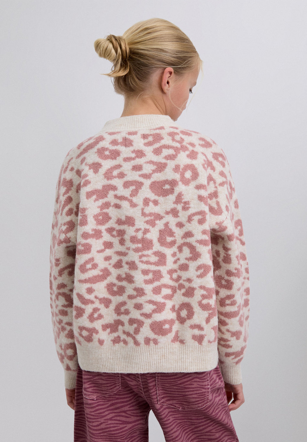 Sweater de malha. Manga comprida. Decote redondo. Padrão de estampado animal. Acabamentos em nervuras em contraste.