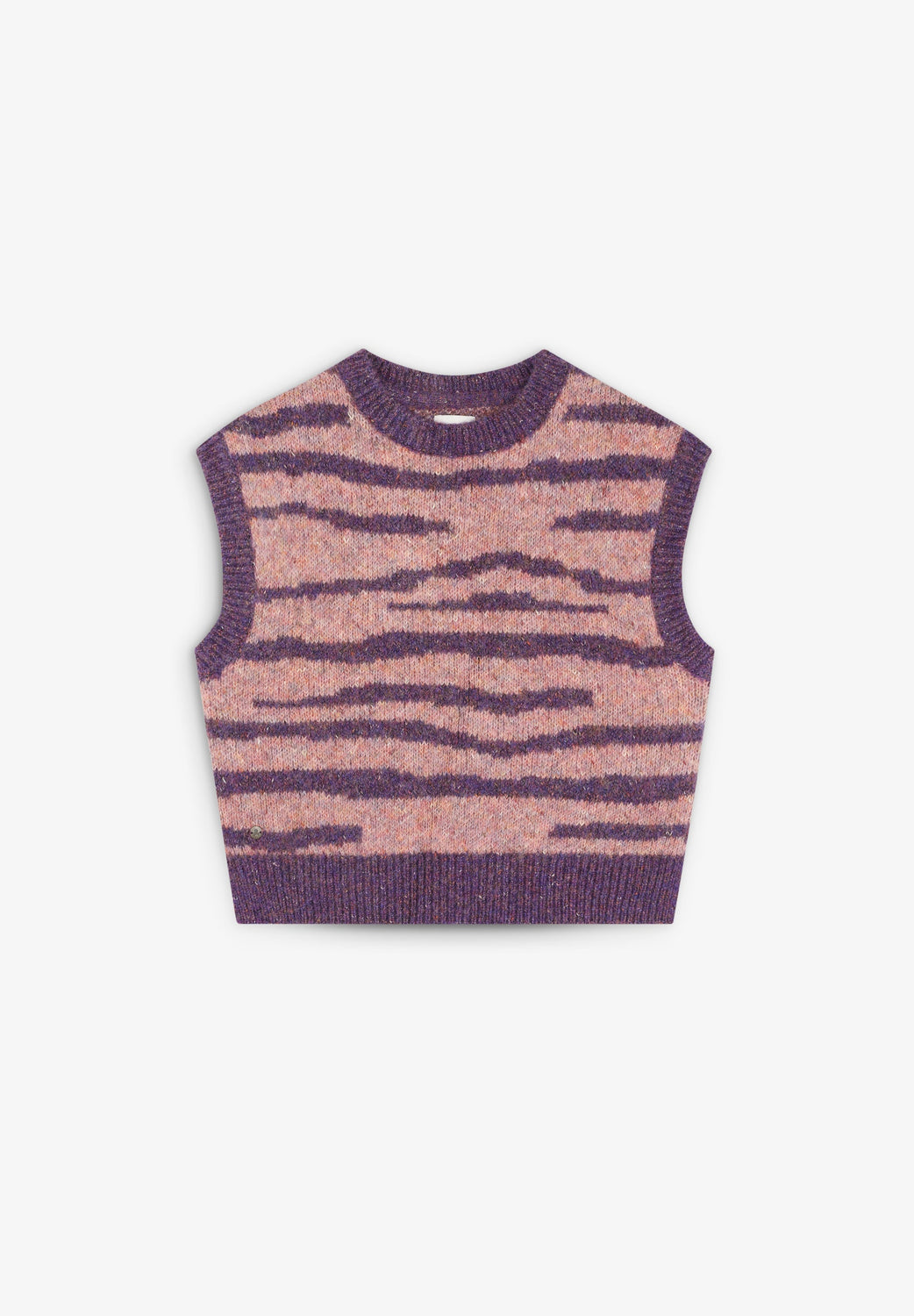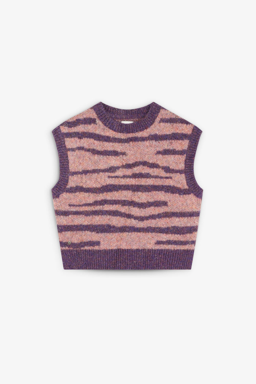 Colete de malha. Decote redondo. Acabamentos em nervuras em contraste. Padrão de estampado animal.