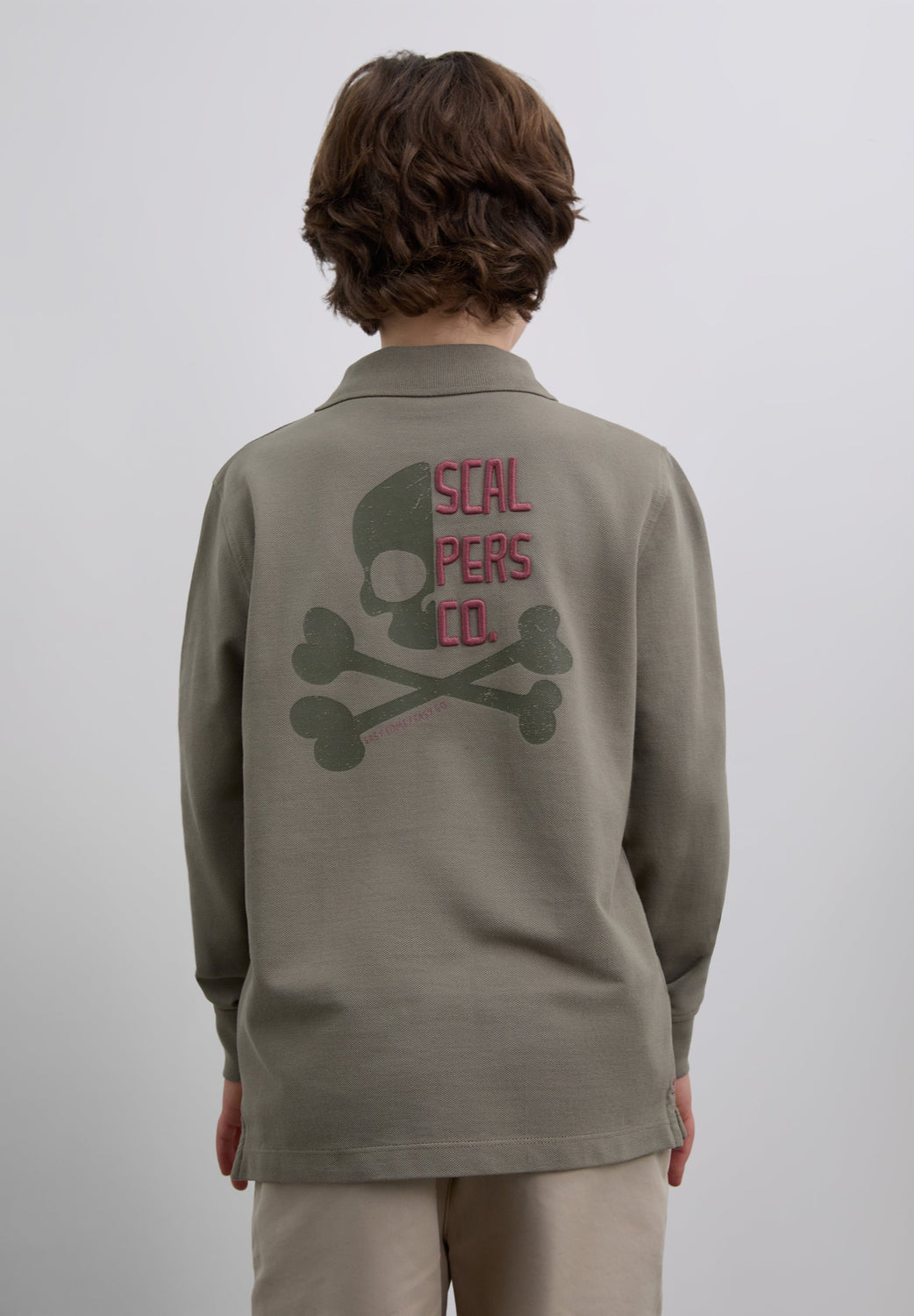 Camisa polo confecionada em 100% algodão BCI. Regular fit. Manga comprida. Colarinho clássico com botões. Logótipo bordado atrás e padrão com skull. Pormenor de remendo bordado frontal interior.