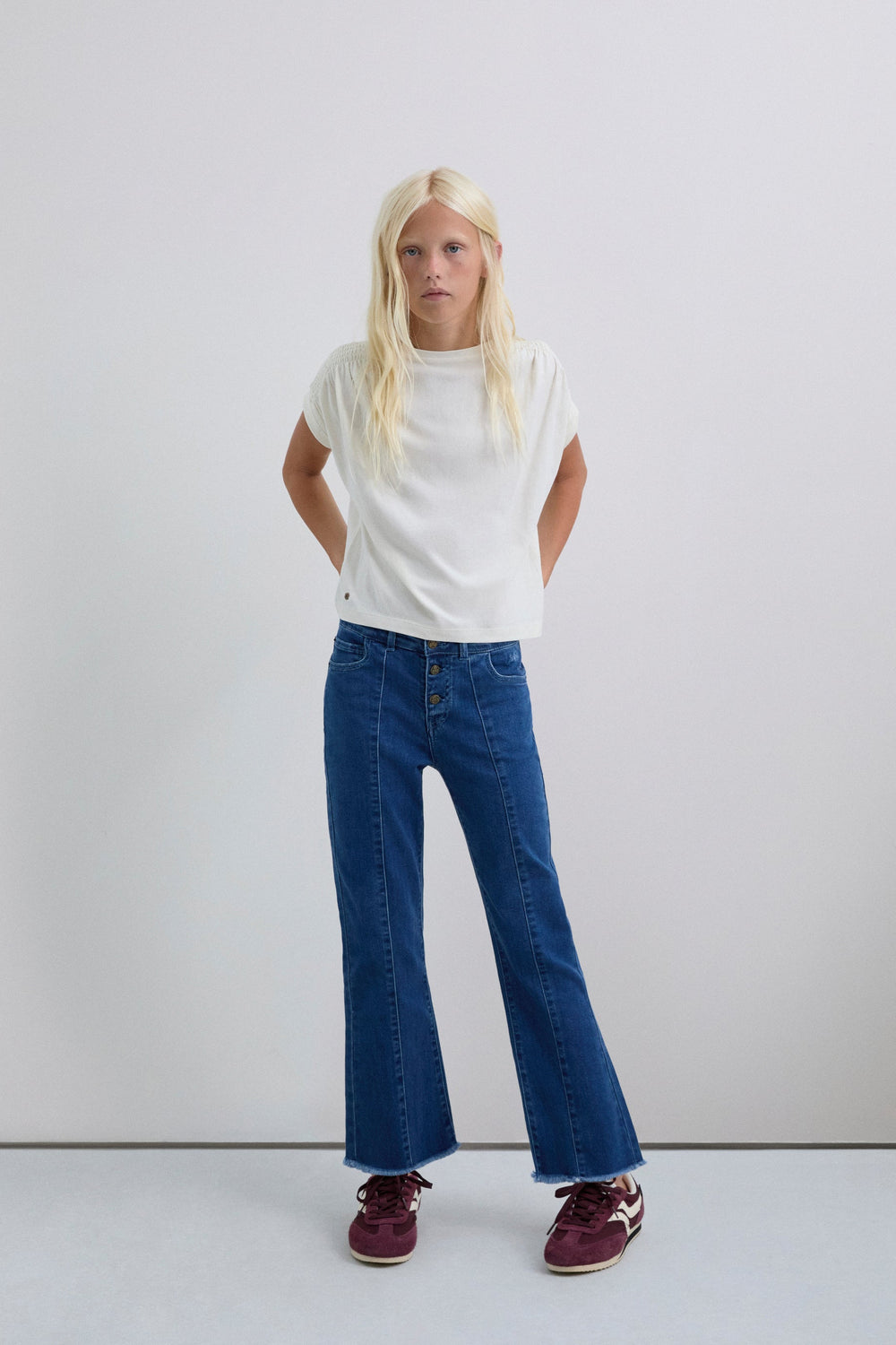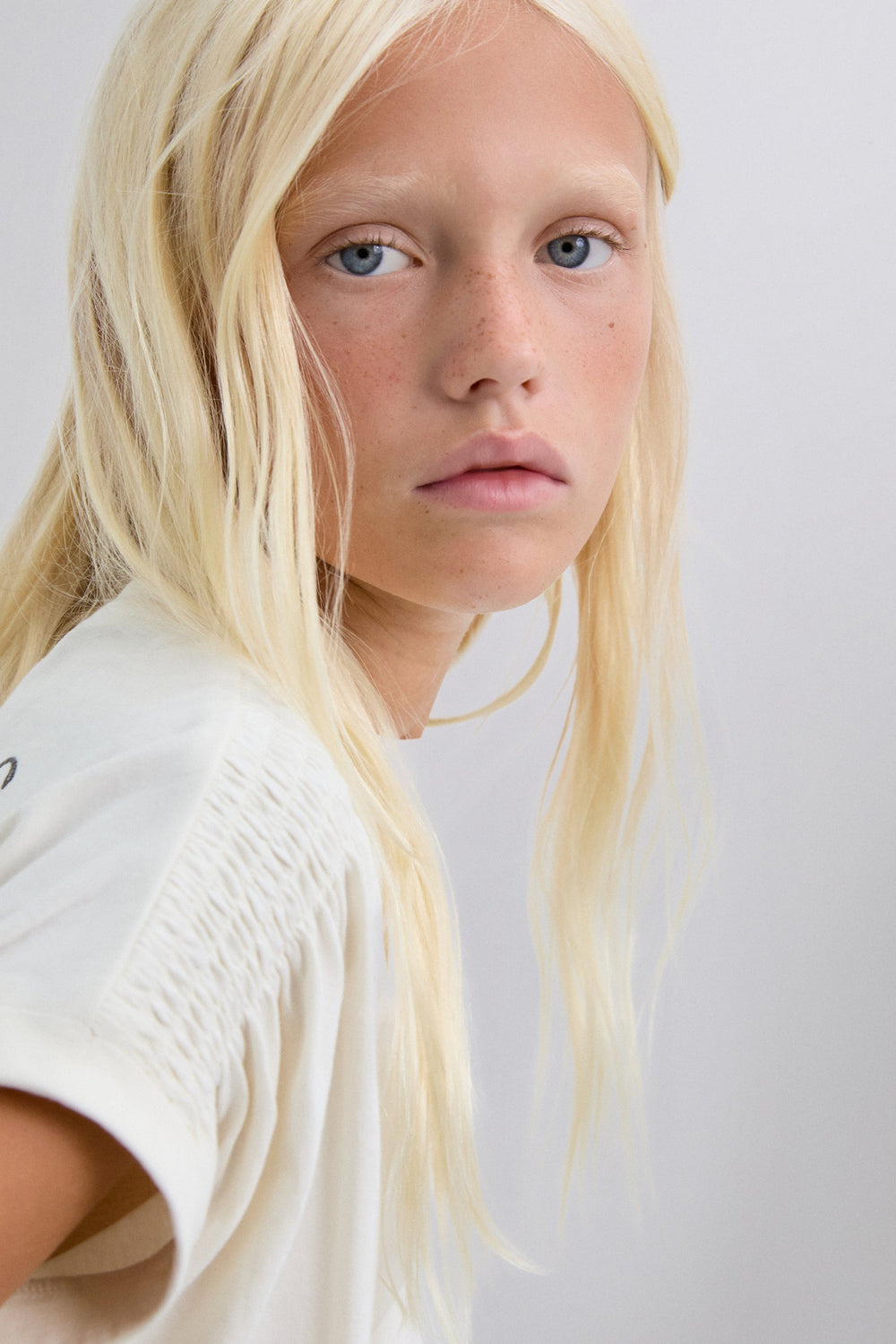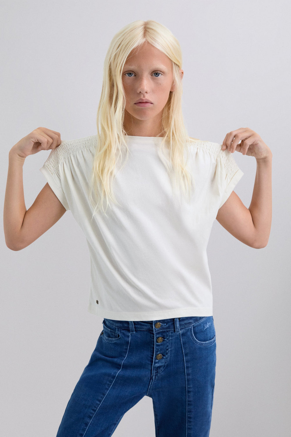 T-shirt confecionada em 100% algodão BCI. Manga curta. Decote redondo. Pormenor de franzido na manga e skull metálica na cintura. Padrão atrás com logótipo bordado.
