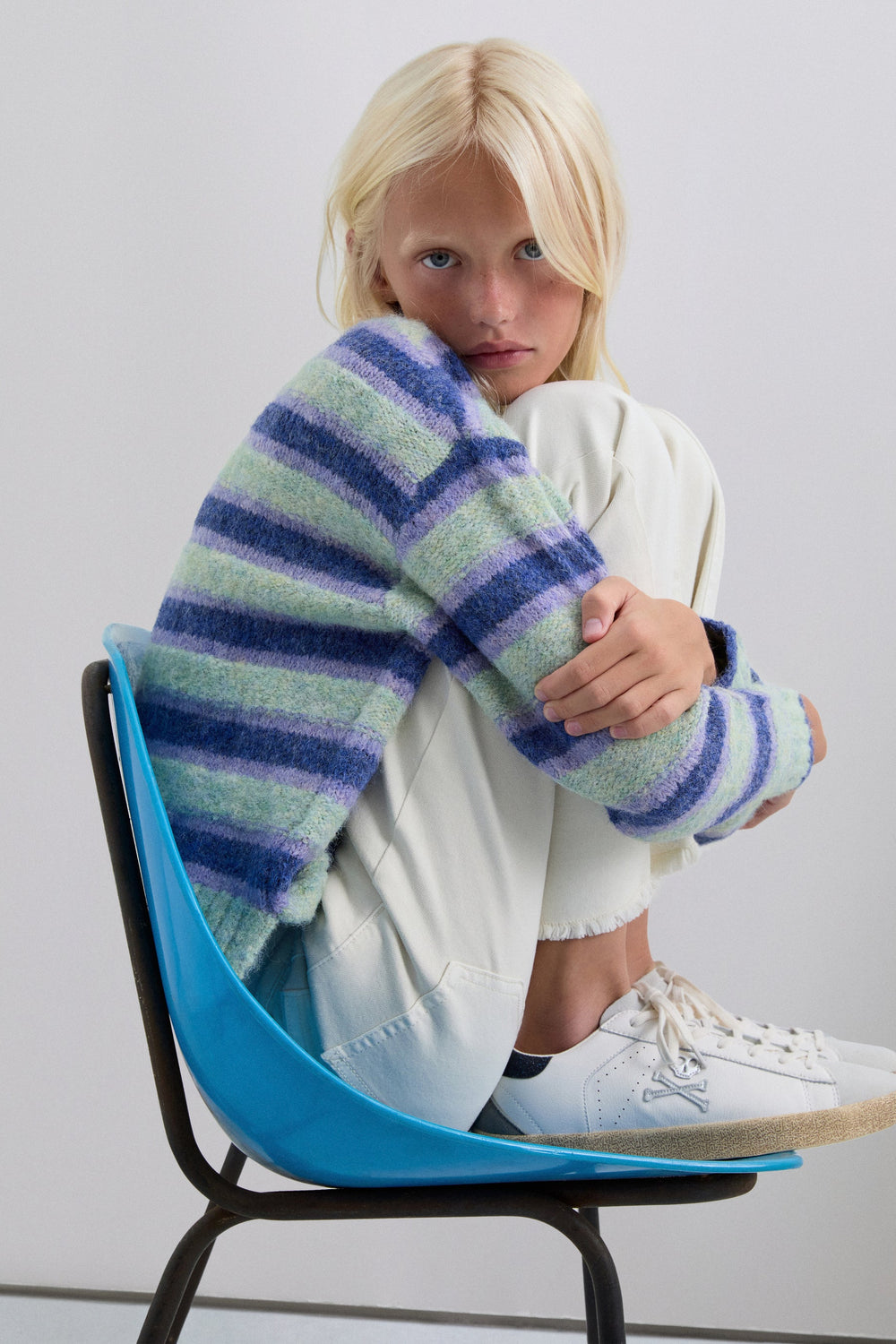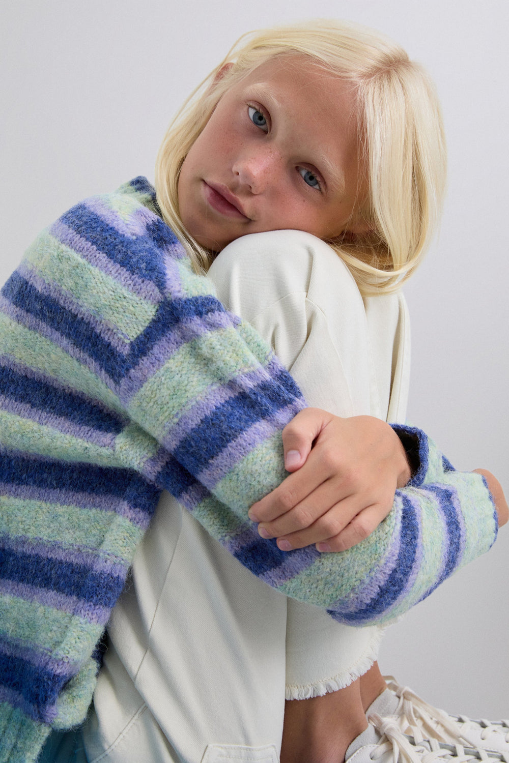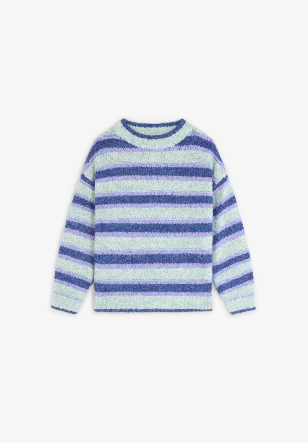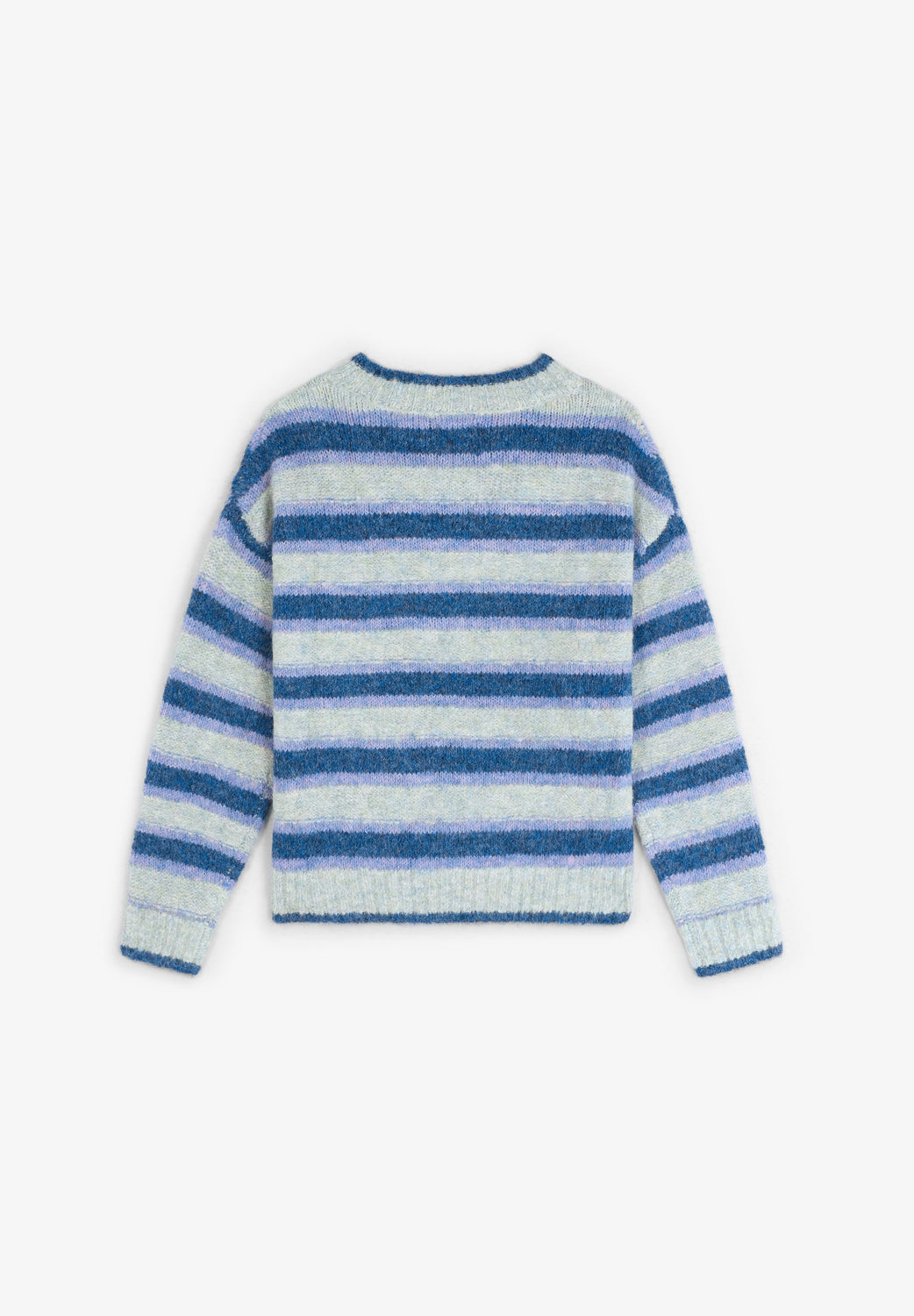 Sweater de malha com estampado às riscas. Manga comprida. Decote redondo. Acabamentos em nervuras.