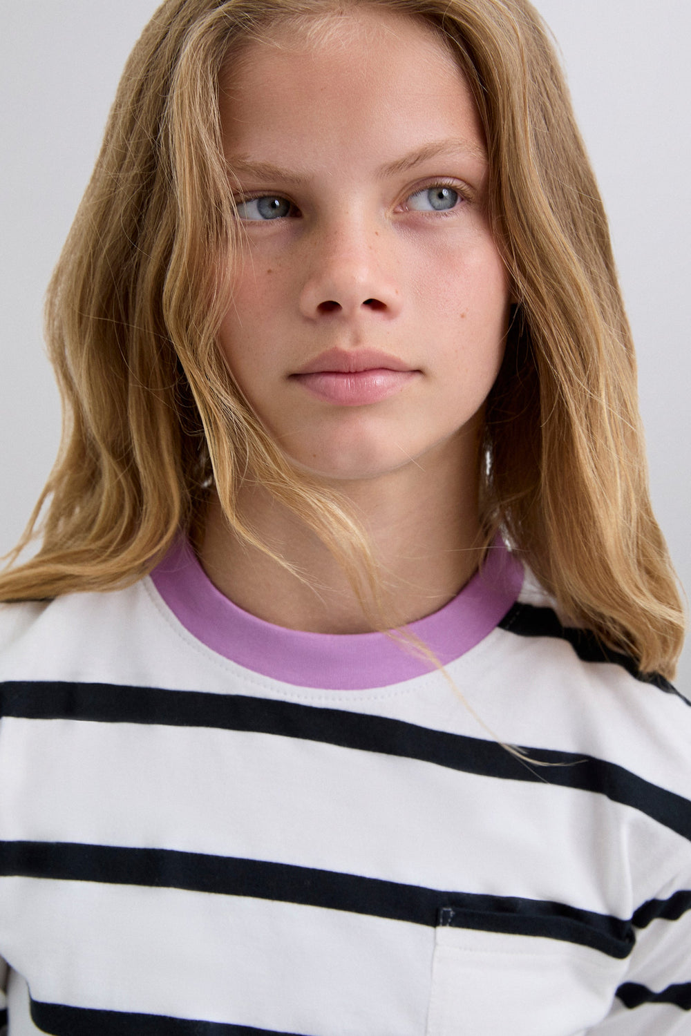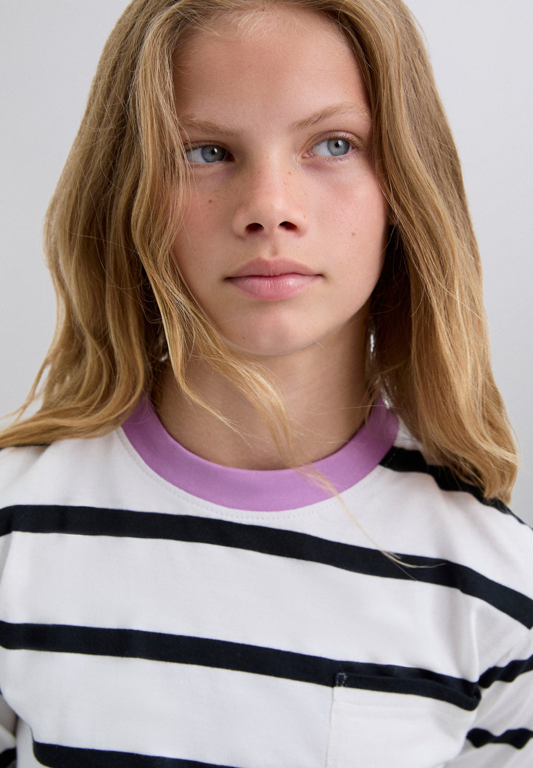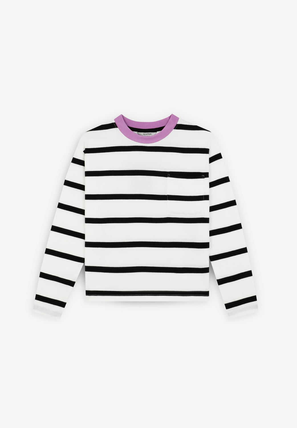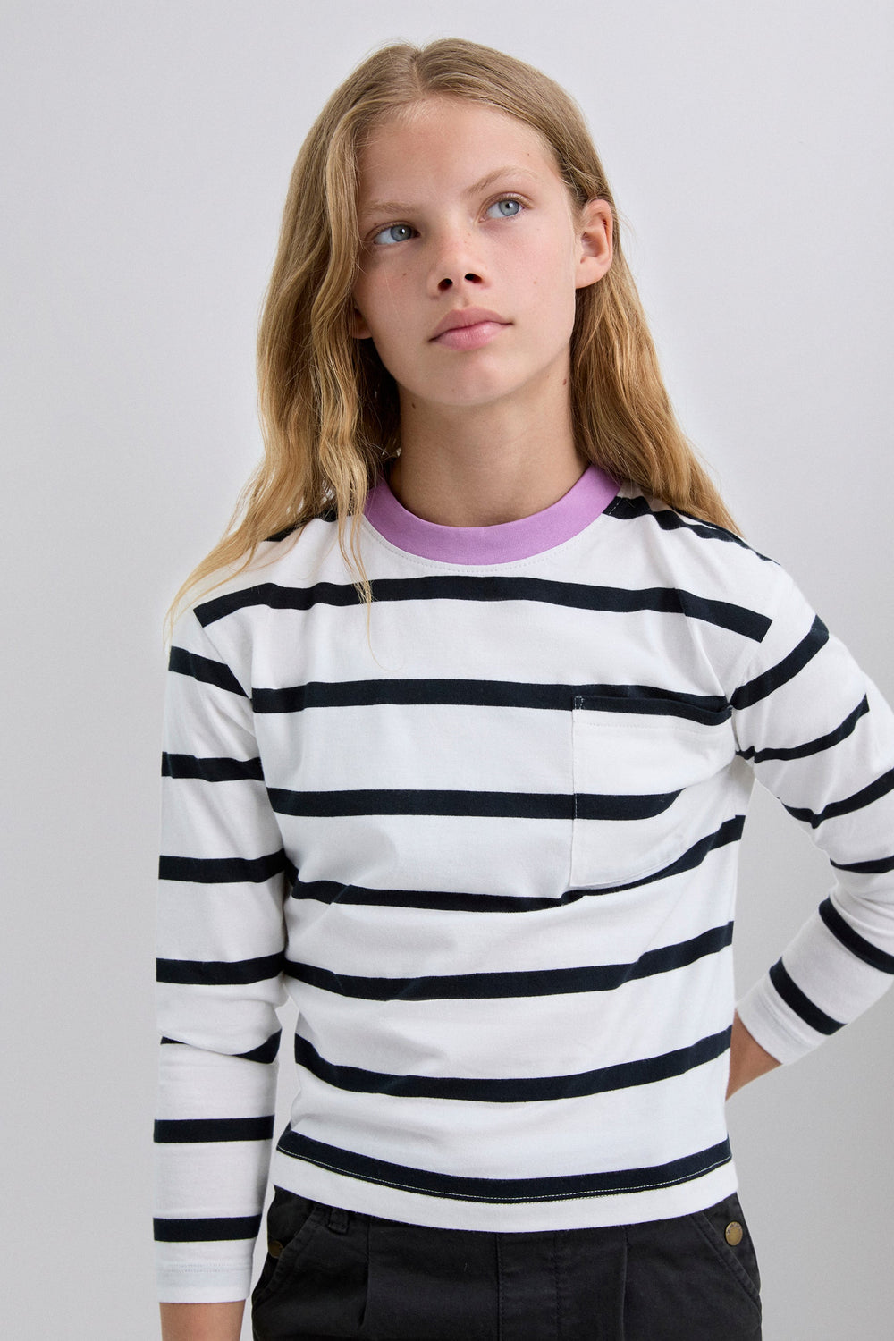 T-shirt às riscas confecionada em 100% algodão BCI. Corte regular fit, decote redondo em contraste e manga comprida. Pormenor de bolso no peito e etiqueta com logótipo atrás.