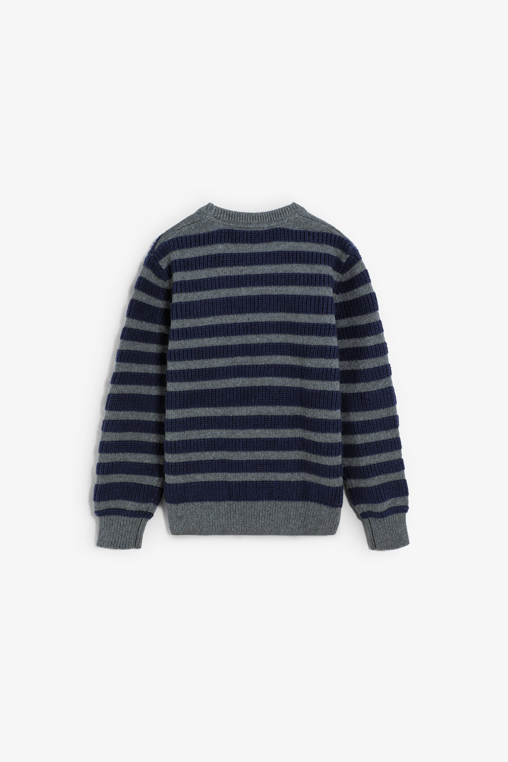 Sweater confecionada em 100% algodão BCI. Padrão às riscas. Decote redondo. Manga comprida. Acabamentos em nervuras.