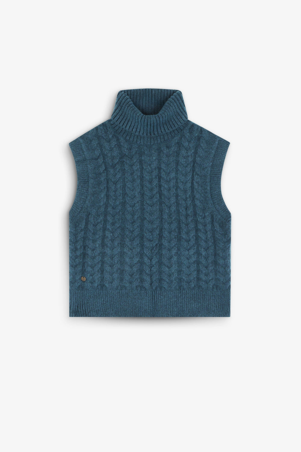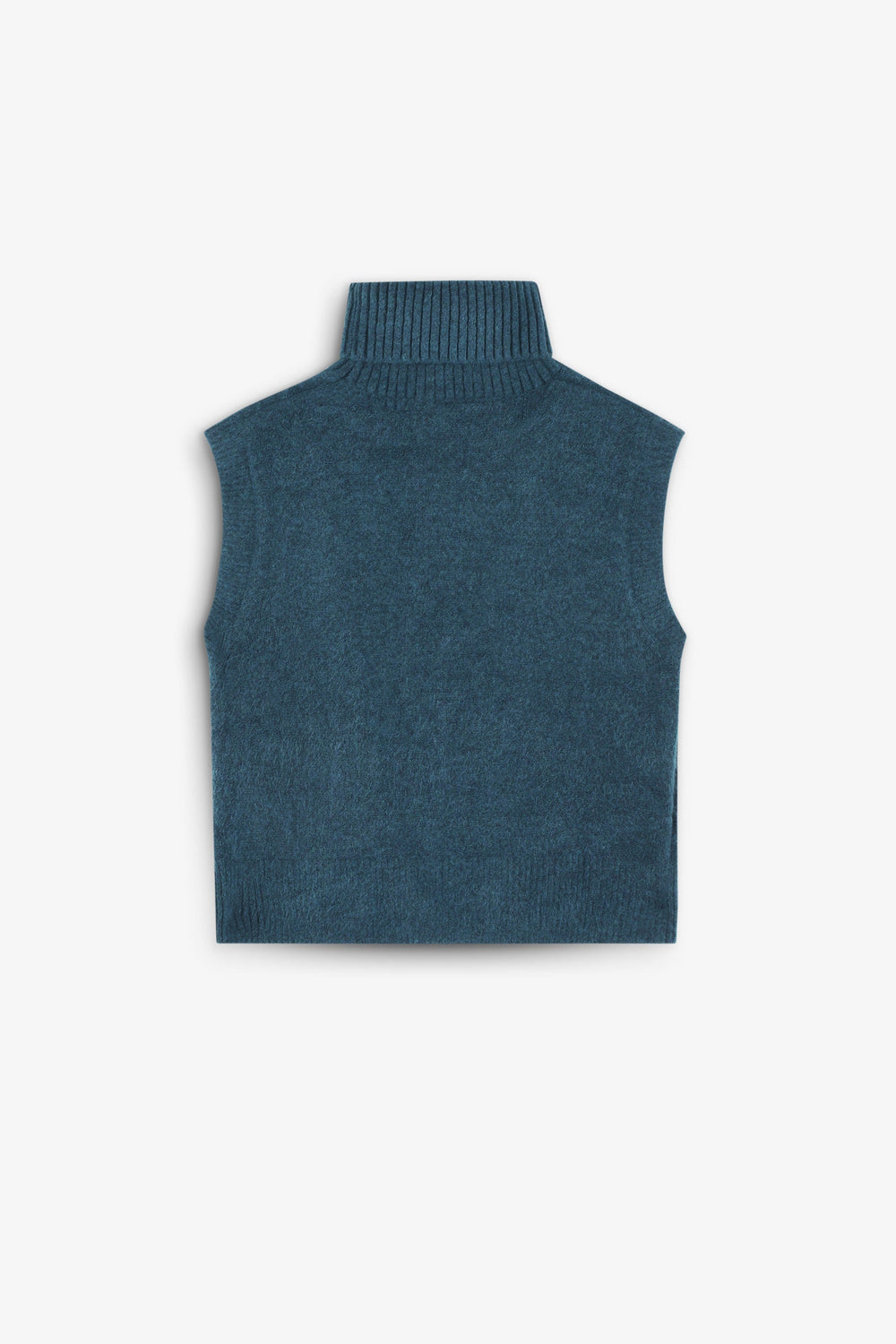 Colete de malha. Gola dobrada. Acabamentos em nervuras. Pormenor de skull em chapa metálica.