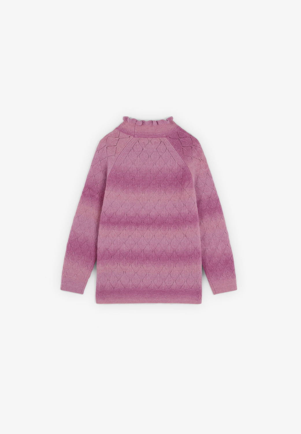 Sweater de malha confecionada em mistura de lã merino. Gola alta com folhos. Manga comprida com acabamentos canelados. Motivo perfurado textura diamante.