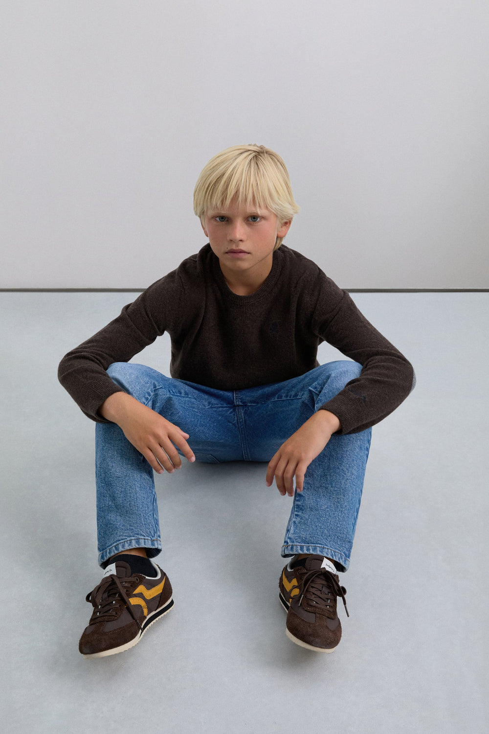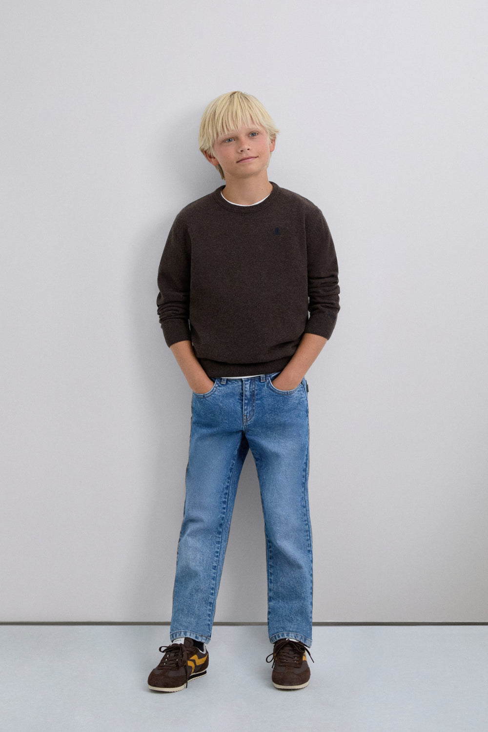 Sweater confecionada em mistura de lã e poliamida. Corte regular fit. Decote redondo. Manga comprida. Pormenor de skull bordada em contraste. Acabamentos em nervuras. Pormenor de remendo com skull nas cotoveleiras em contraste.