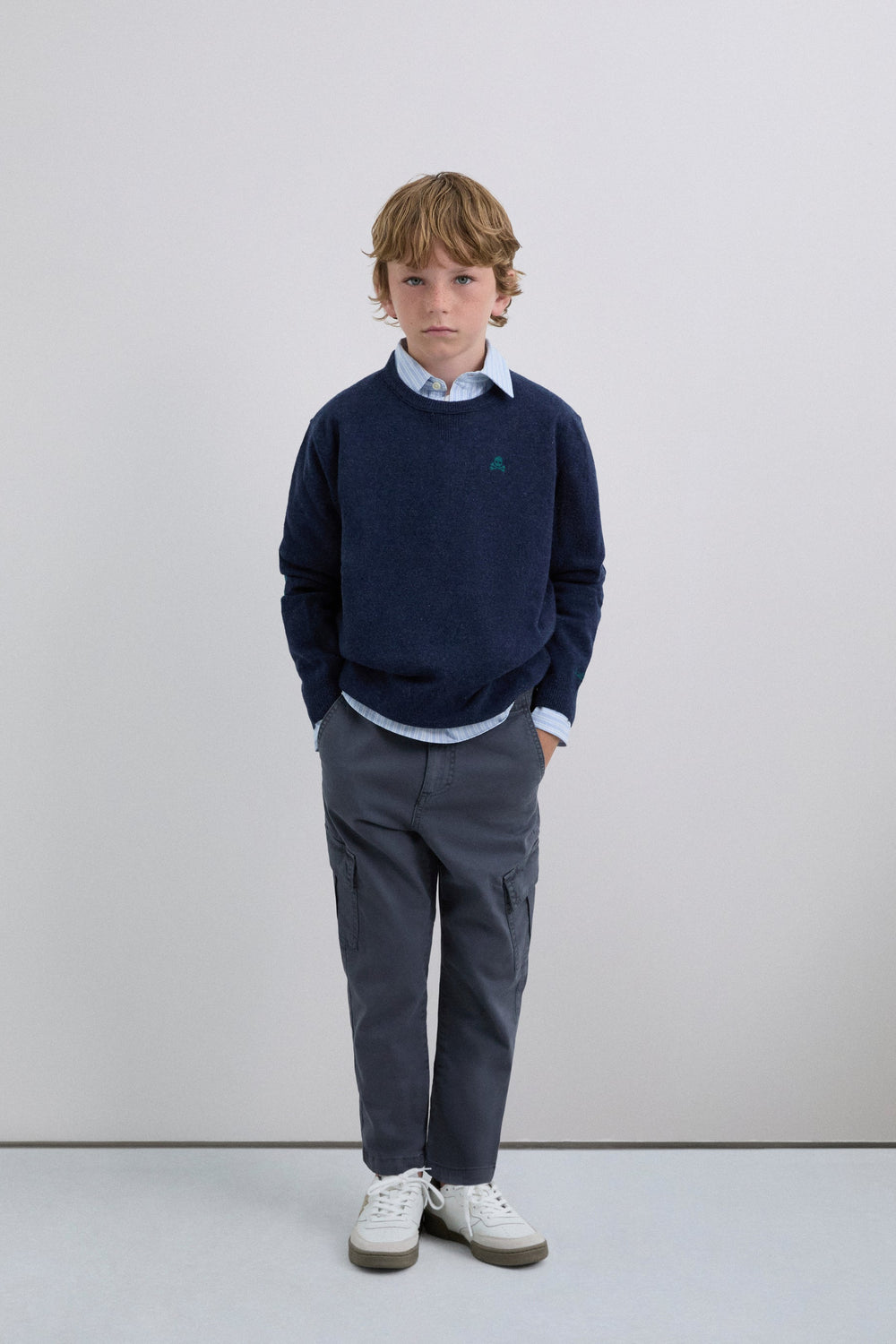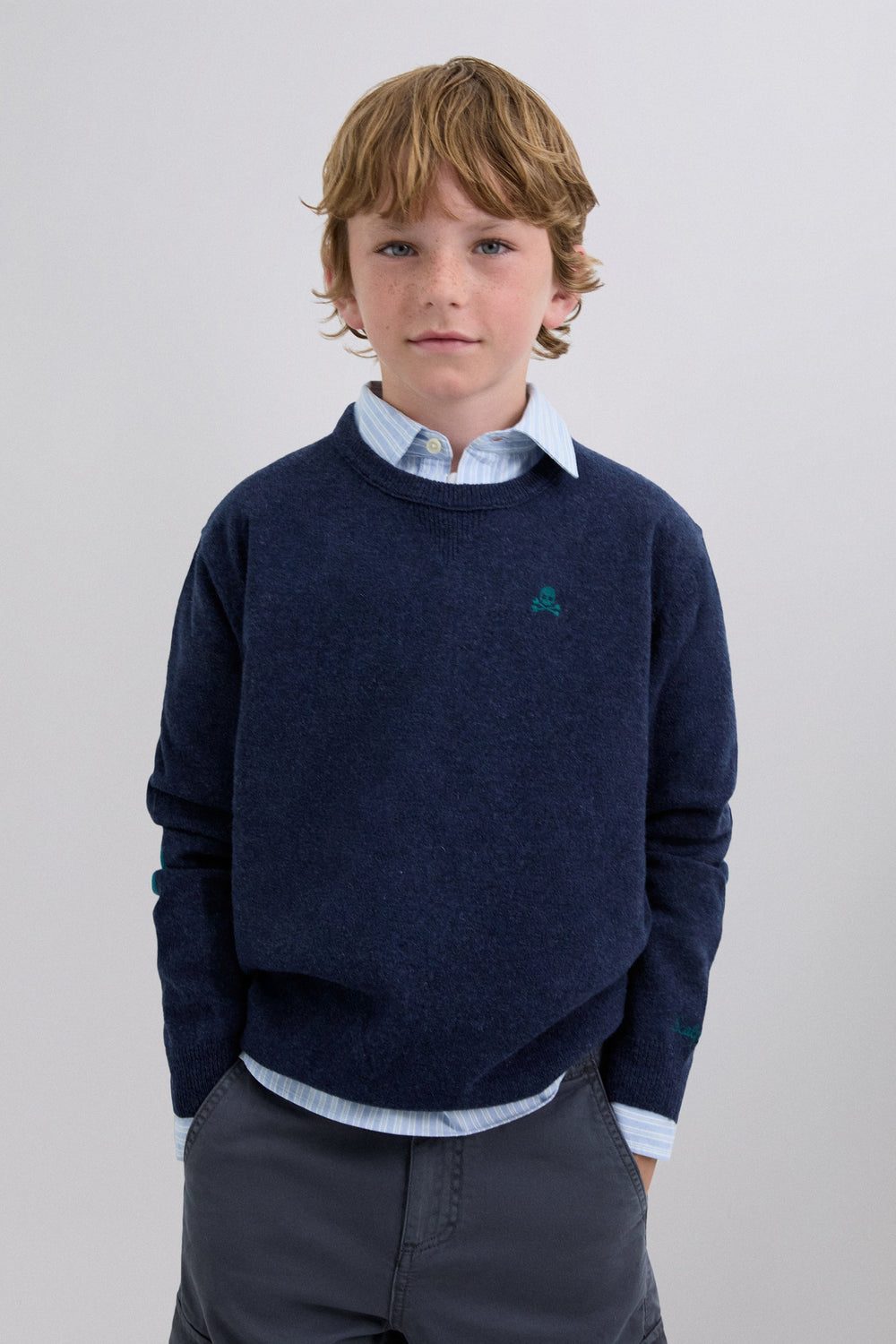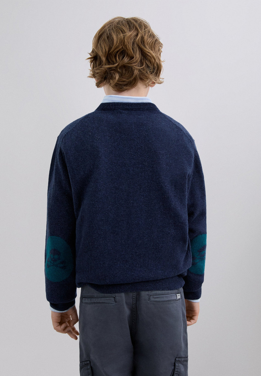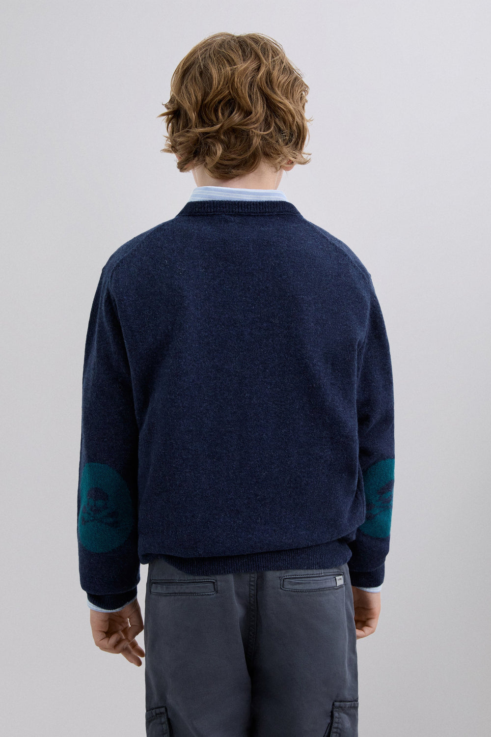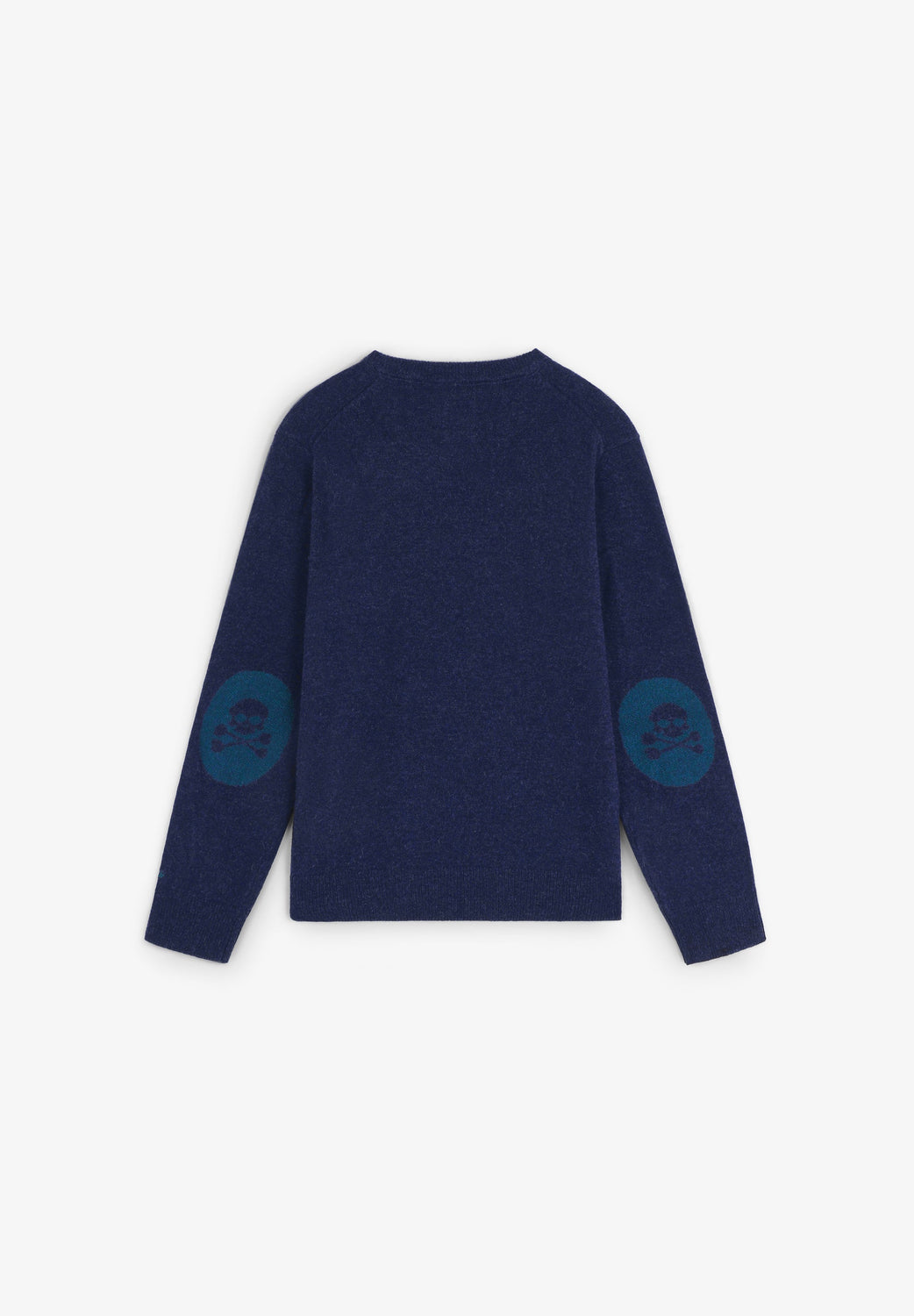 Sweater confecionada em mistura de lã e poliamida. Corte regular fit. Decote redondo. Manga comprida. Pormenor de skull bordada em contraste. Acabamentos em nervuras. Pormenor de skull nas cotoveleiras em contraste.