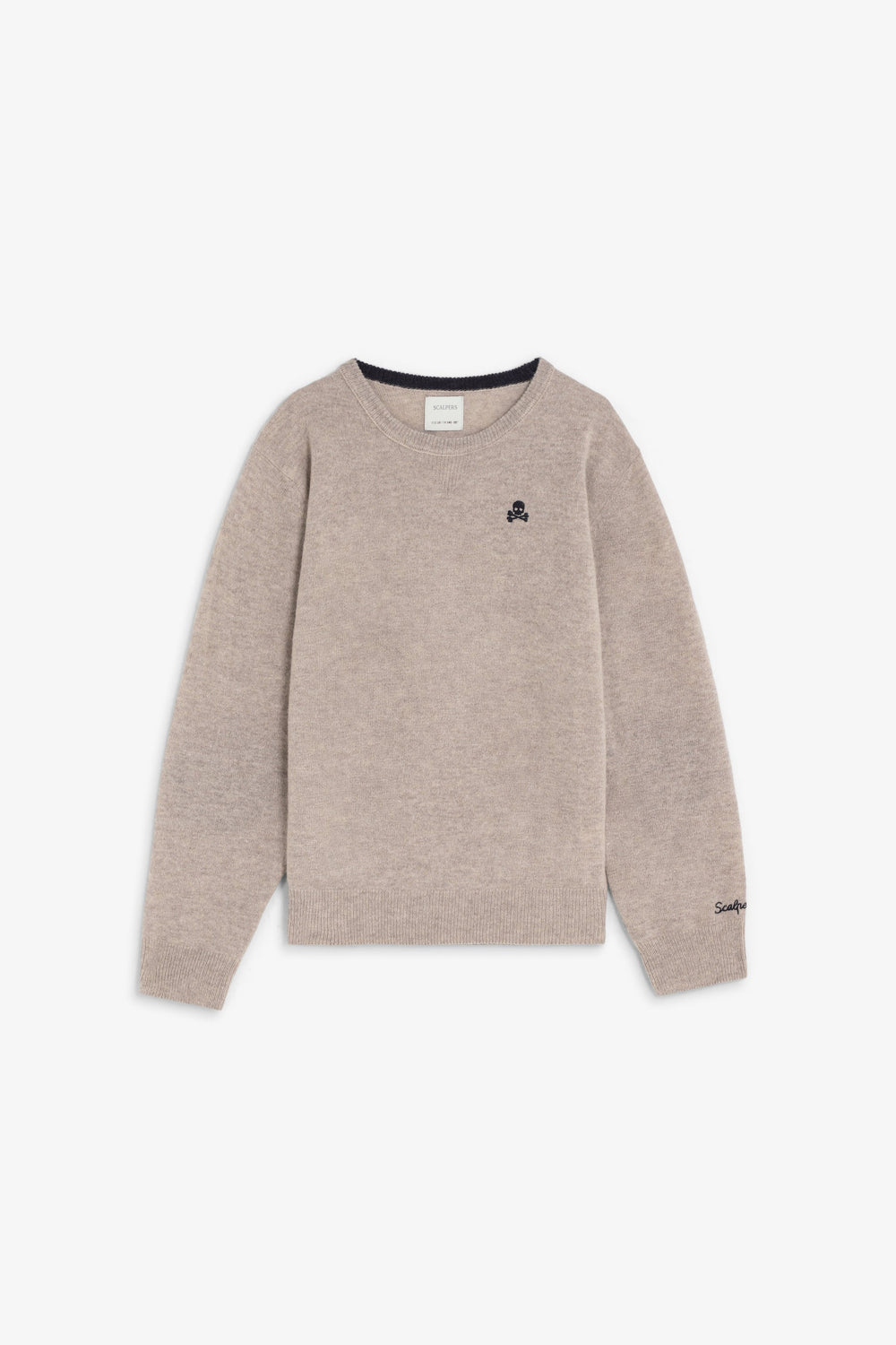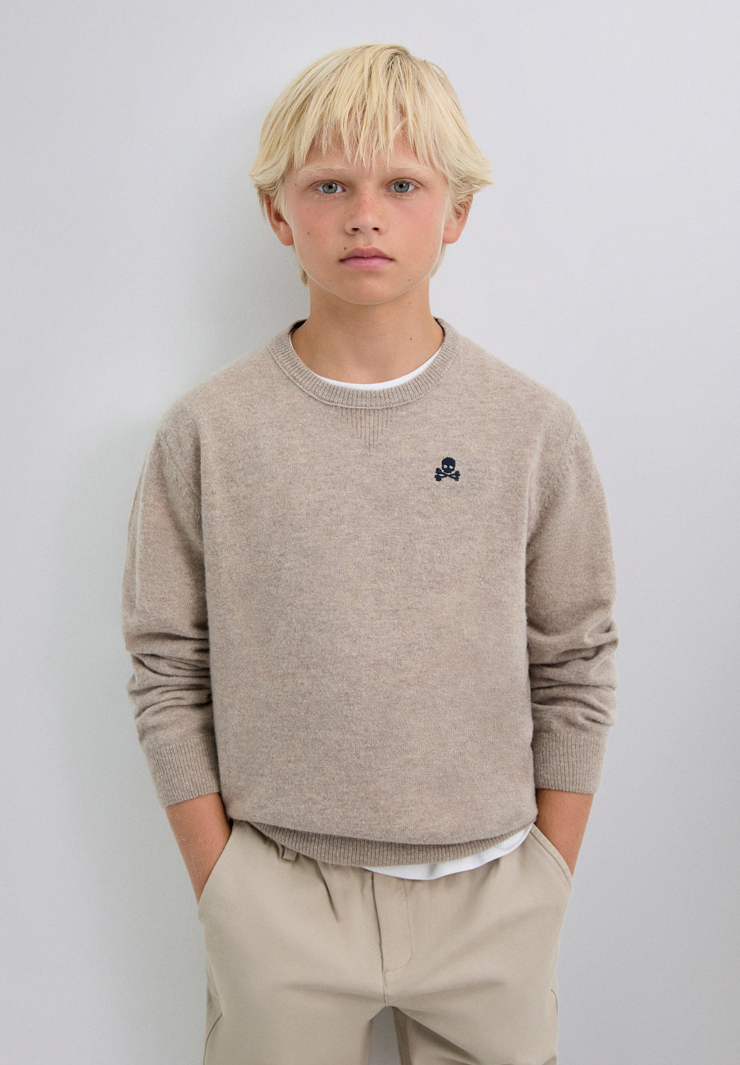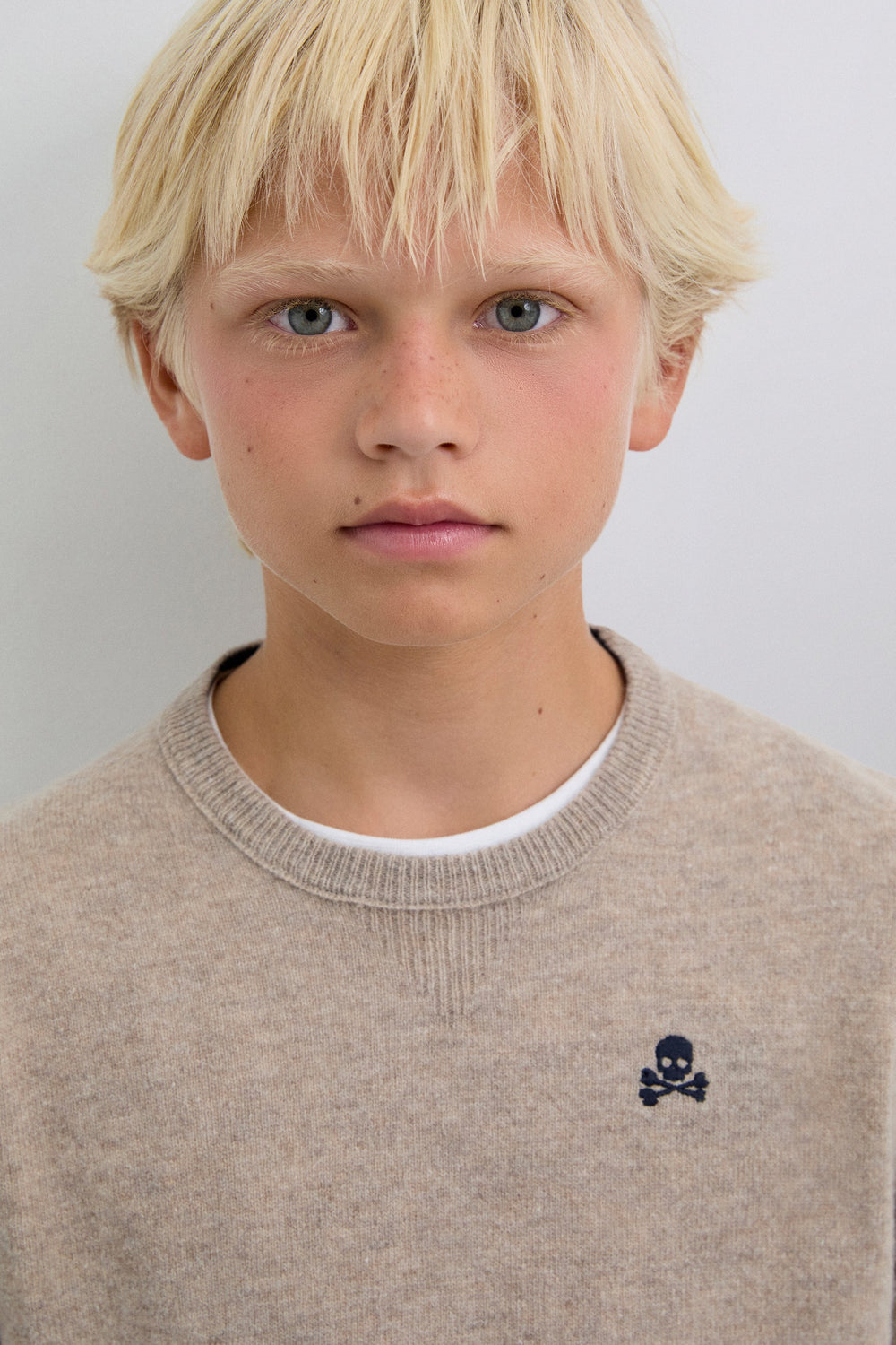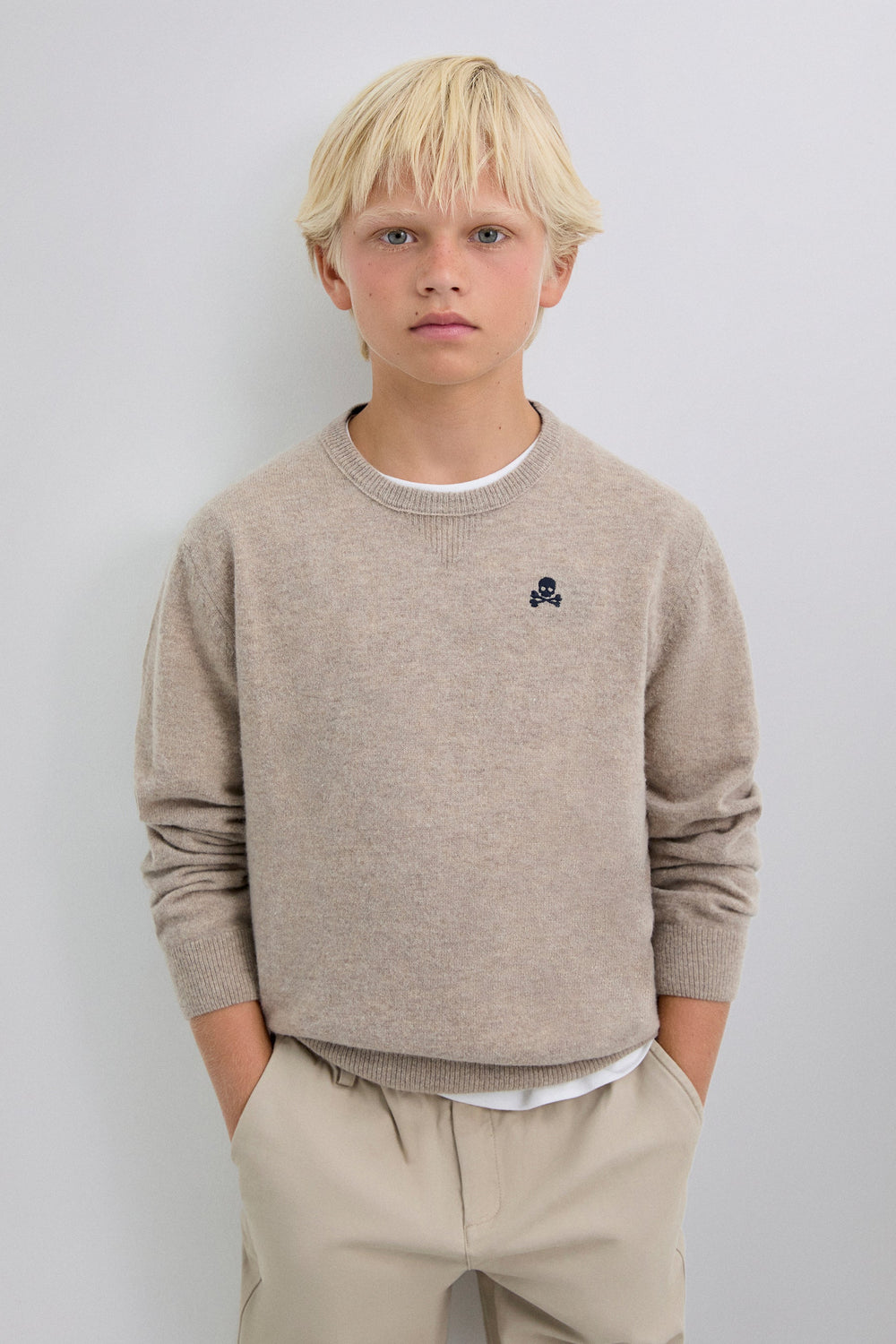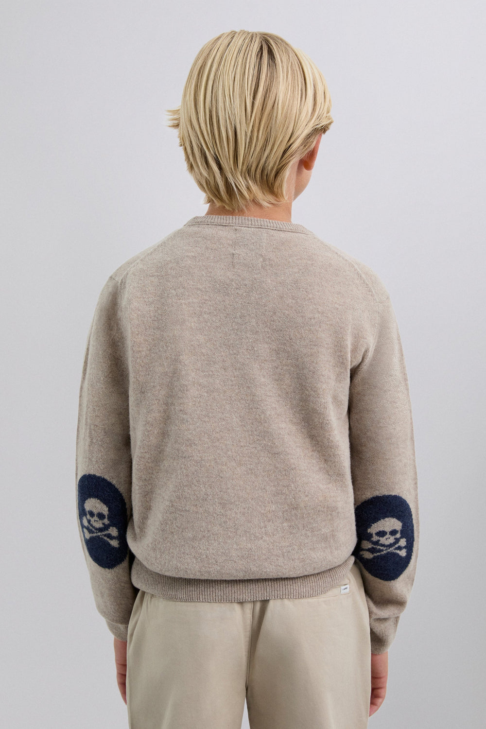 Sweater confecionada em mistura de lã e poliamida. Corte regular fit. Decote redondo. Manga comprida. Pormenor de skull bordada em contraste. Acabamentos em nervuras. Pormenor de remendo de skull nas cotoveleiras em contraste.
