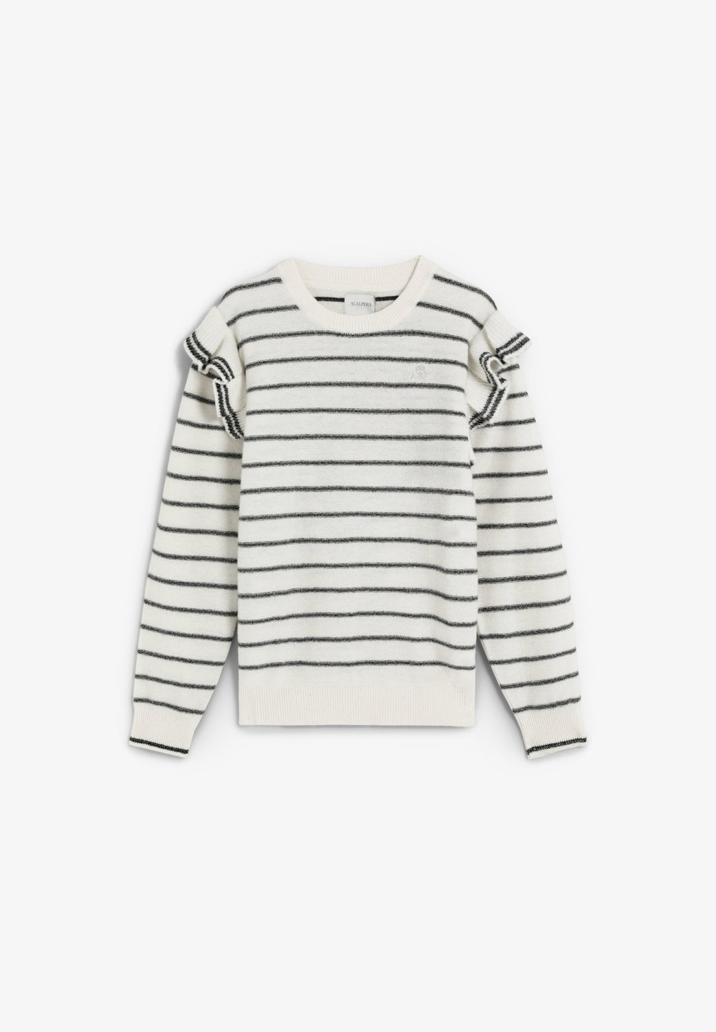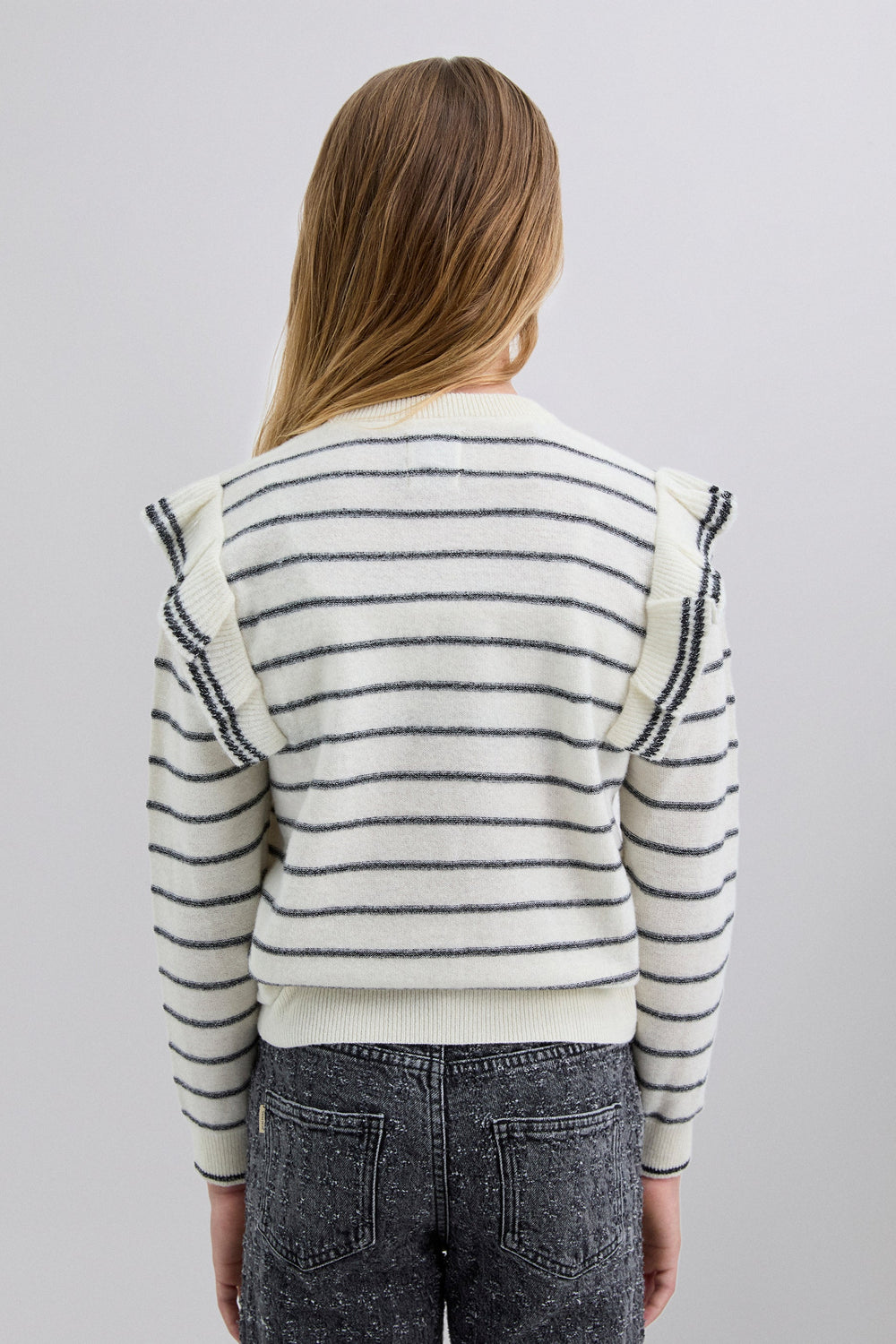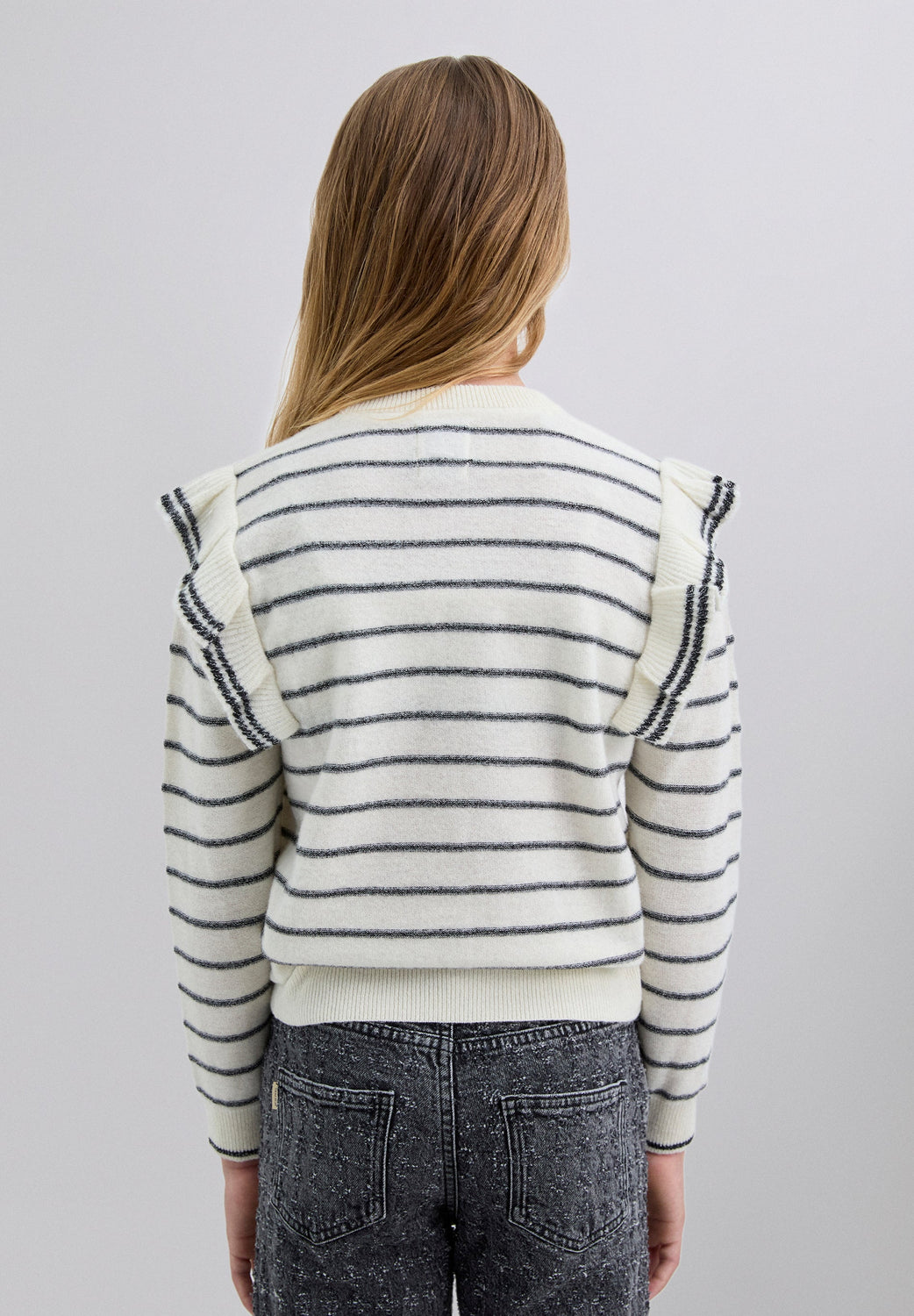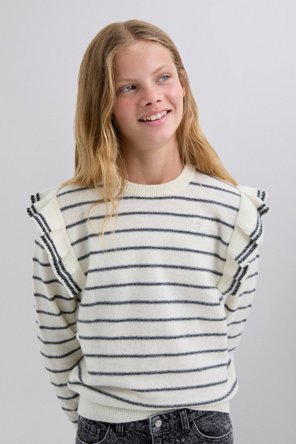 Sweater às riscas de malha confecionada em mistura de lã. Decote redondo. Corte regular fit. Pormenor de folhos nos ombros e logótipo no peito.