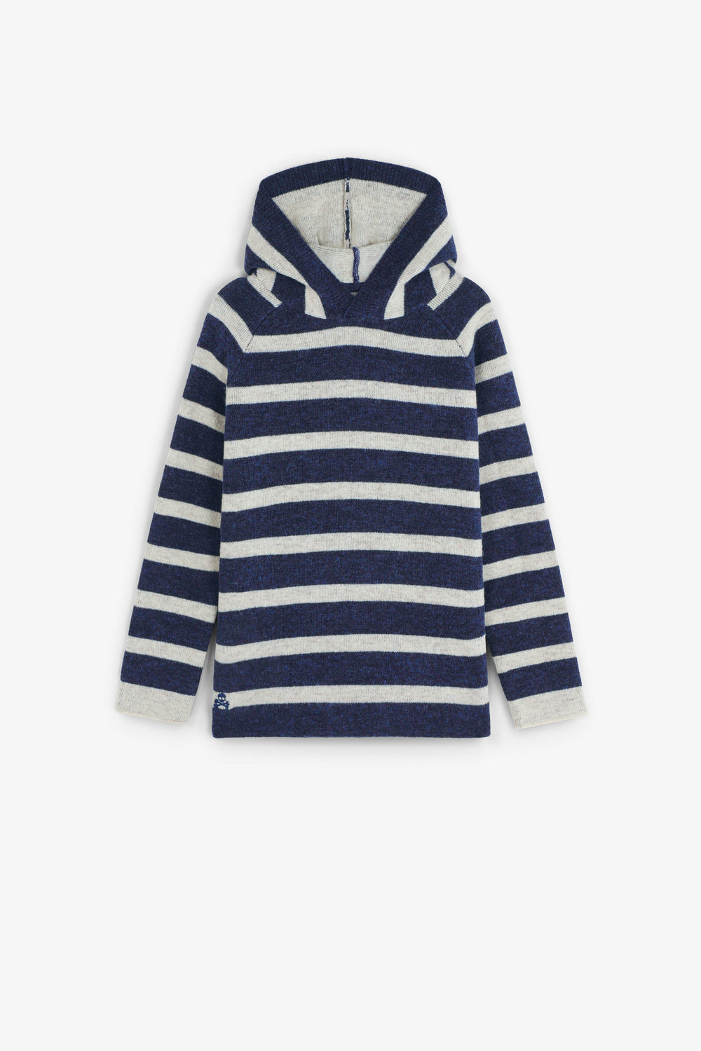 Sweater de malha com capuz. Padrão às riscas. Manga comprida. Skull bordada em contraste na cintura.