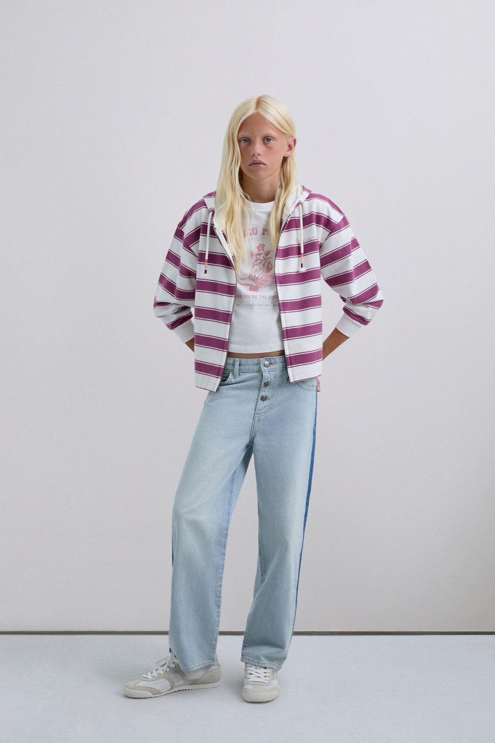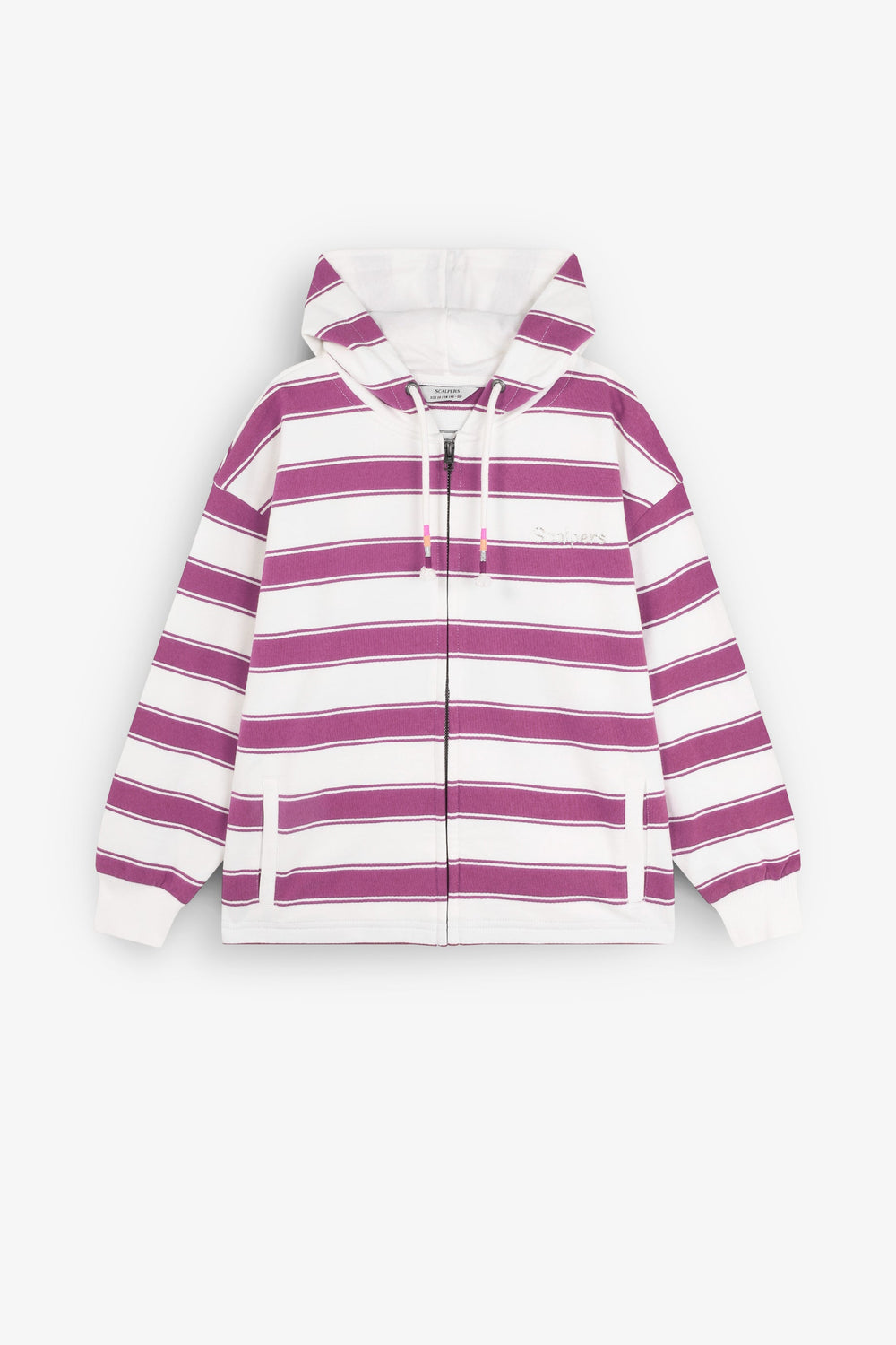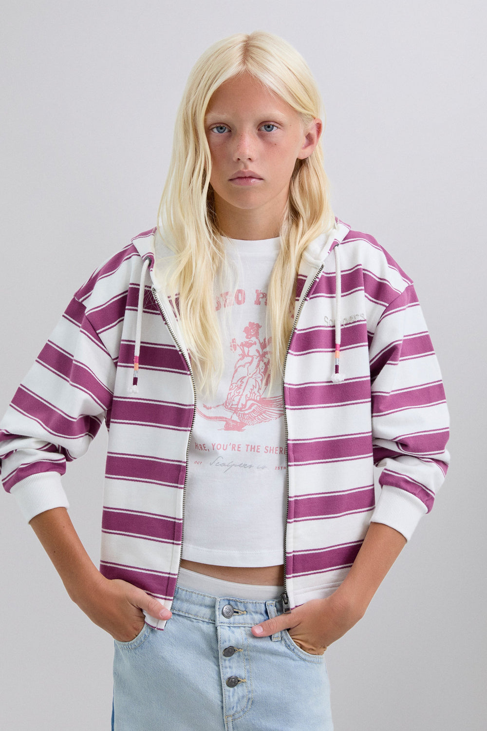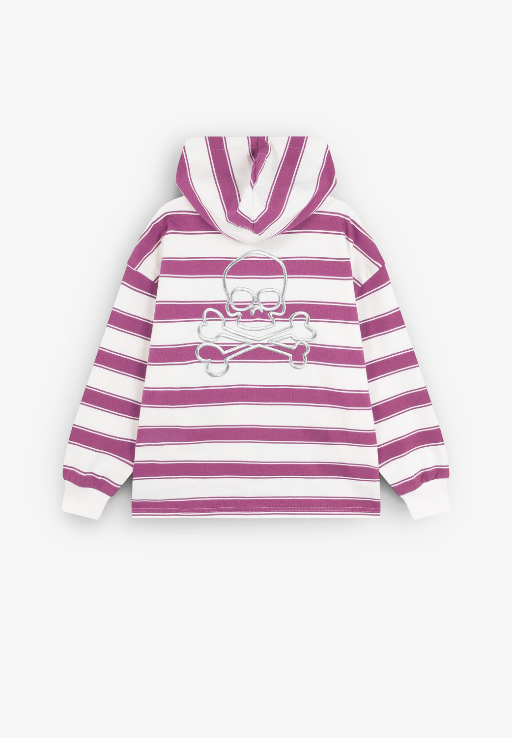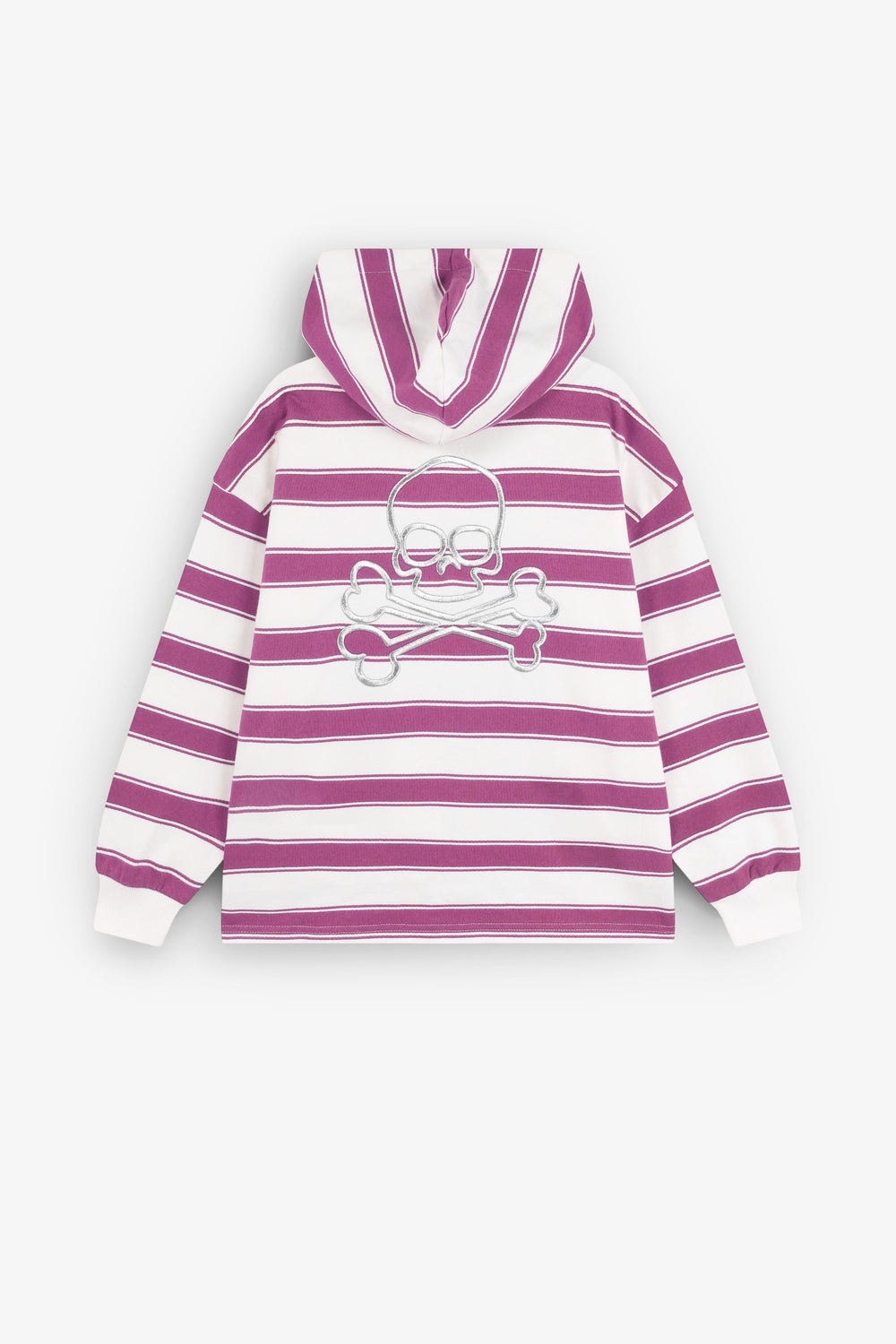 Sweatshirt confecionada em 100% algodão BCI. Capuz ajustável com cordão. Manga comprida. Fecho de correr. Padrão às riscas. Logótipo no peito e skull bordada nas costas.