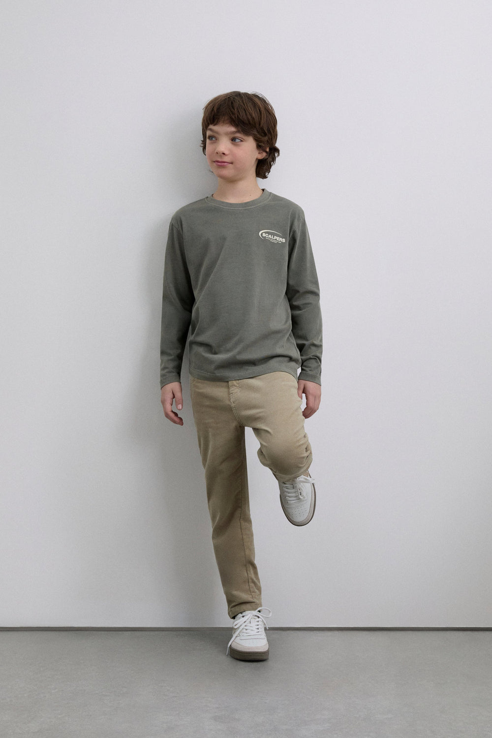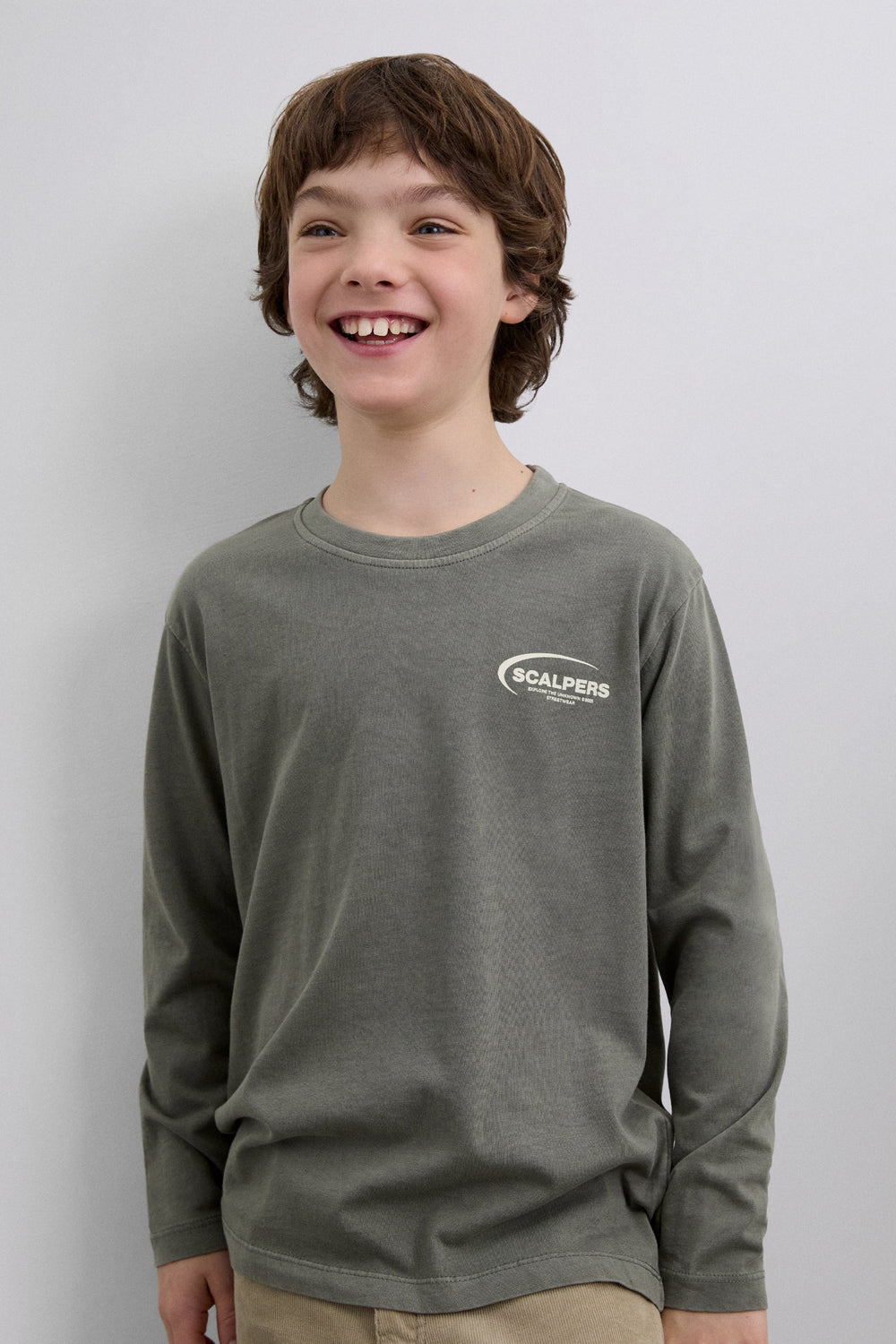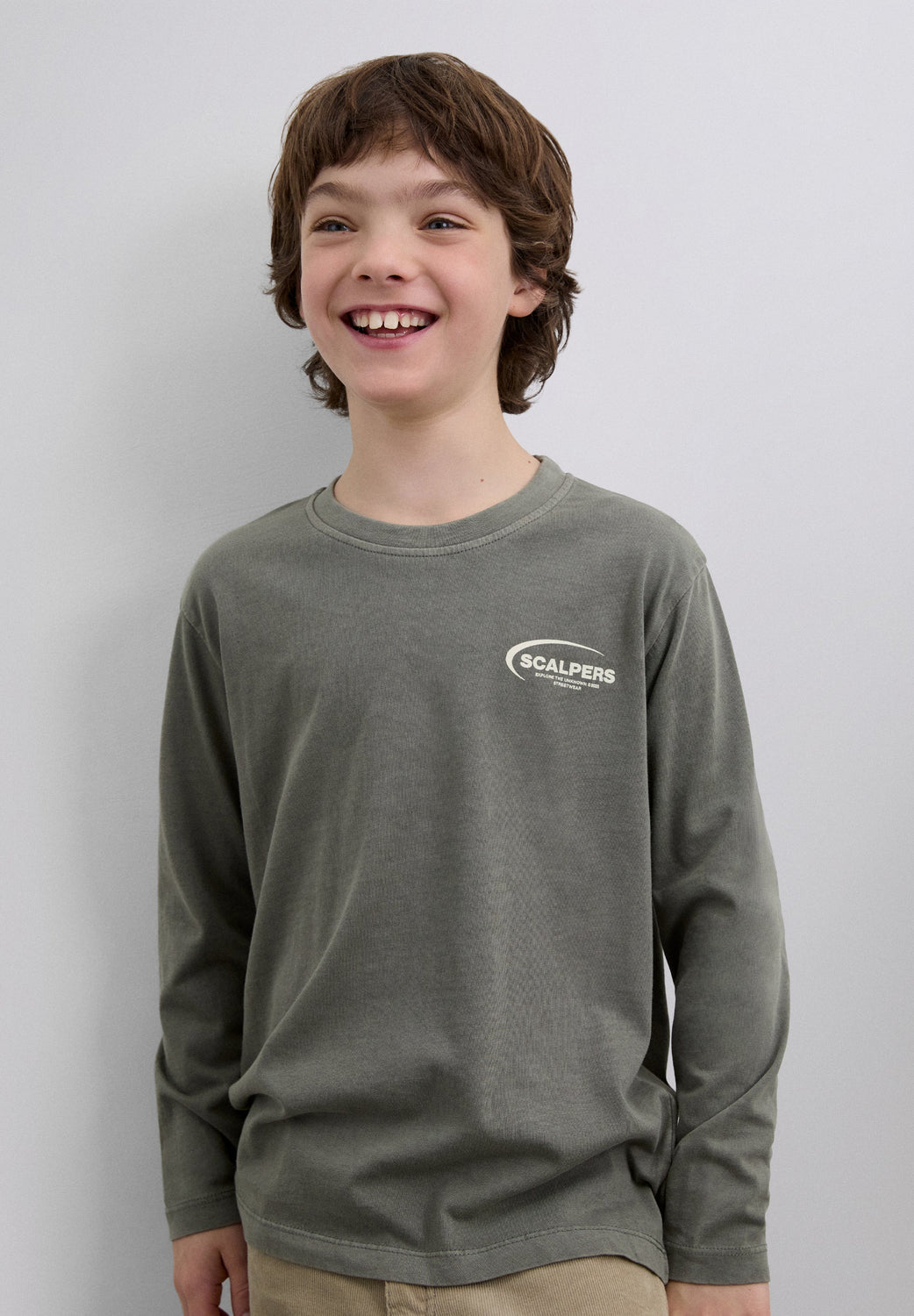 T-shirt de manga comprida com padrão no peito e atrás. Confecionada em 100% algodão BCI. Corte Regular Fit. Decote redondo.