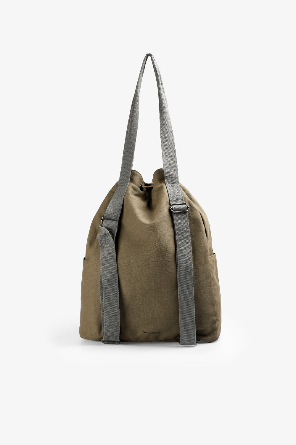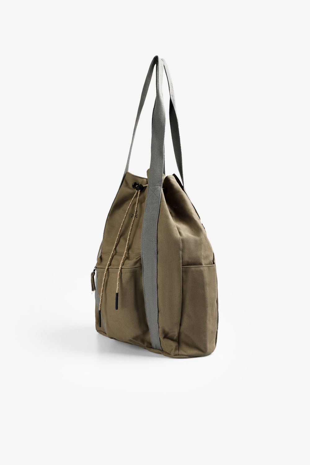 Bolsa confecionada em 100% algodão. Alça dupla. Fecho de correr ajustável, bolso interior e bolso exterior com fole. Pormenor de skull e logótipo em contraste.