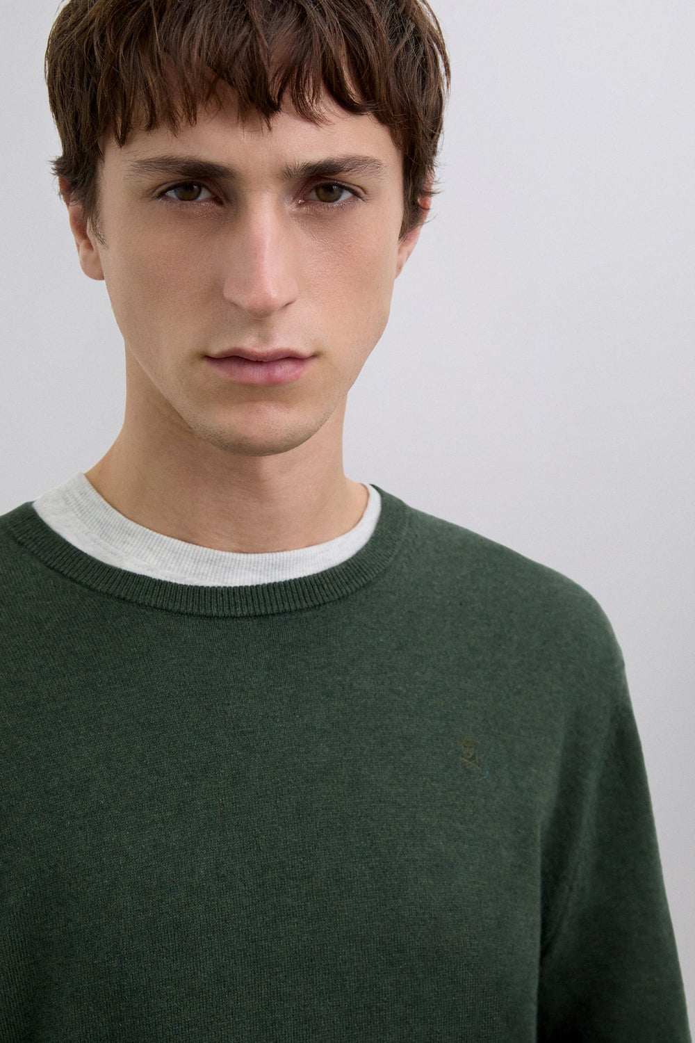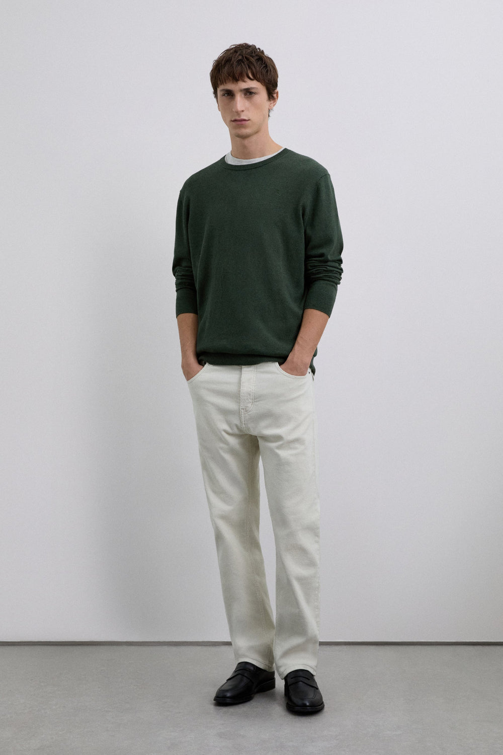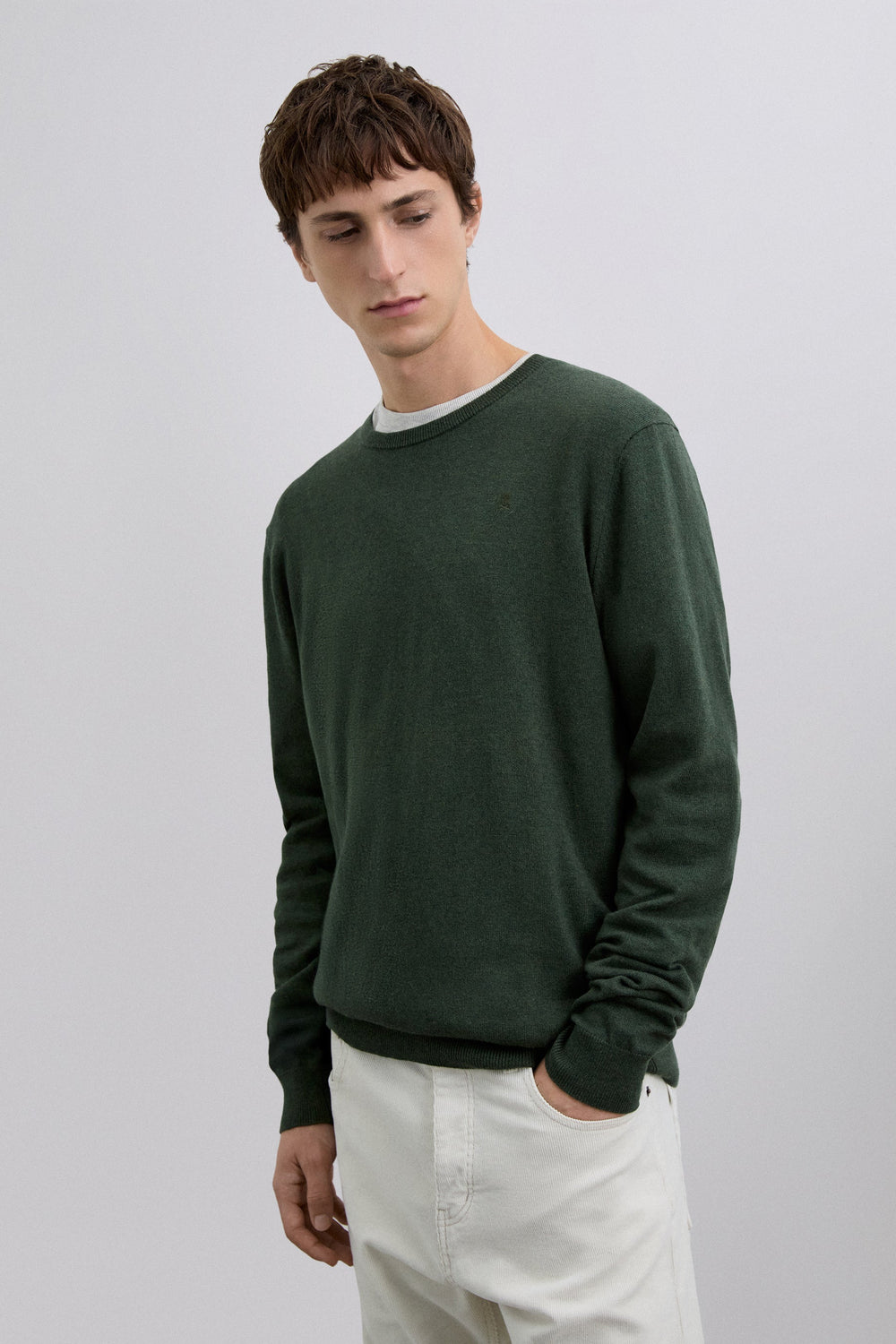 Sweater confecionada em algodão e caxemira. Regular fit. Decote redondo. Manga comprida. Acabamentos em nervuras.
