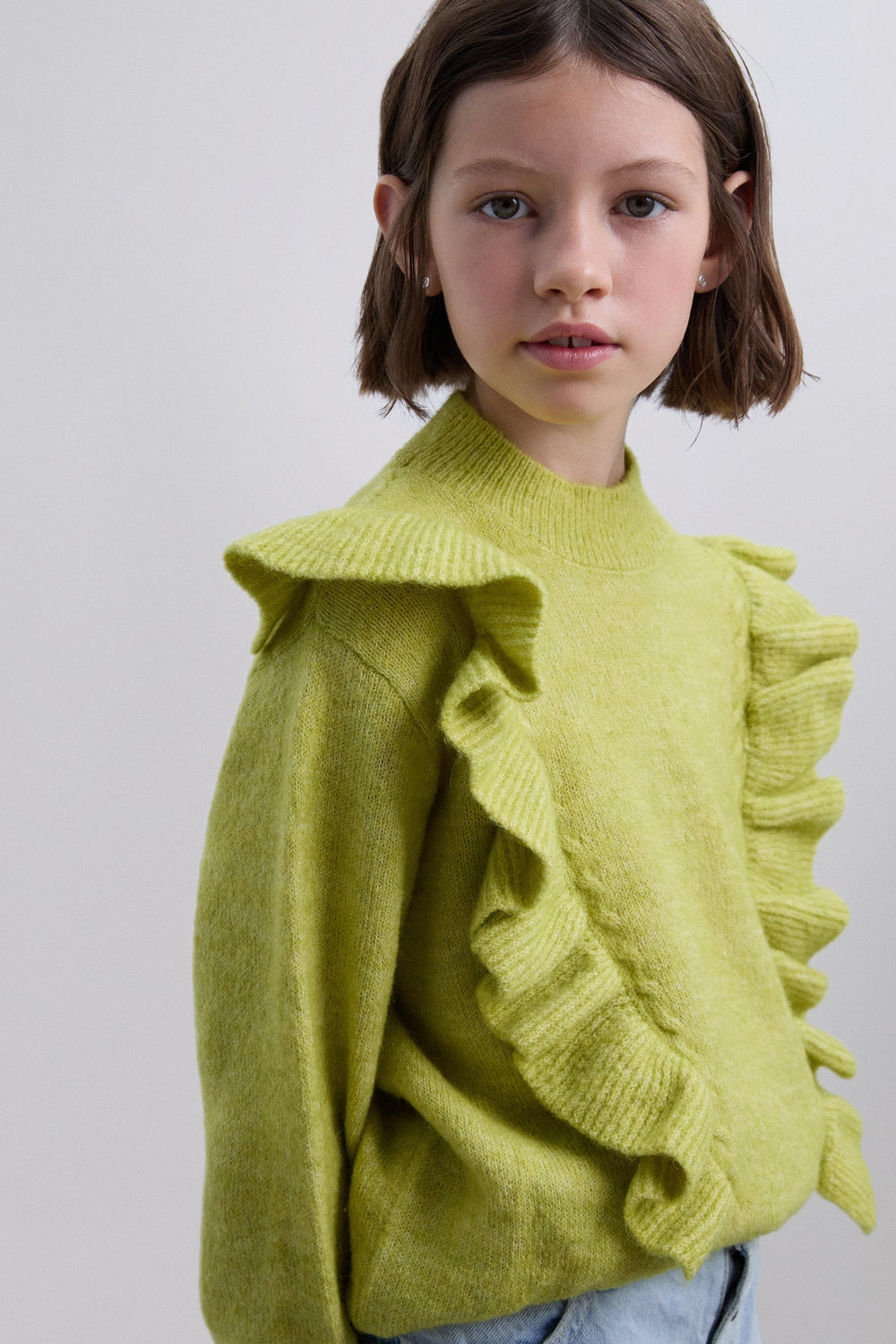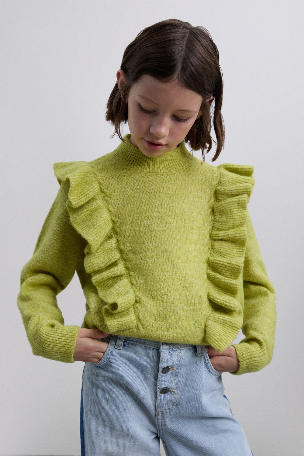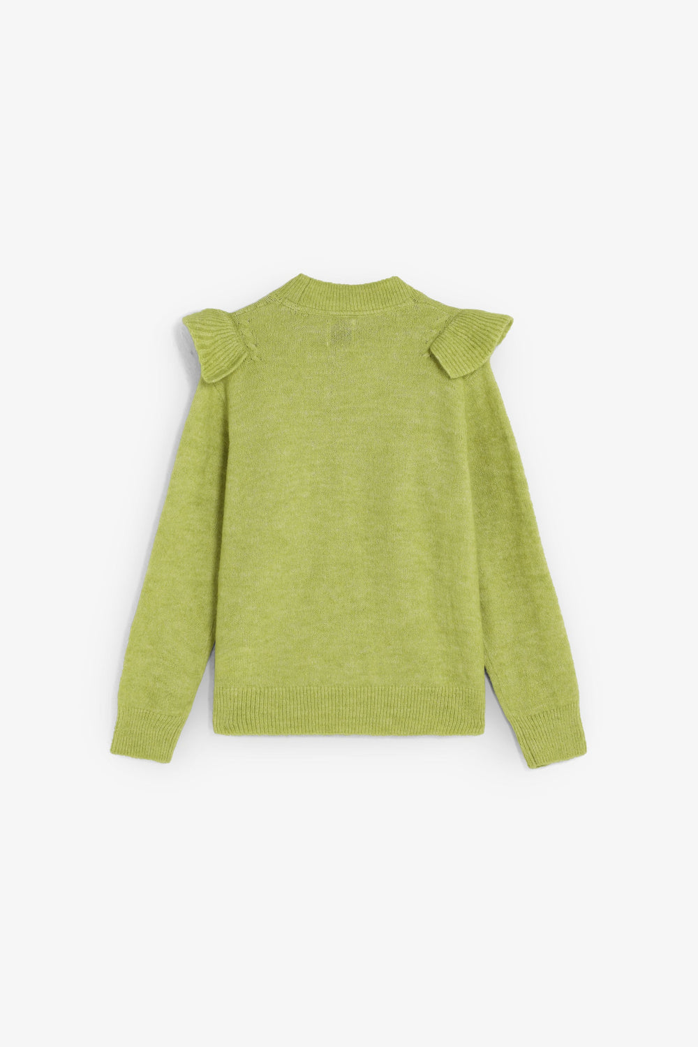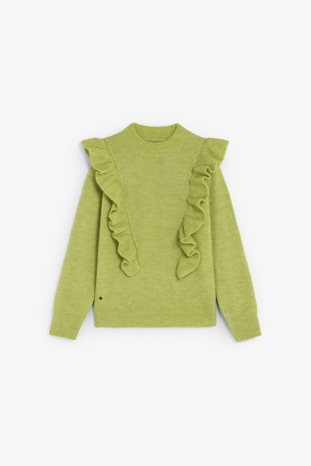 Sweater confecionada em mistura sintética. Manga comprida. Corte regular fit. Gola ligeiramente subida e mangas acabadas em nervuras. Pormenores frontais de folhos.
