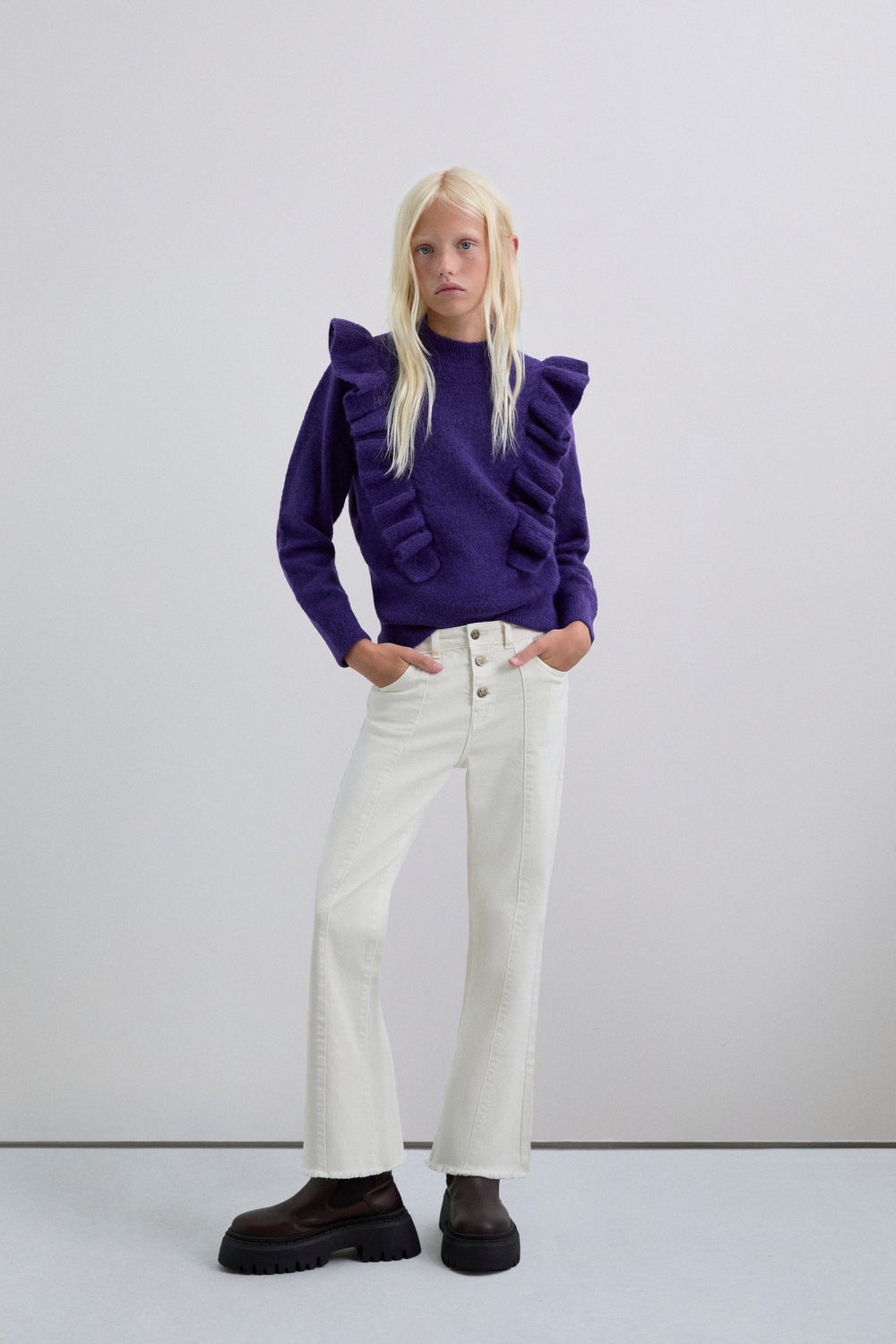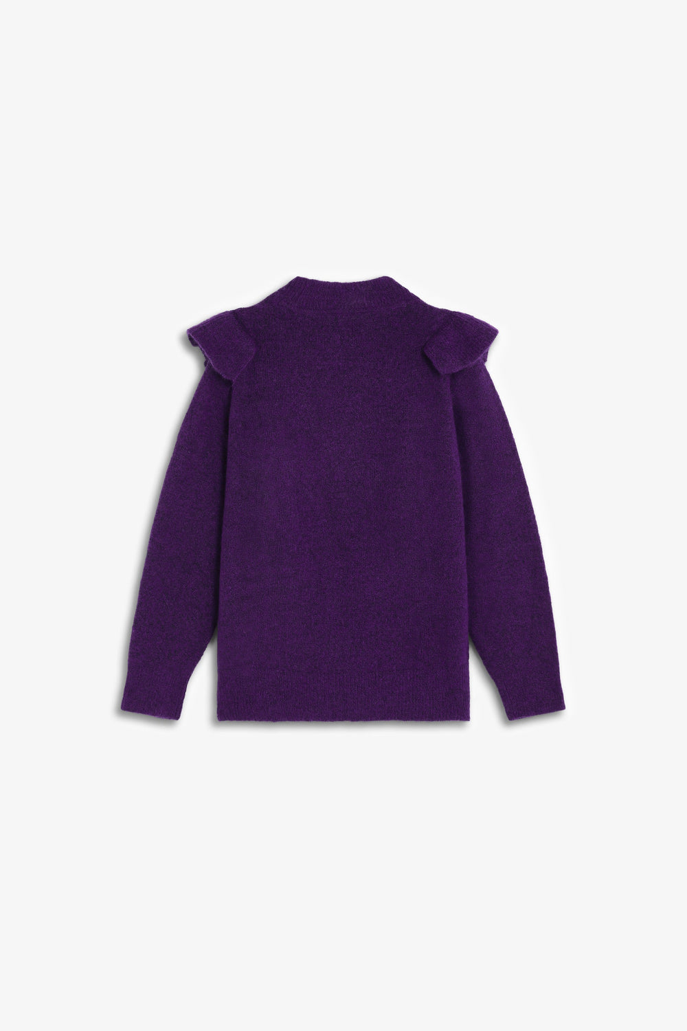 Sweater confecionada em mistura sintética. Manga comprida. Corte regular fit. Gola ligeiramente subida e mangas acabadas em nervuras. Pormenores frontais de folhos.