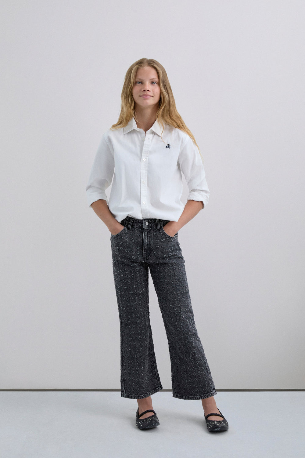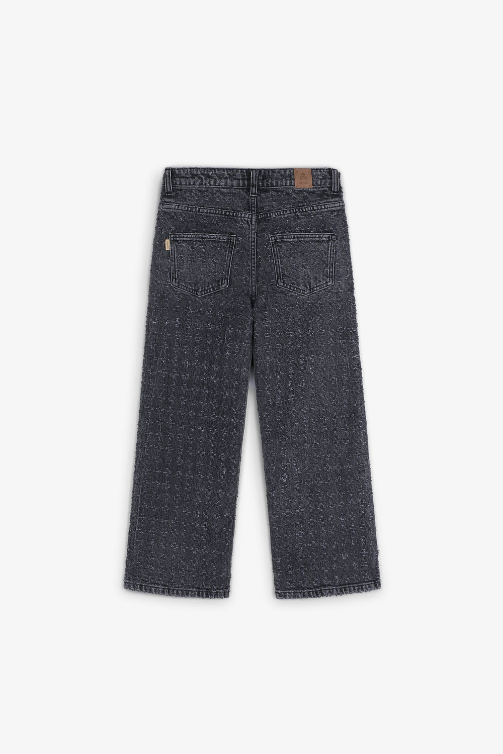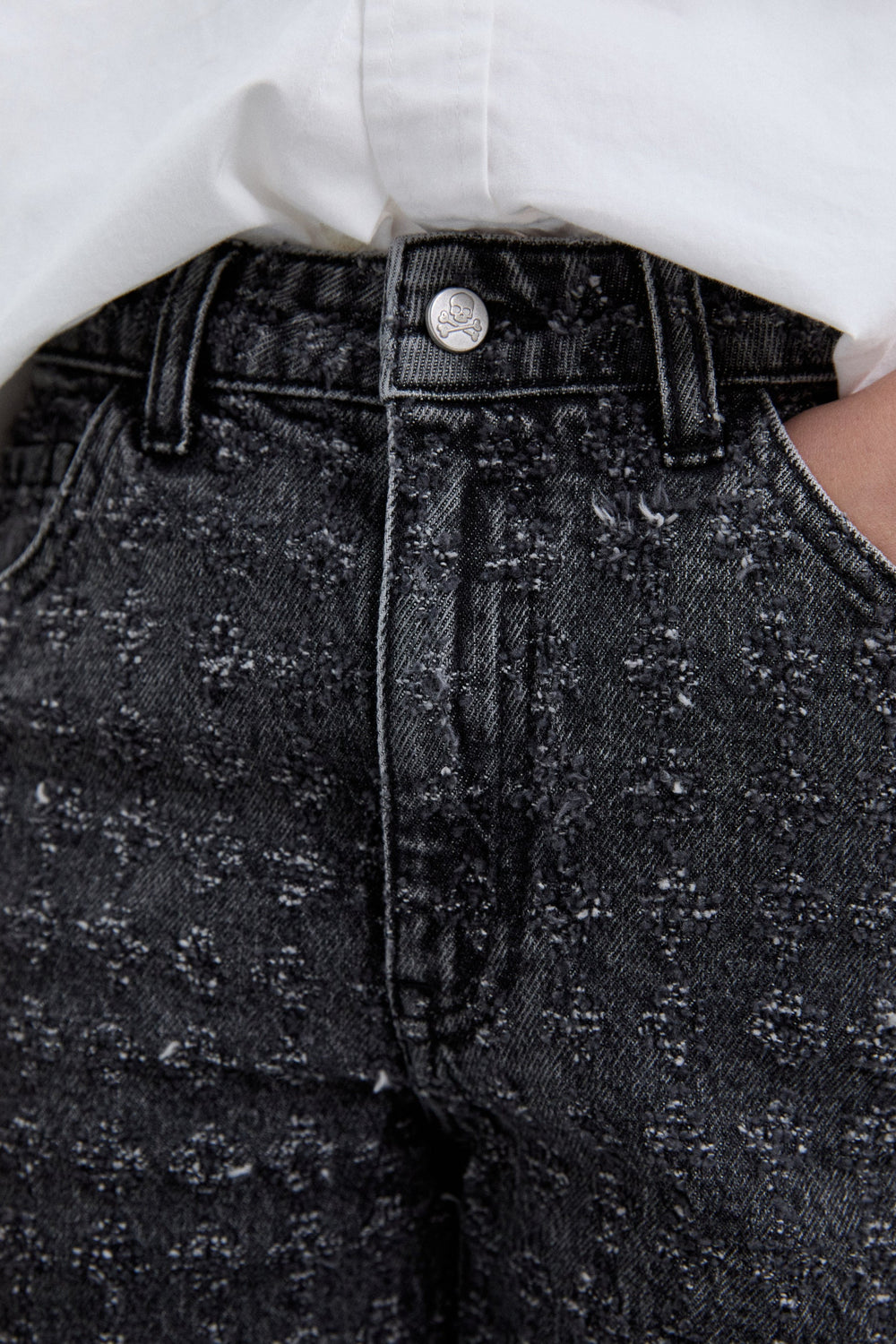 Jeans confecionados em algodão ligeiramente elástico com estampado de fio metalizado feito a laser. Corte flaire, fecho com fecho de correr e botão e presilhas na cintura. Bolsos laterais e atrás.