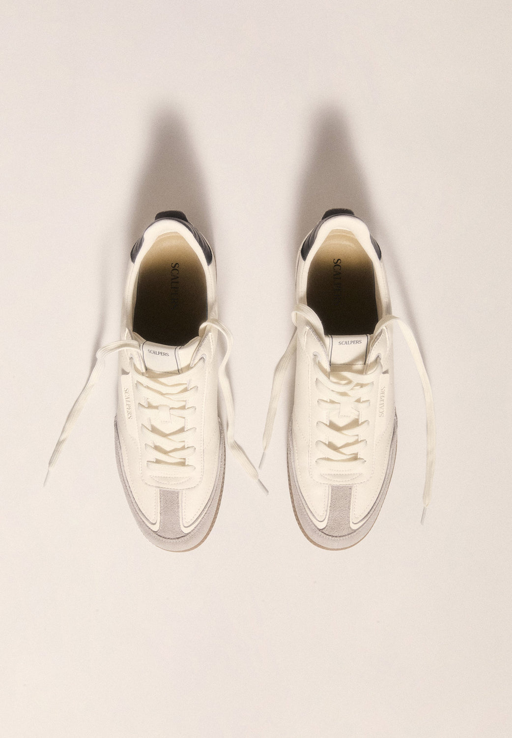 Sapatilhas de estilo rétro confecionadas em pele de napa e camurça bovina. Biqueira reforçada em croute. Contraforte do calcanhar em contraste. Sola de caucho em contraste. Logótipo gravado no calcanhar e na lateral.